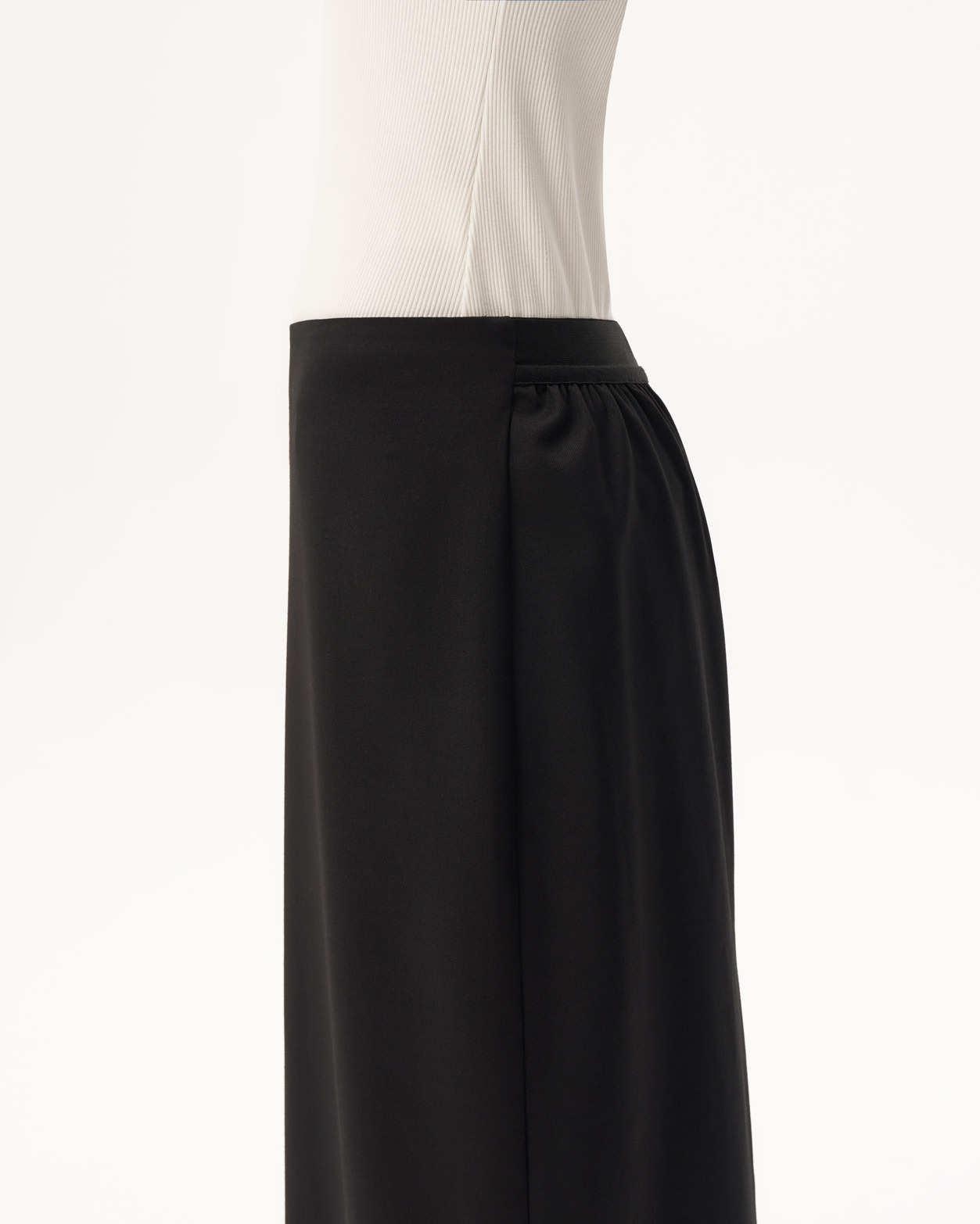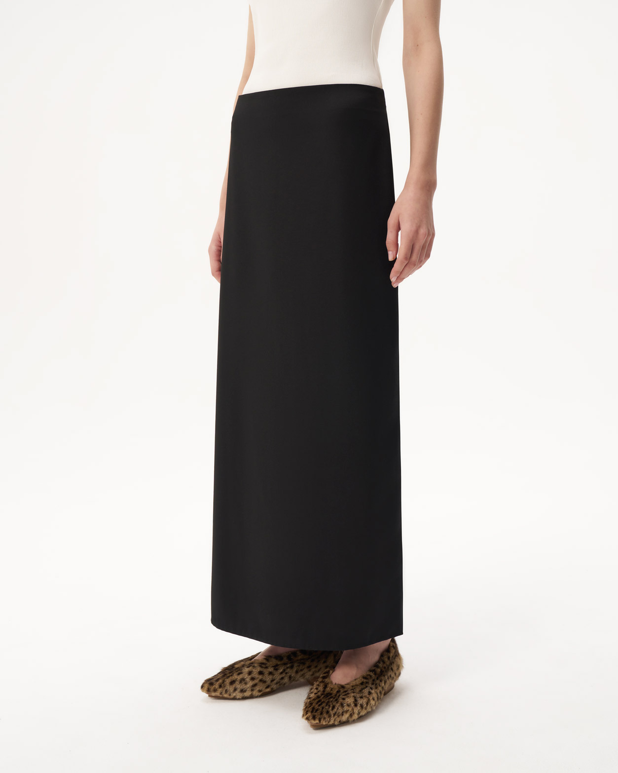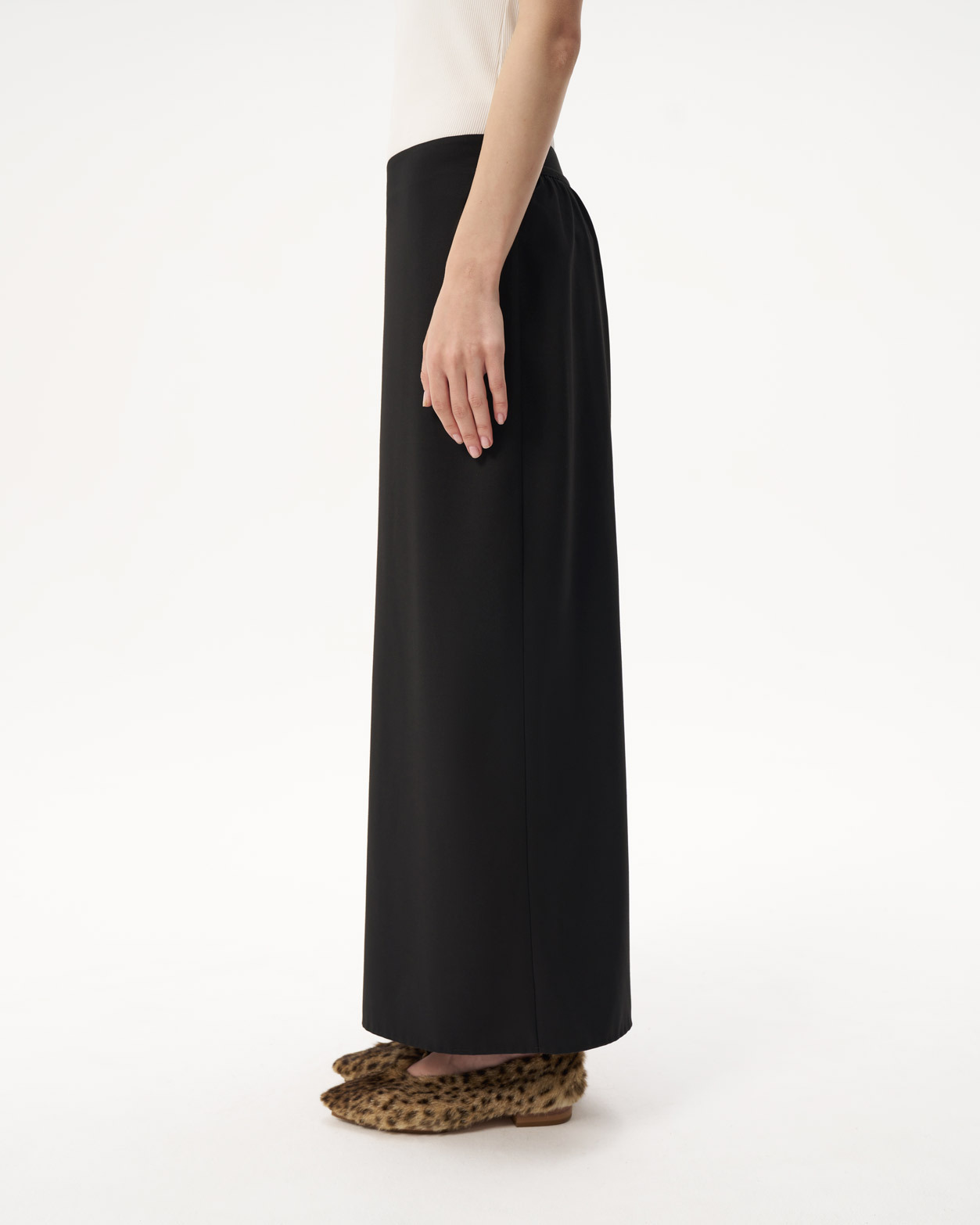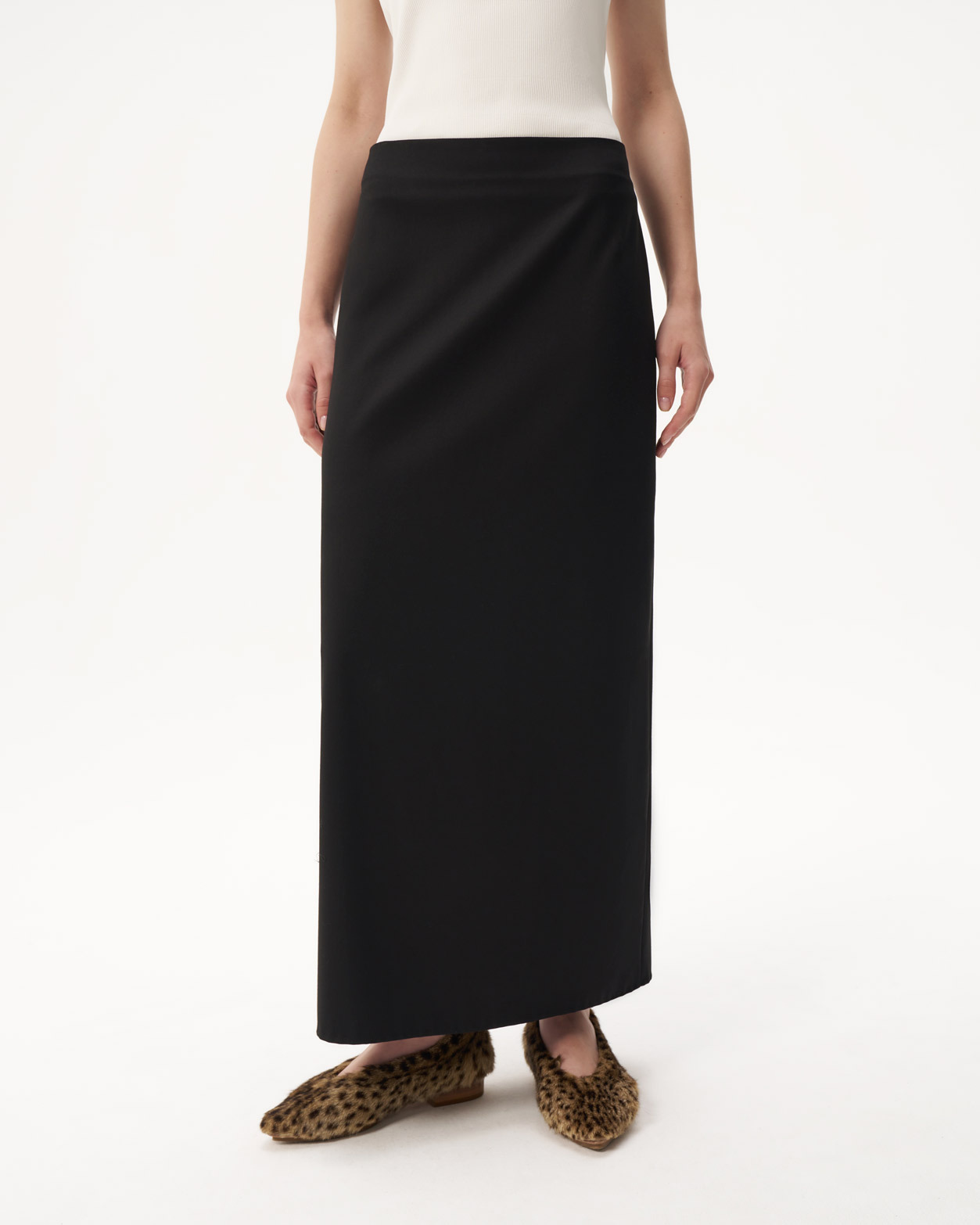 Юбка удлиненная, прямого силуэта из костюмной ткани черного цвета. Пояс спинки на резинке. На заднем полотнище высокая молния и шлица.