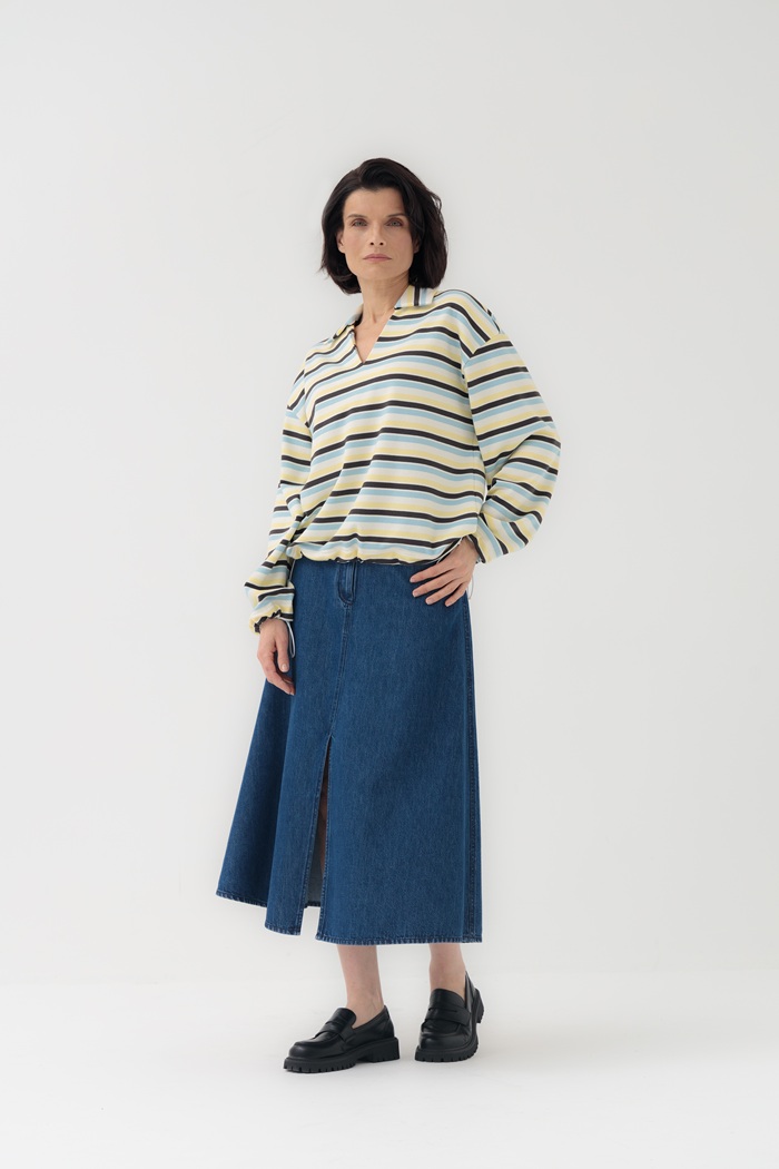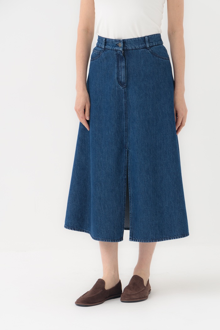 Юбка выполнена из плотного денима из натурального хлопка не вытягивается и отличается износоустойчивостью. Юбка А-силуэта, длина миди, разрез спереди не сковывает движения при ходьбе. Сзади кокетка и резинка по талии для комфортной посадки. Застегивается на молнию и болт. Такую юбку можно стилизовать для более строгих офисных образов или сочетать со спортивными вещами.