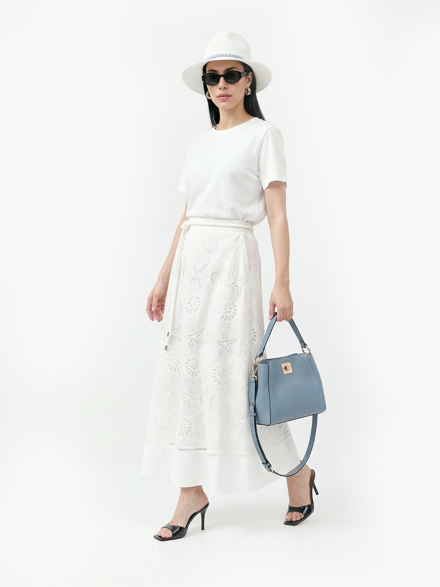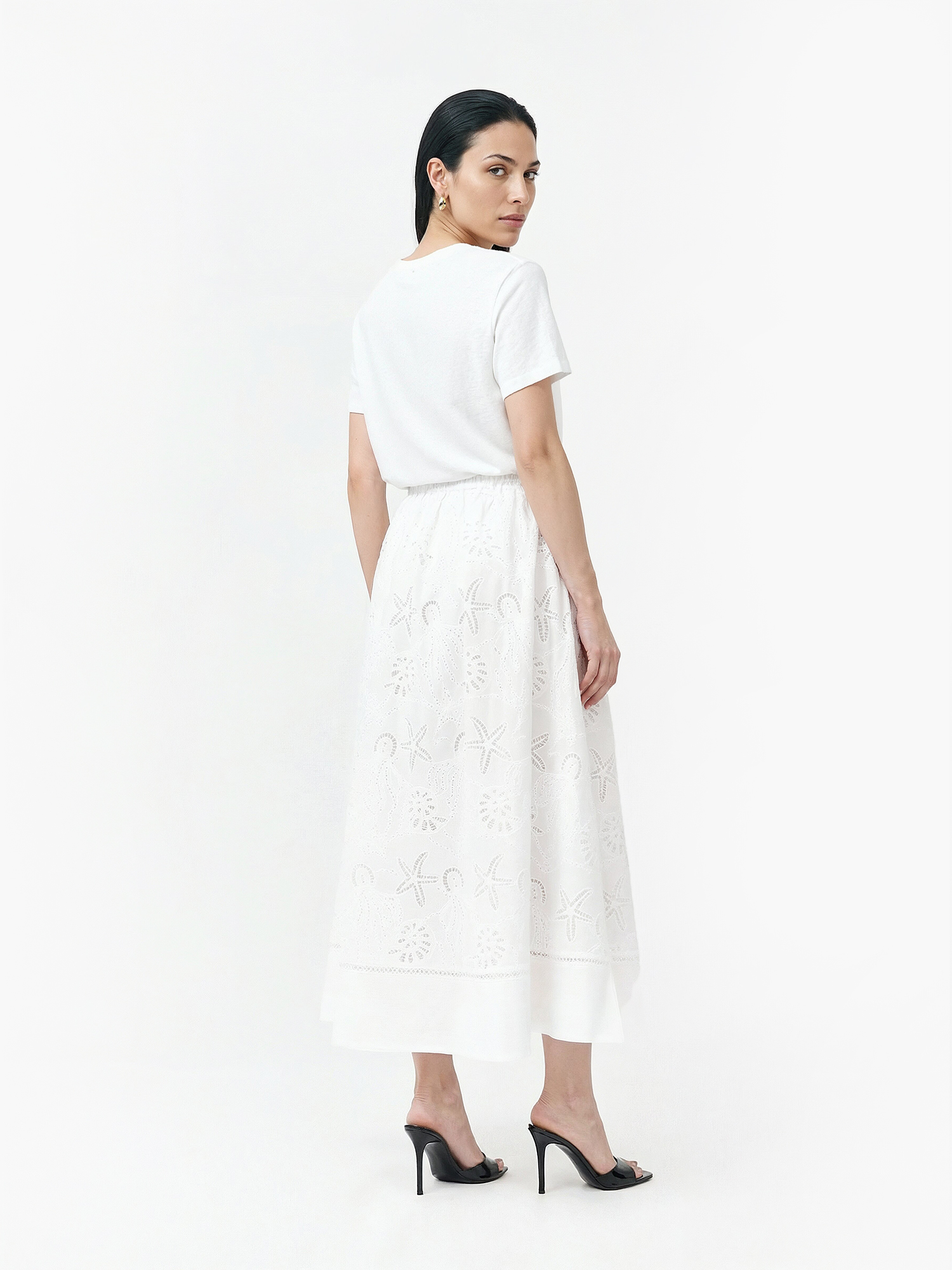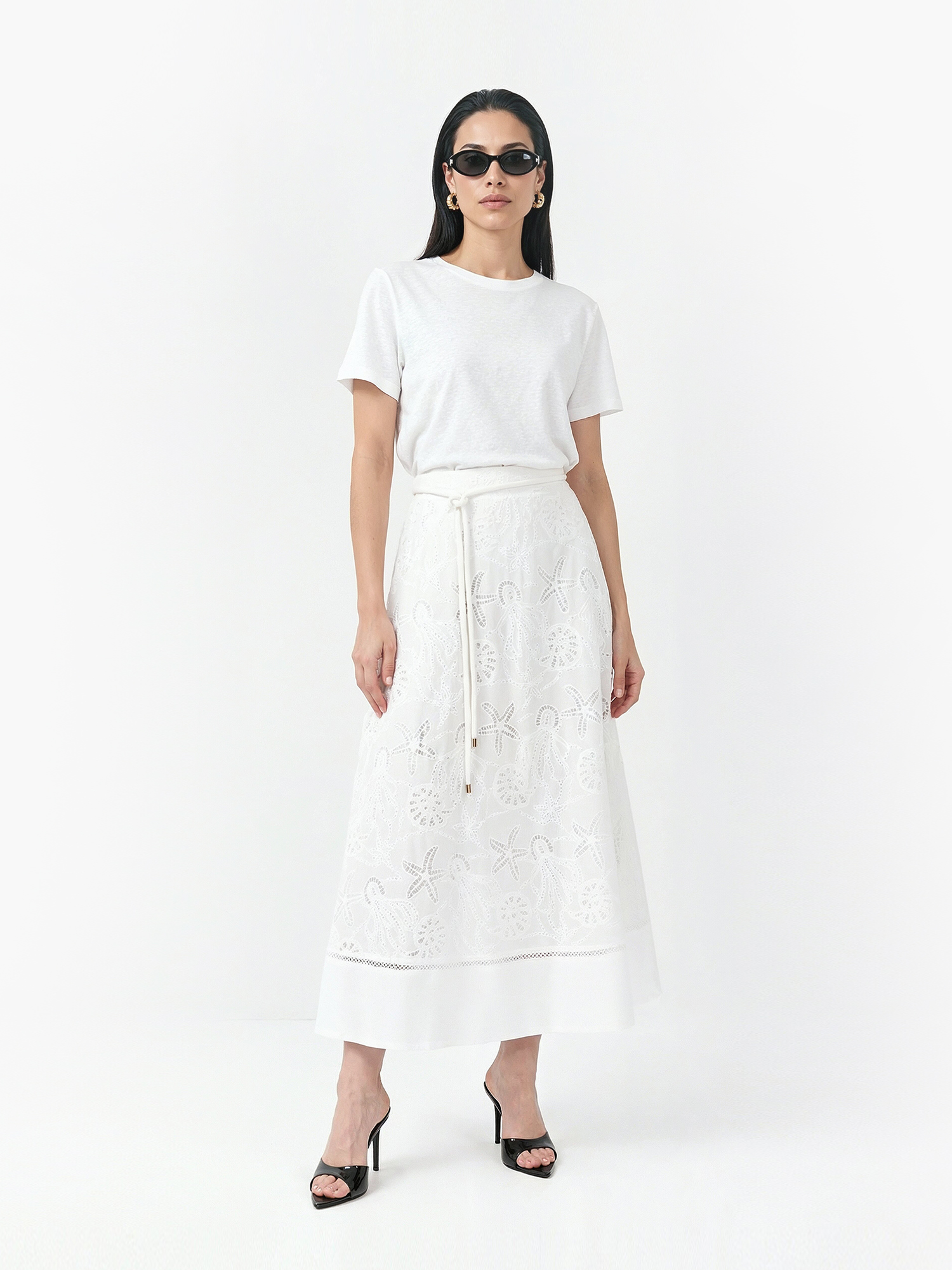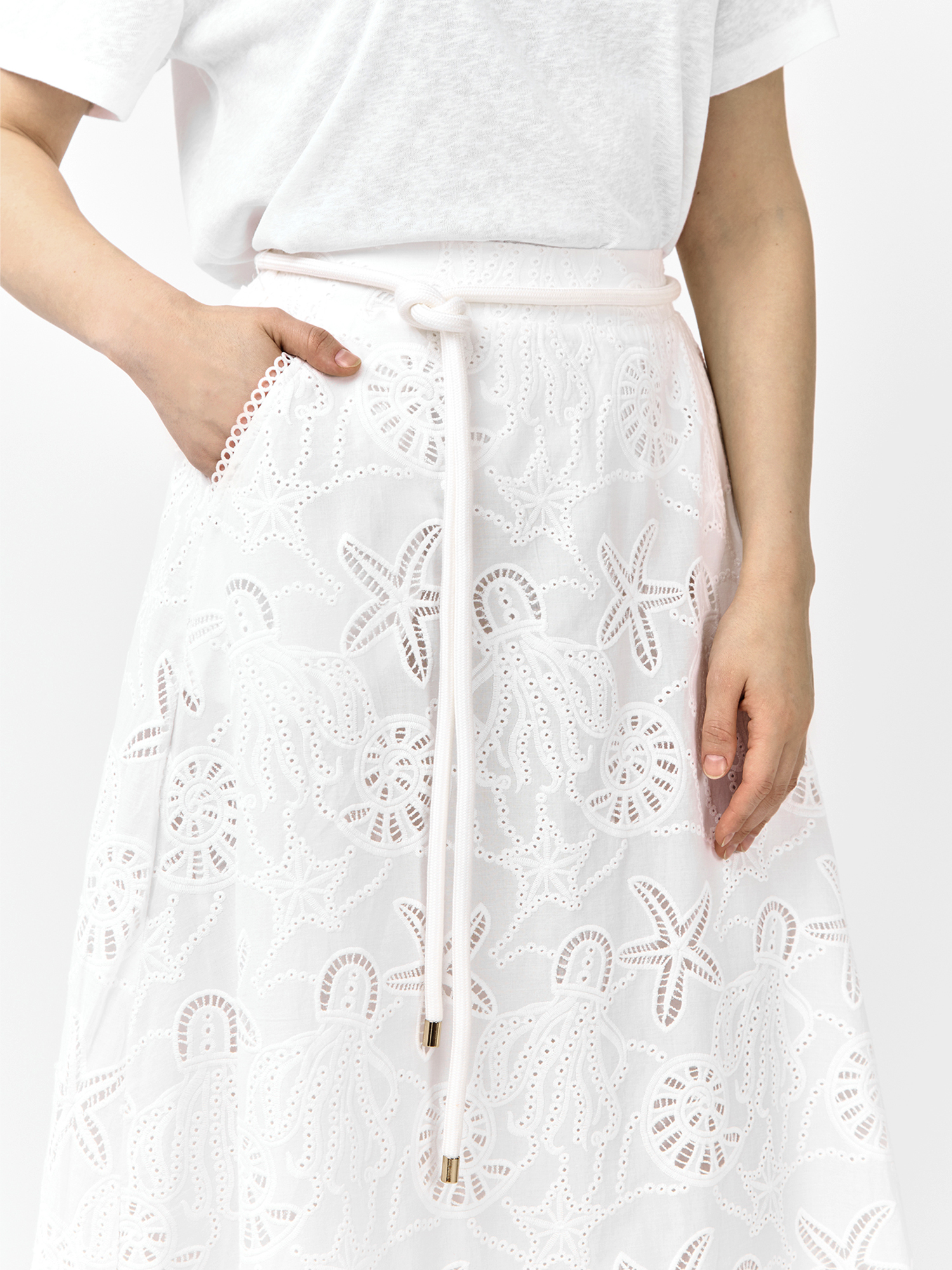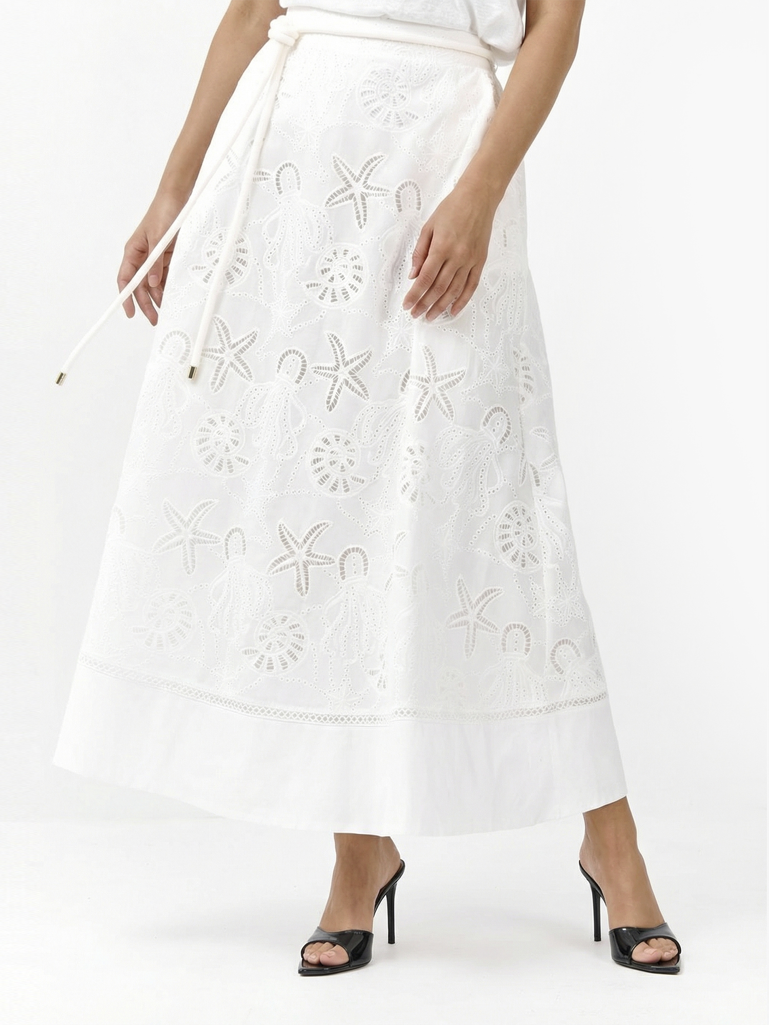 Легкая летняя длинная юбка от итальянского бренда FABRETTI белого цвета прекрасно подходит для пляжного отдыха и необычных городских образов. Юбка с А-силуэтом дополнена легкой однотонной подкладкой, притачной пояс собран сзади на резинку, по бокам врезные карманы. На поясе декоративный пояс-шнурок в шлевках.Хлопковая ткань украшена интересными вышитыми узорами в виде обитателей моря – морских звезд, ракушек, медуз. Вышивка эксклюзивно разработана для FABRETTI.Эта модель поможет создать запоминающийся образ в морском или круизном стиле, если дополнить ее одеждой синего цвета, тонкой полоской и ярко-красным акцентным аксессуаром. Также хорошо подойдут аксессуары из соломки.