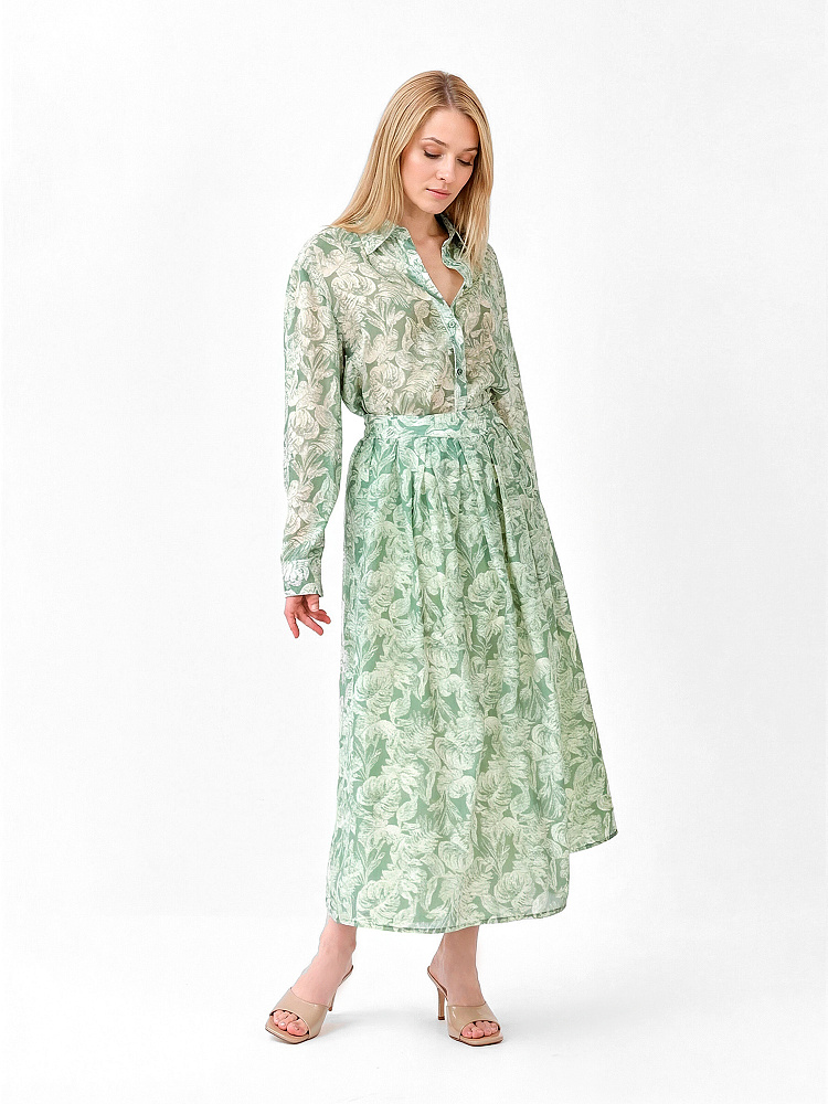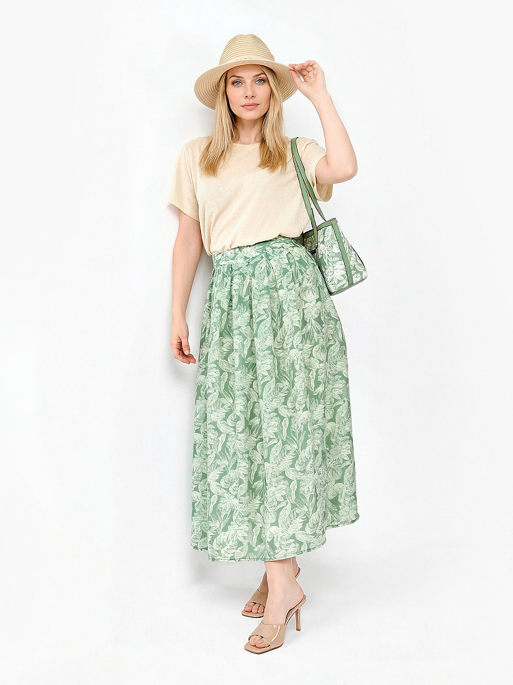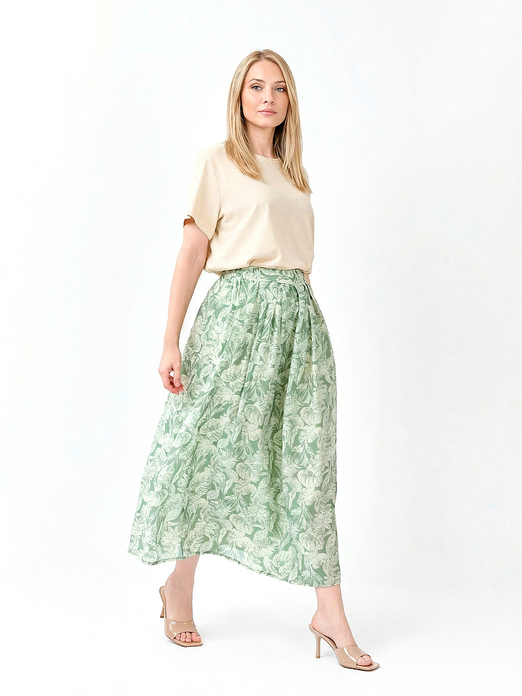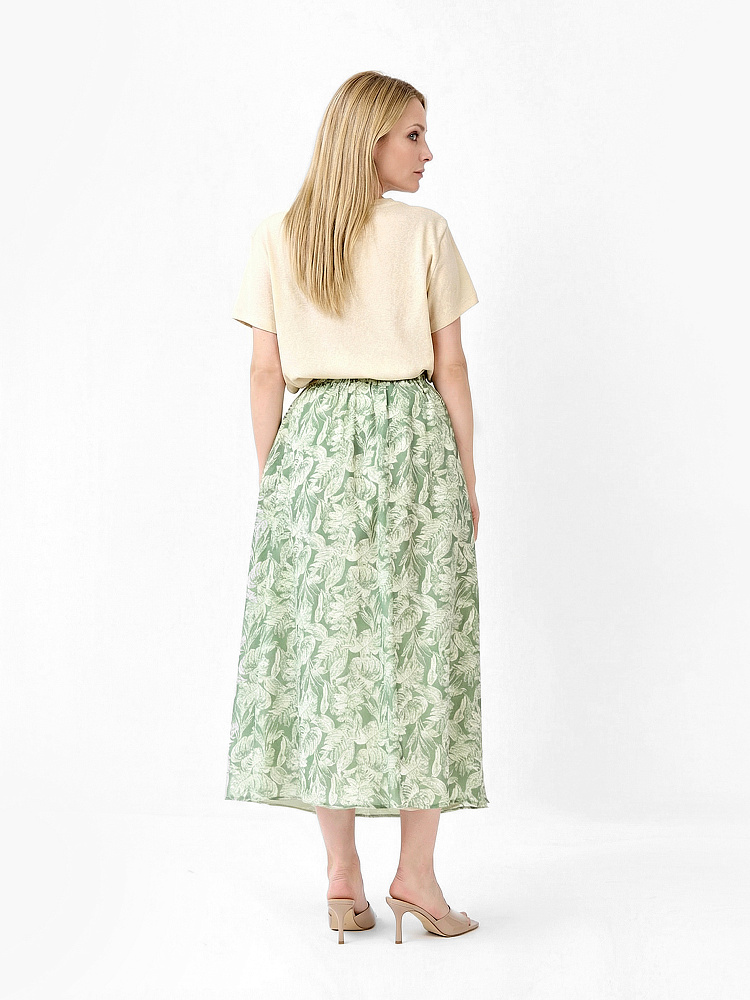 Длинная летняя юбка итальянского бренда FABRETTI в мягком шалфейно-зеленом оттенке с узором из белых листьев.У юбки А-силуэт, легкий и свободный. Притачной пояс собран на резинку. Модель дополнена светлой однотонной подкладкой.Растительный принт на ткани придает образу легкость; легкая полупрозрачная ткань прекрасно смотрится в движении и на ветру.Шалфейный цвет – летний тренд, который отлично подходит к загорелой коже и сочетается с большинством «природных» тонов в одежде, популярных в теплый сезон.