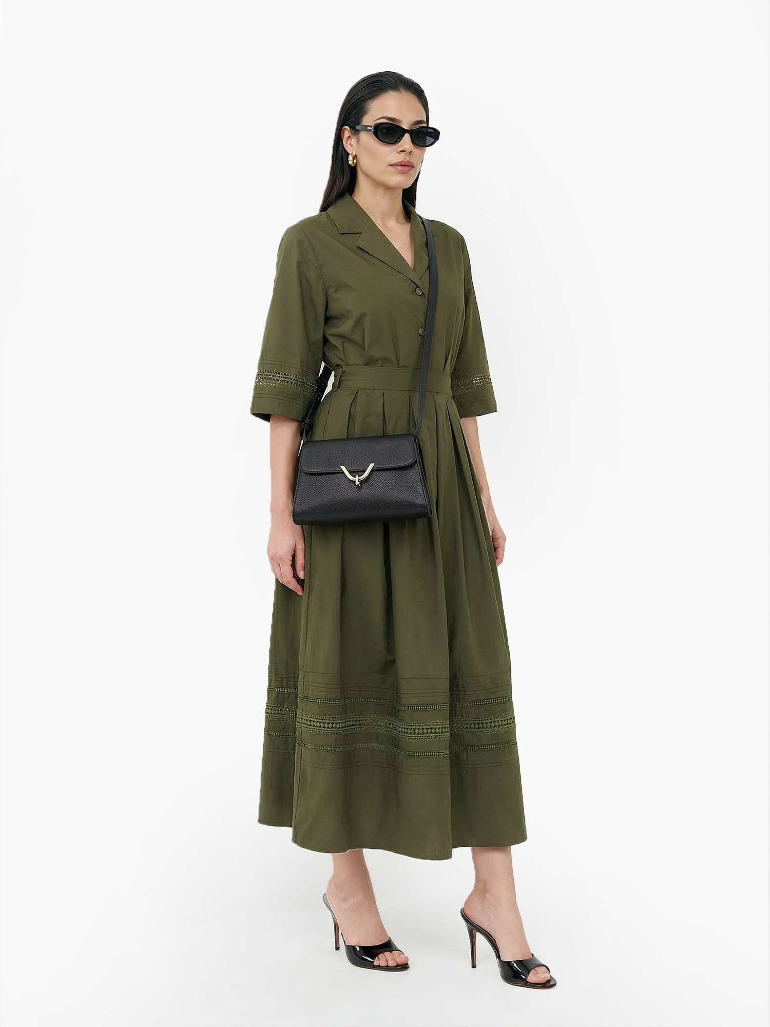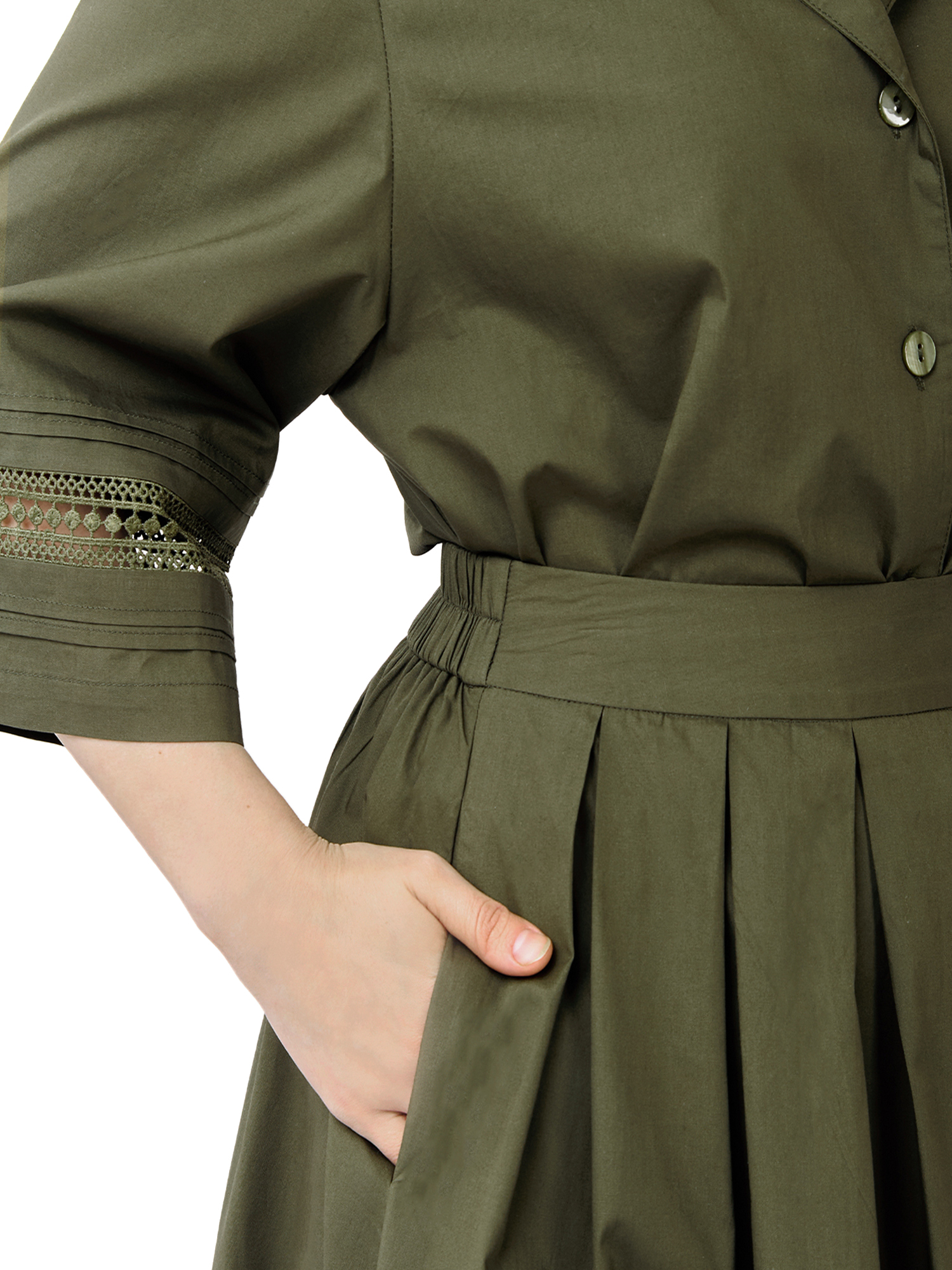 Длинная летняя юбка от итальянского бренда FABRETTI цвета хаки с интересной отделкой ажурными вставками.Она выполнена из натурального дышащего хлопка, который хорошо пропускает воздух и долго сохраняет свою форму и цвет.У модели свободный А-силуэт, который формируют широкие бантовые складки на лицевой стороне, спинка дополнена сборкой на резинку в поясе и обеспечивает максимально комфортную посадку для любого типа фигуры. В нижней трети сделана широкая вставка, которая помогает модели держать форму и добавляет модели утонченной элегантности.Длинная юбка – классическая модель для жаркого сезона. Она гармонично сочетается с любым верхом и позволяет создавать образы в разных стилях.