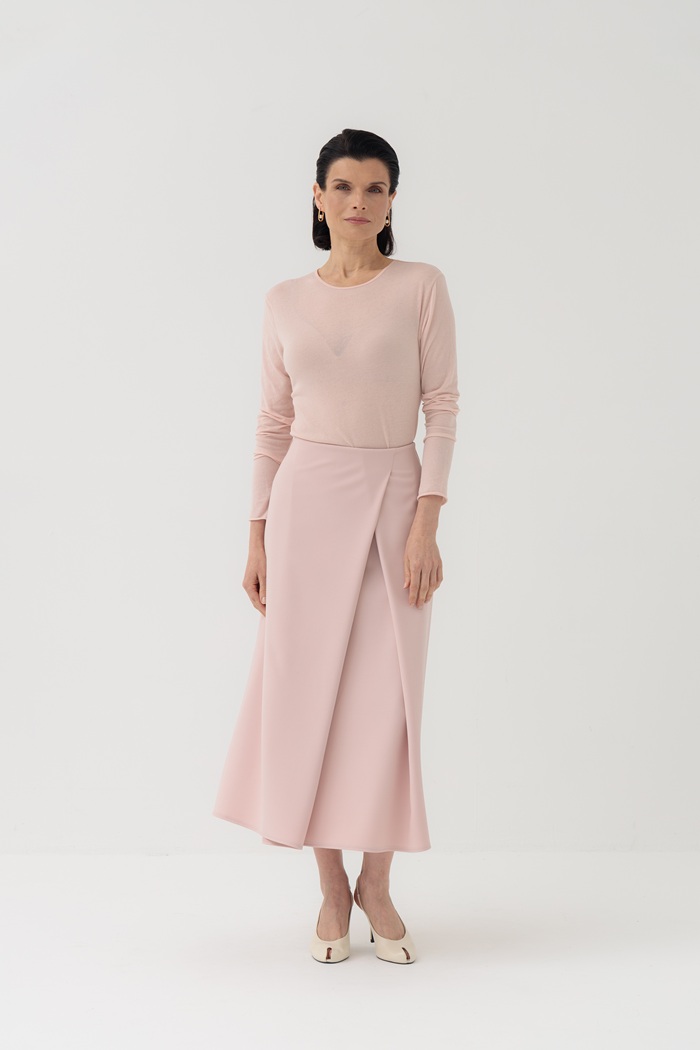Длинная юбка нежно-розового цвета А-силуэта придаст образу романтичности. Изюминкой модели является асимметричная встречная складка спереди.