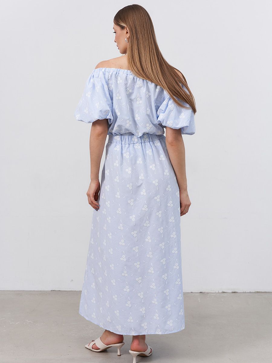 – легкая хлопковая ткань с принтом– расклешенный силуэт– мягкие складки от пояса– высокая посадка– длина миди– подчеркивает линию талии– создает легкий и женственный образ– легко сочетается с топами, блузами и рубашками