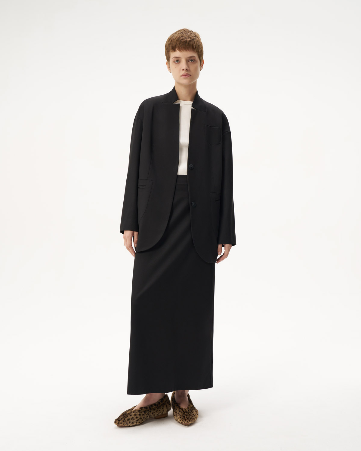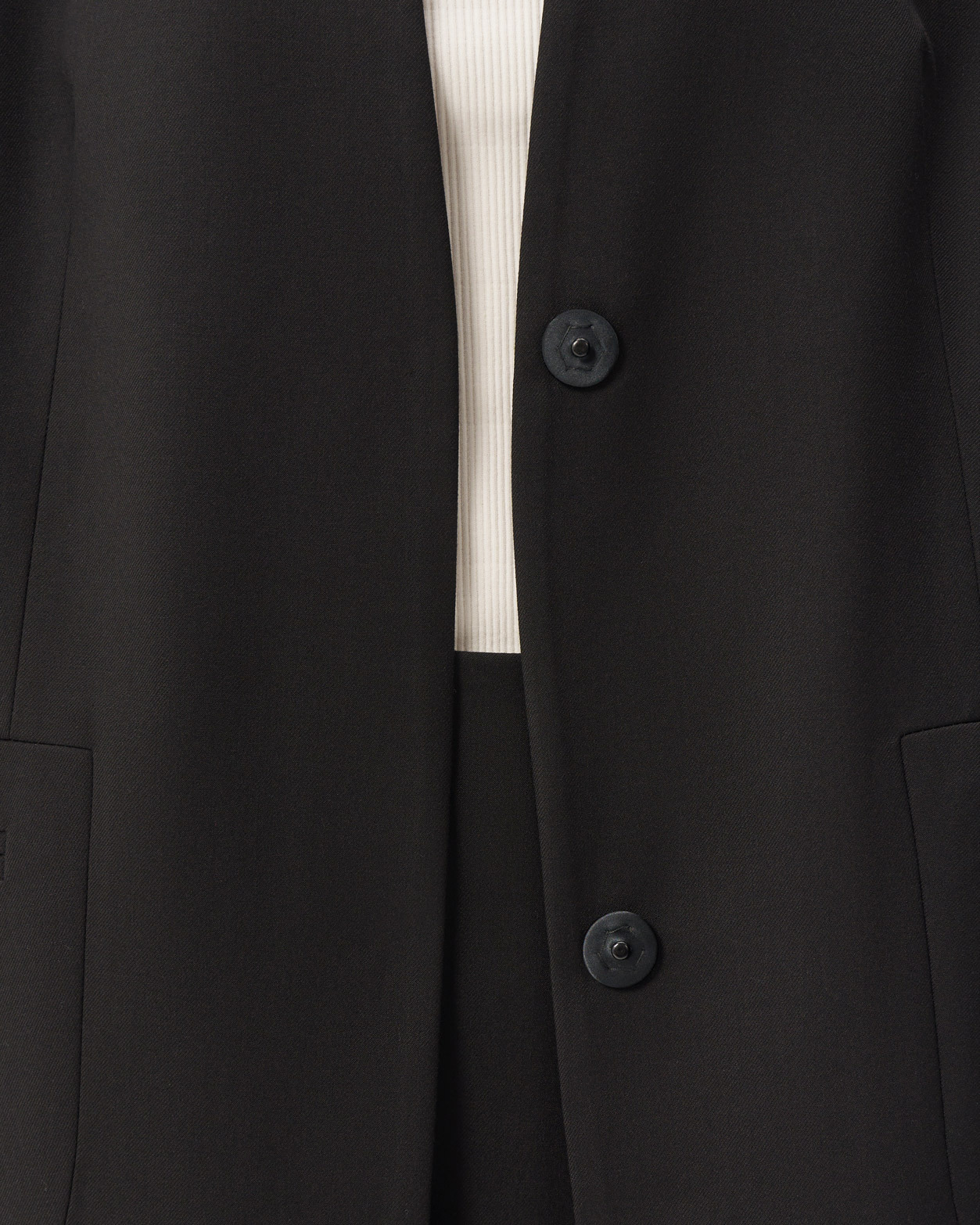 Детали: перенесенный плечевой шов на спинку, врезанные карманы переда, лацканы и воротник без отворотов, шлица по низу спинки.