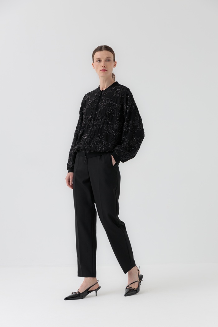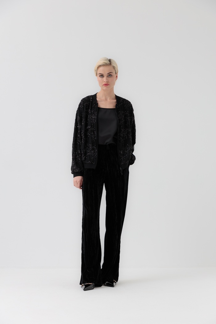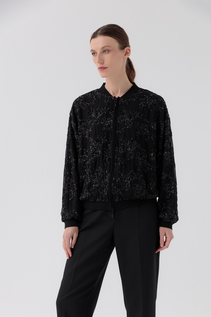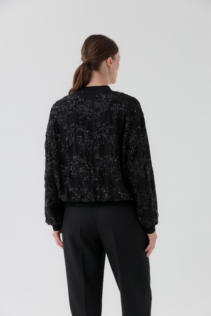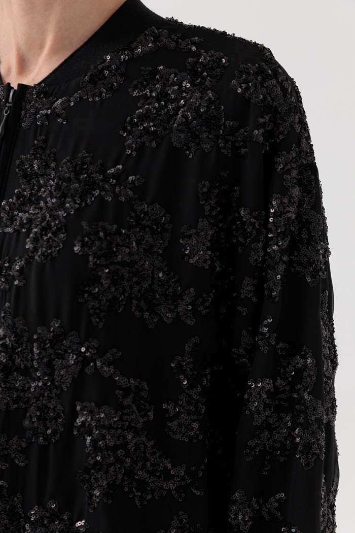 Свободный бомбер из черного шифона, расшитого пайетками. Бомбер на подкладке.