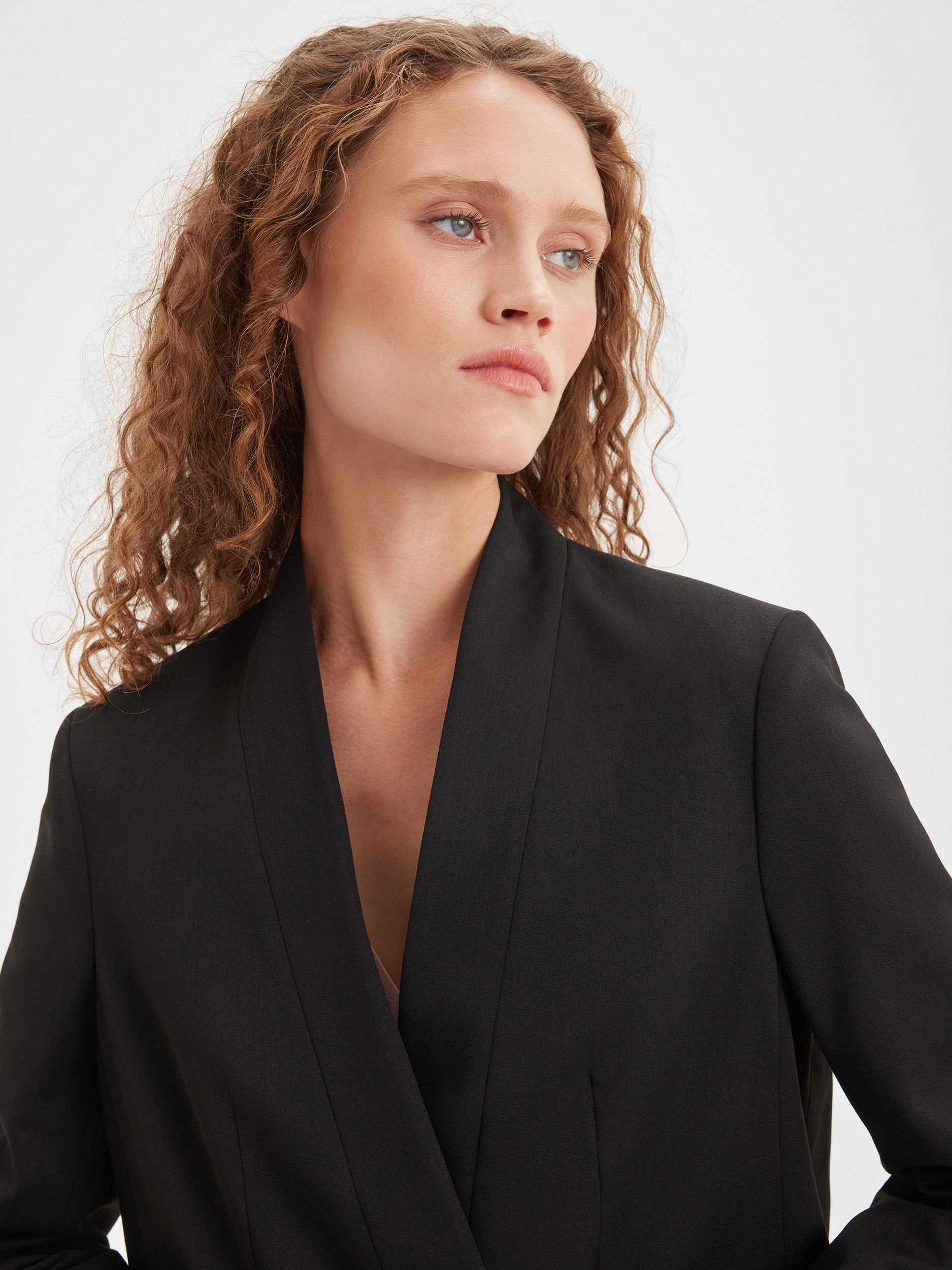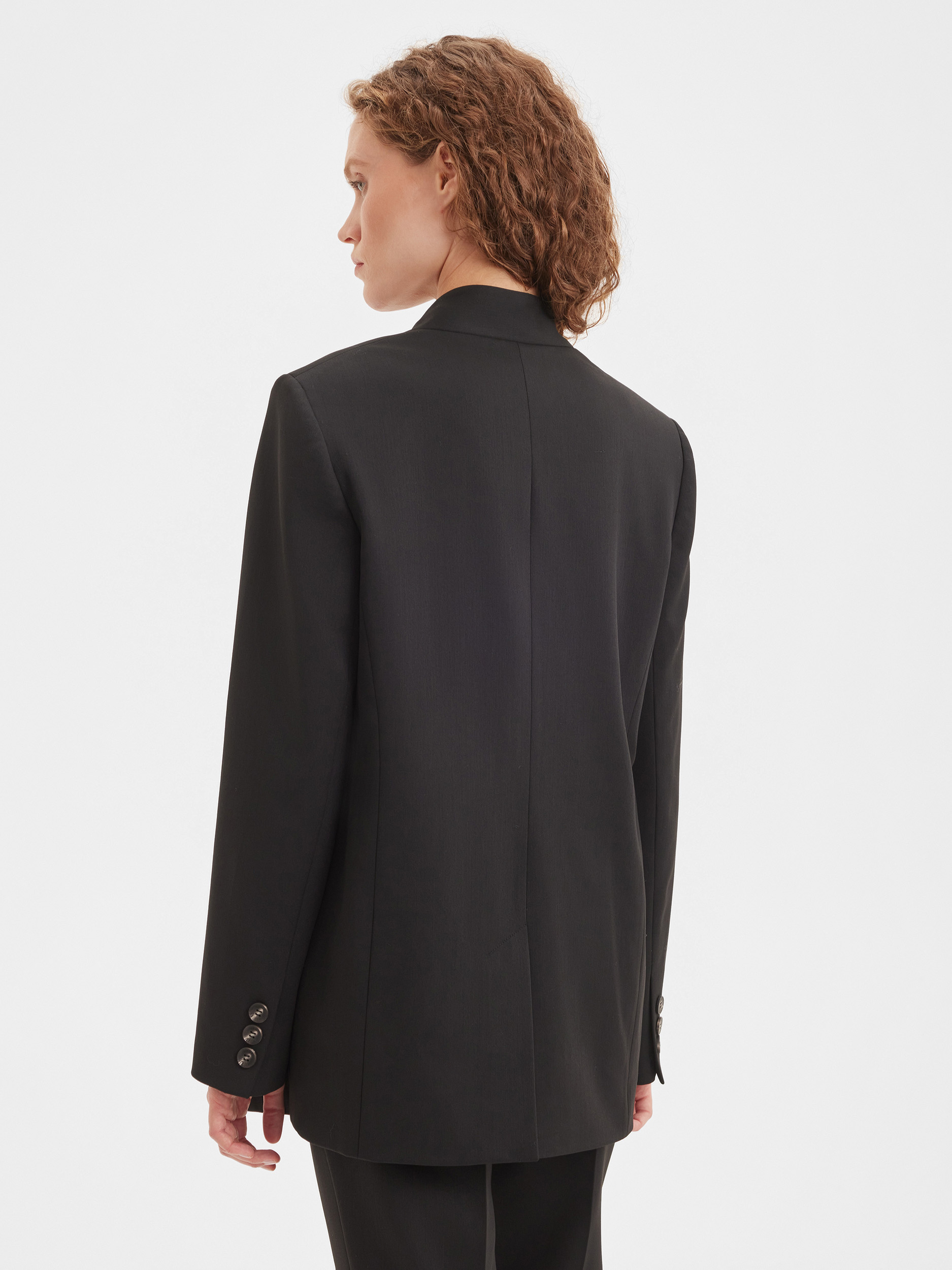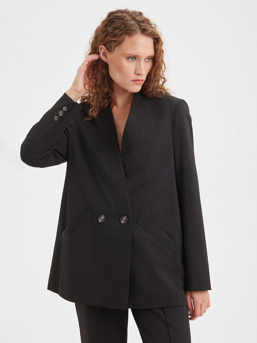 Чёрный цвет жакета не оставит его обладательницу без внимания, а акцентные пуговицы на рукавах по диагональному срезу заметят те, кто ценит детали. Жакет прекрасно сочетается как с юбкой, так и с джинсами