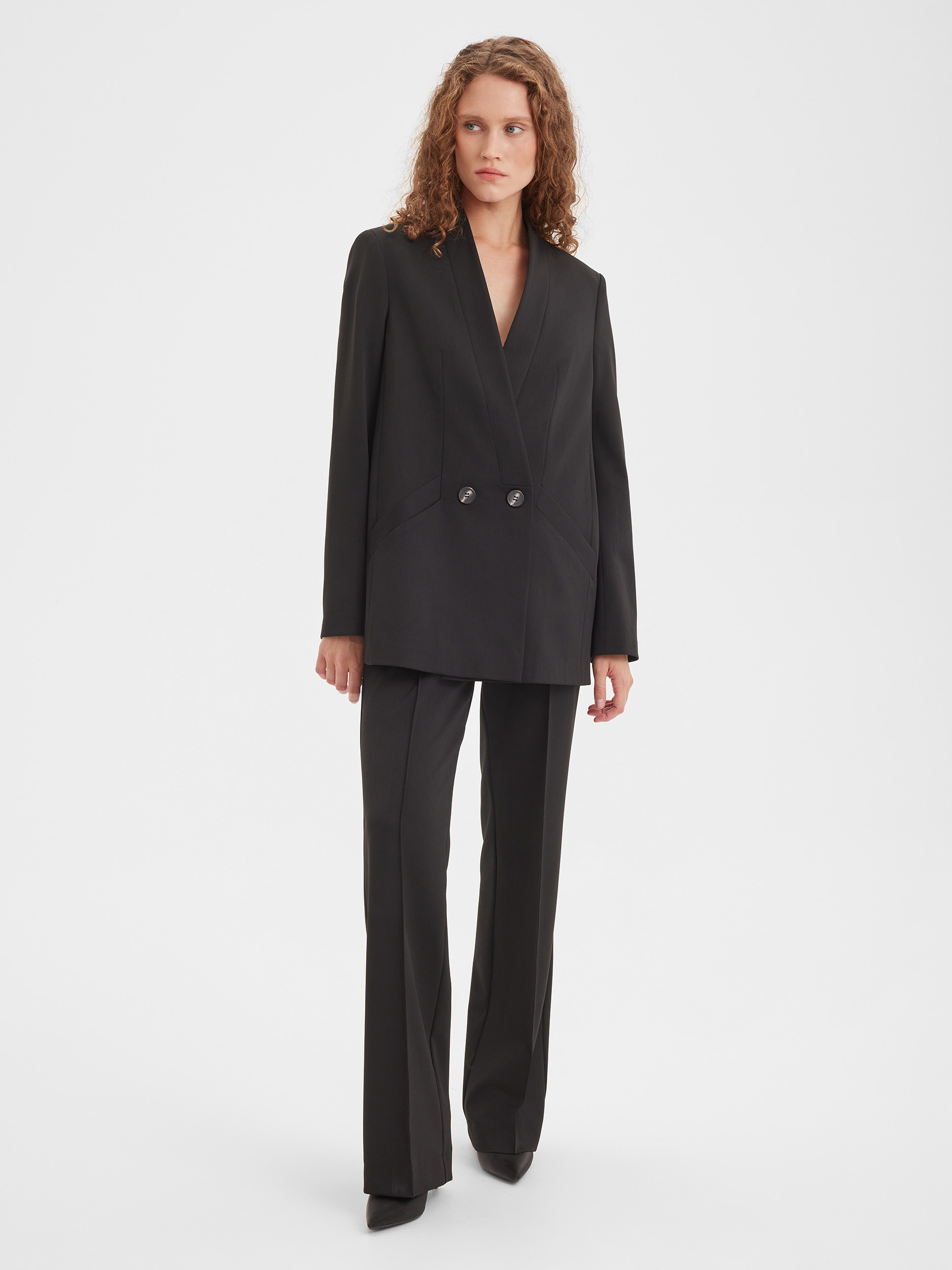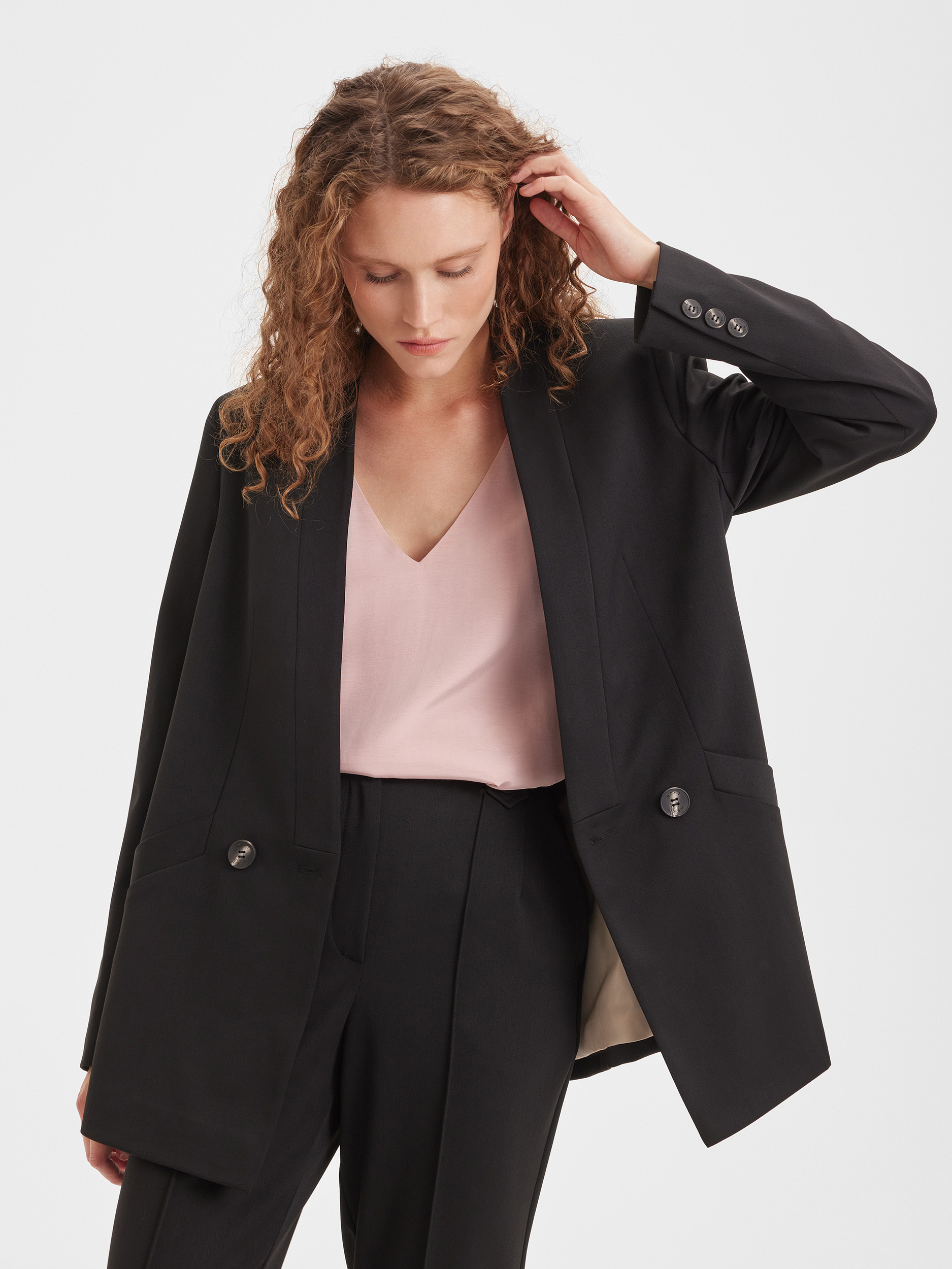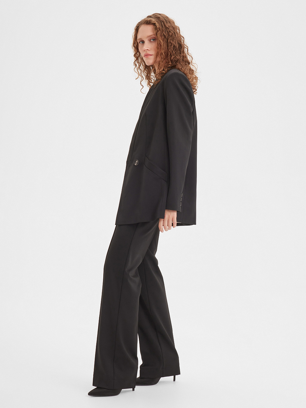 Чёрный цвет жакета не оставит его обладательницу без внимания, а акцентные пуговицы на рукавах по диагональному срезу заметят те, кто ценит детали. Жакет прекрасно сочетается как с юбкой, так и с джинсами