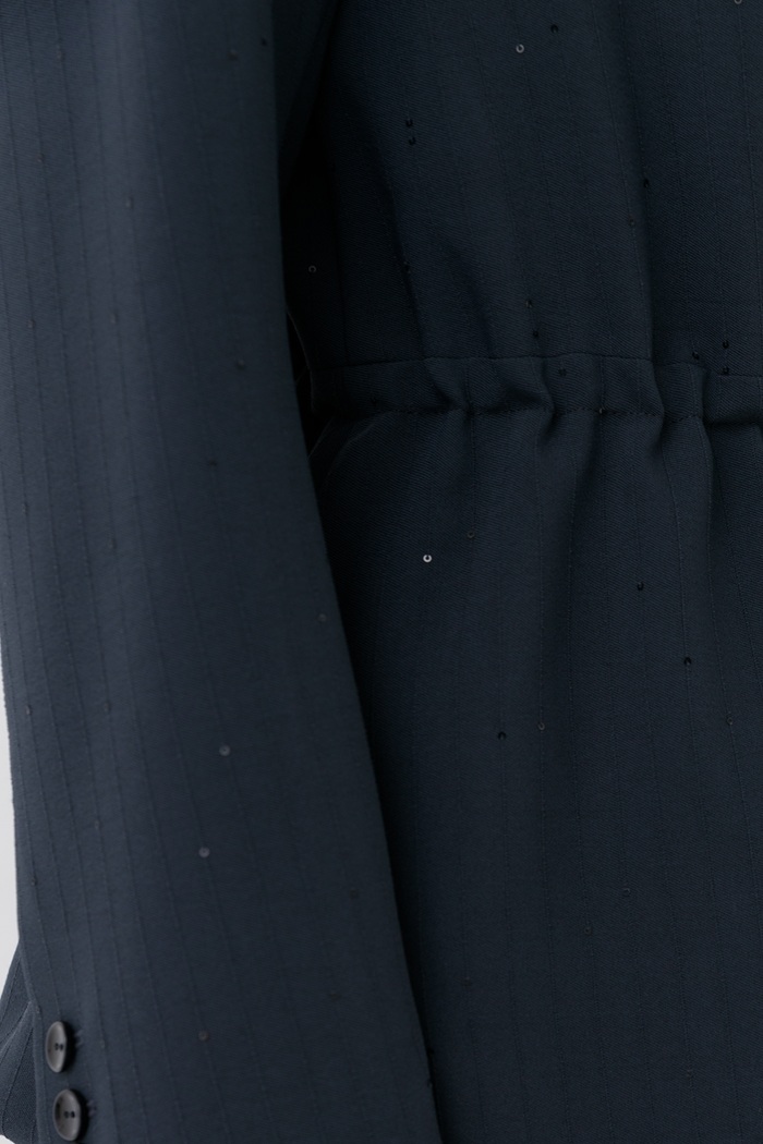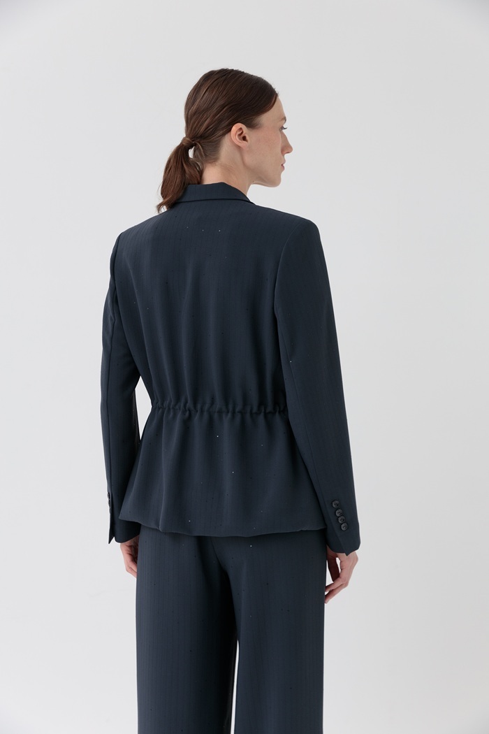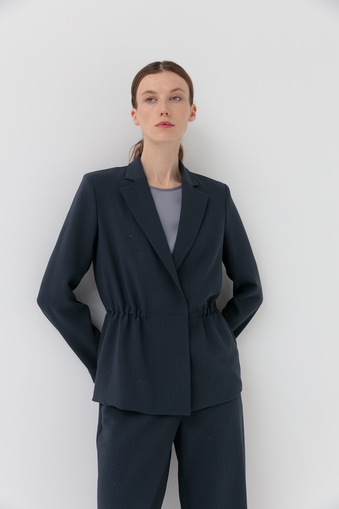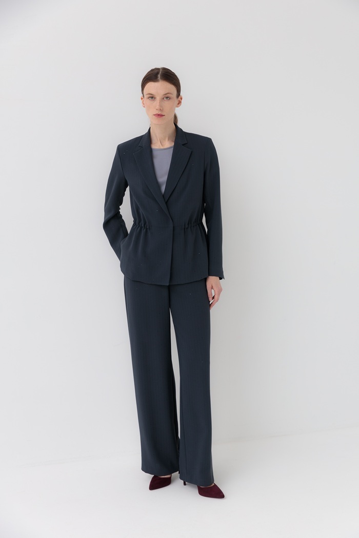 Жакет «ЛЕККО» — сдержанная элегантность в тёмно-синем оттенке. Изящная сборка на талии, классический воротник и лаконичные линии создают утончённый деловой образ. Комплект с брюками в тон — воплощение стиля и уверенности.