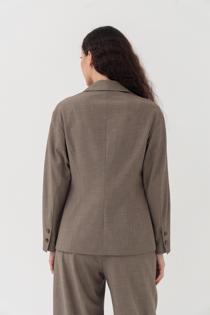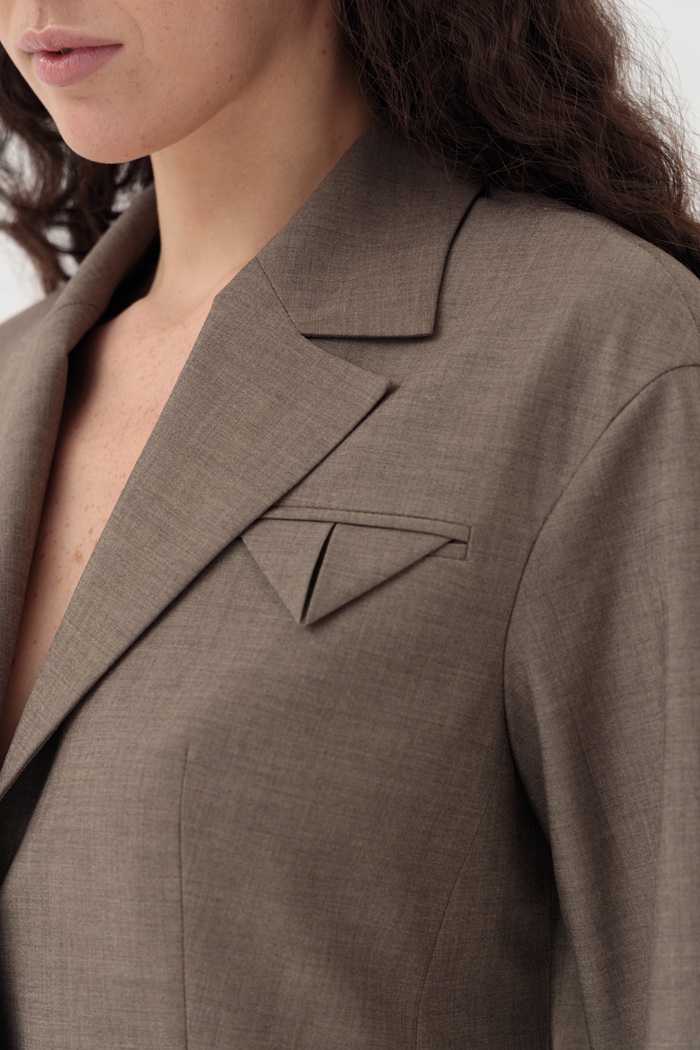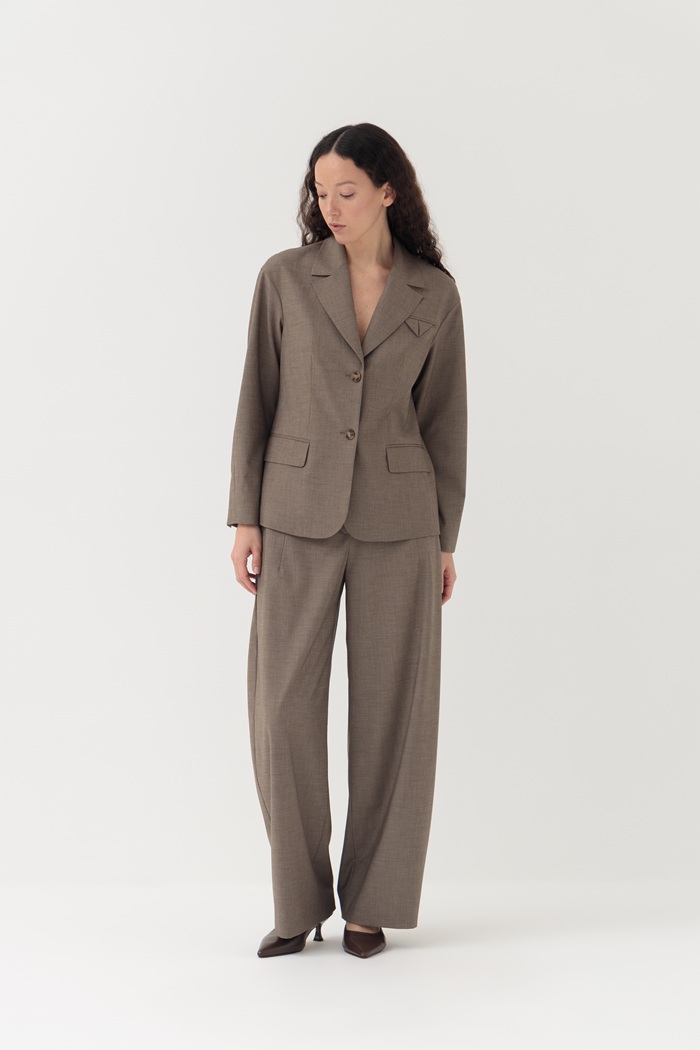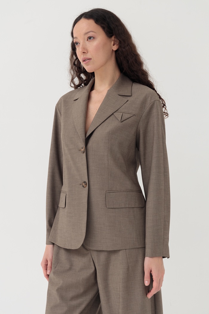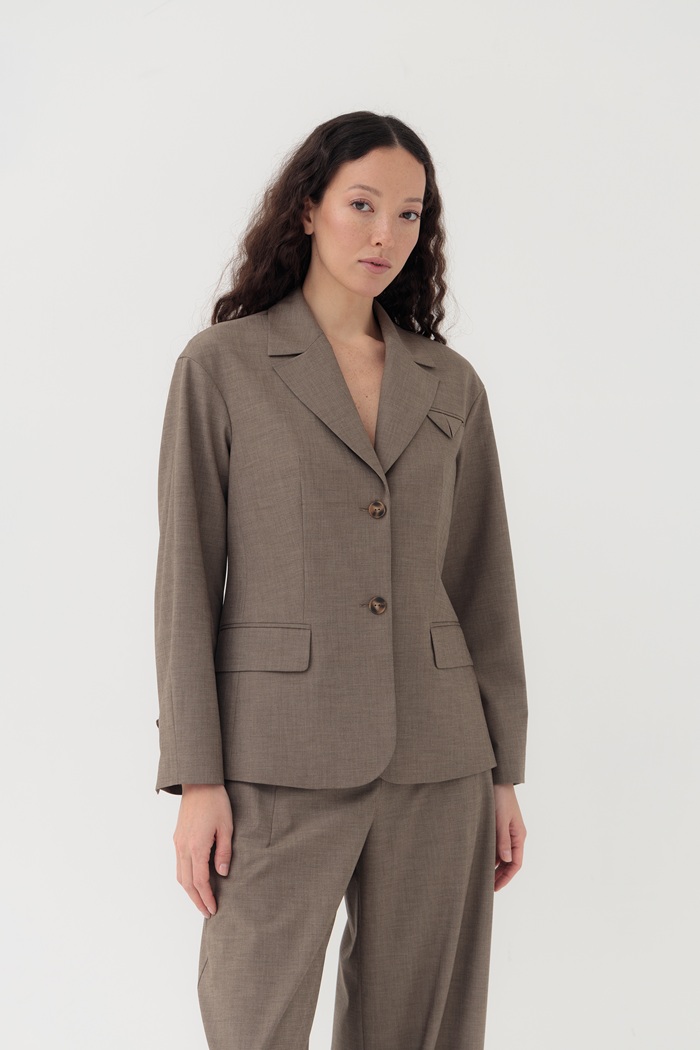Представляем жакет Лукка. Игра с формами и объёмами — важный тренд, который вобрала в себя эта модель. Подчёркнутая талия, но при этом плечи сделаны женственно округлыми. Жакет выполнен из тонкой костюмной ткани с добавлением шерсти. Идеальной парой к жакету станут брюки Лукка из этой же ткани.