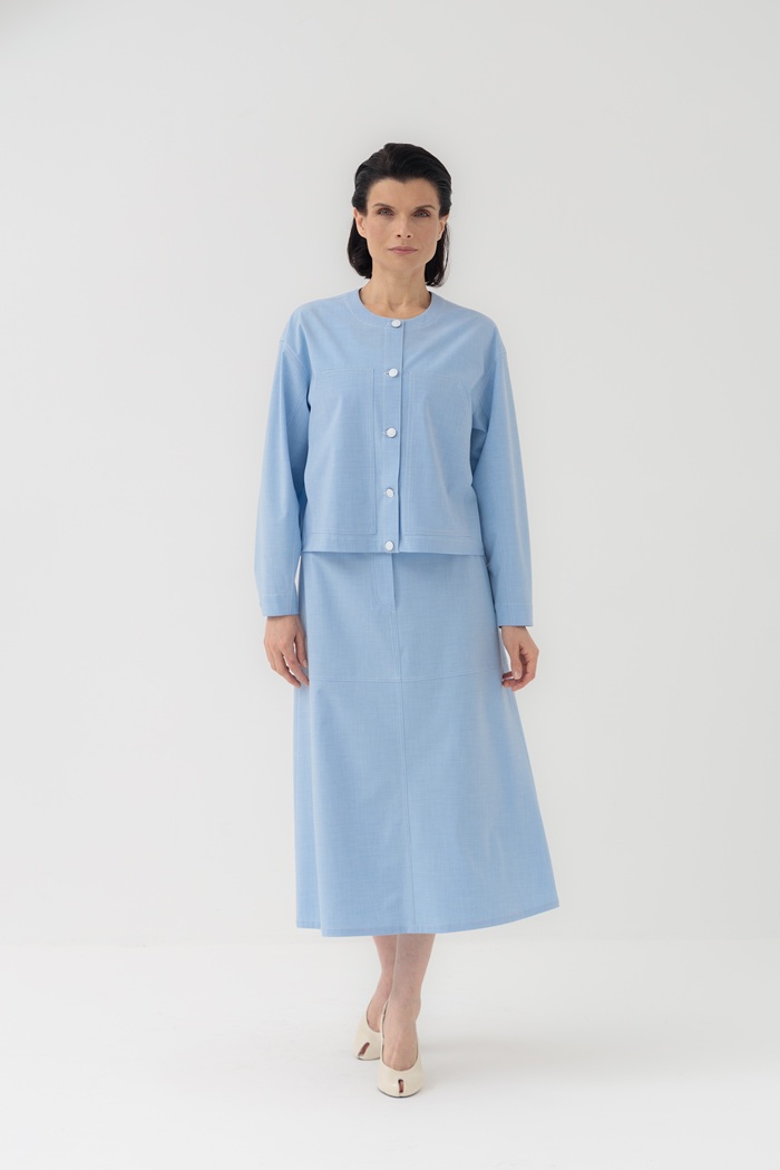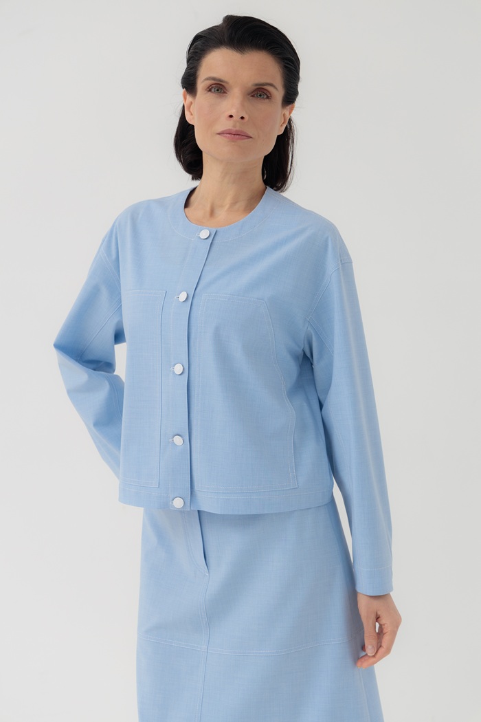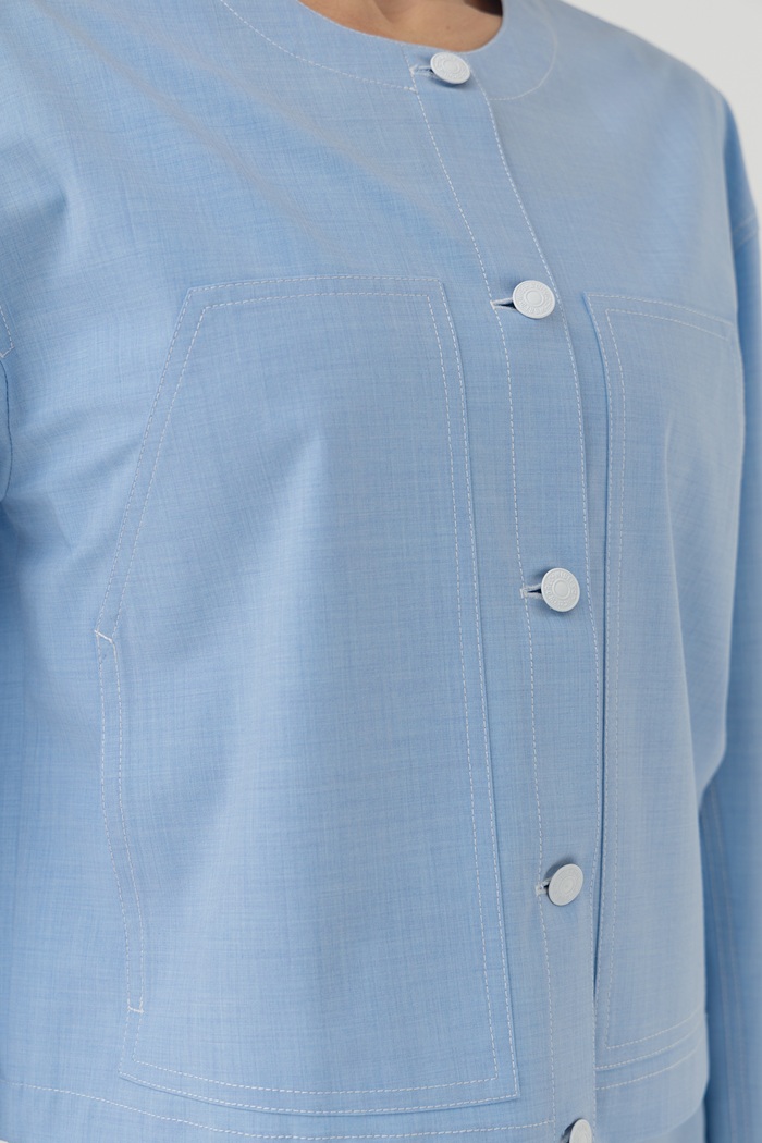Укороченный жакет Ольбия с контрастными отстрочками, круглым вырезом горловины и застежкой на джинсовые пуговицы. Отличительной особенностью жакета являются крупные накладные карманы на полочках.