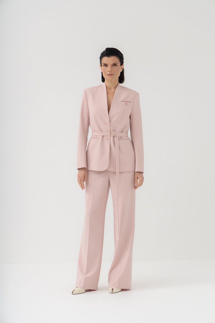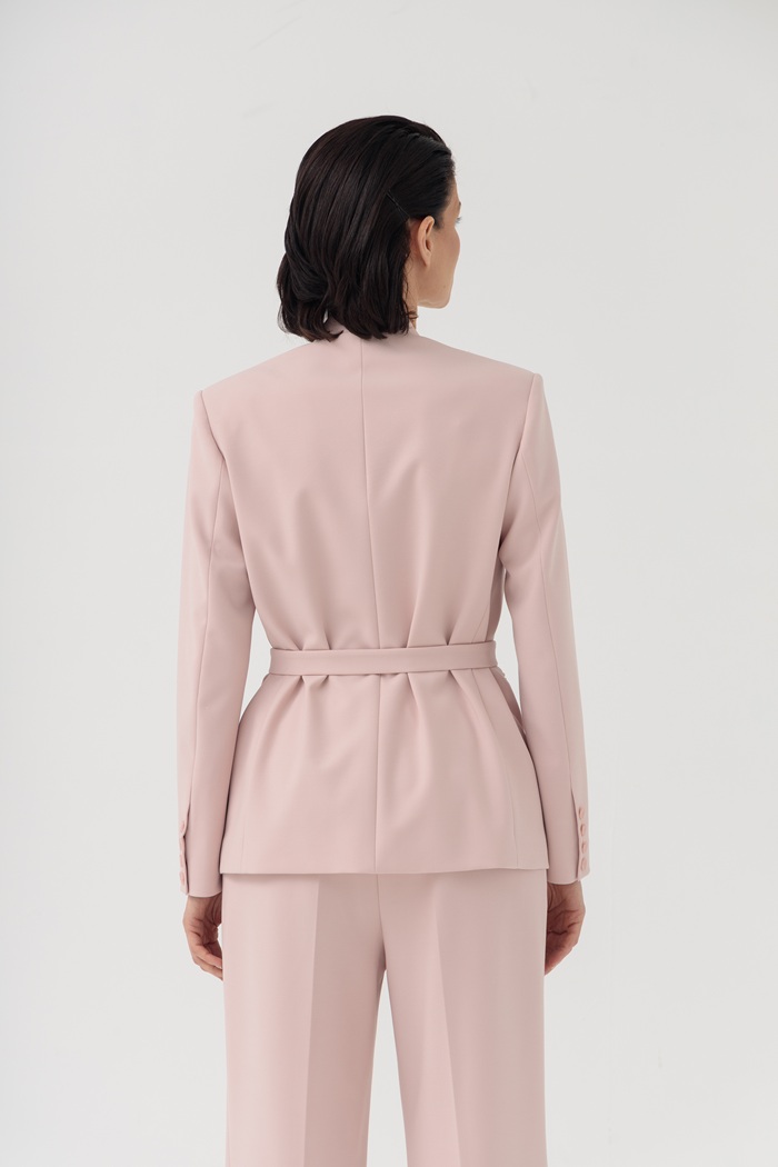 Этот изысканный жакет с цельнокроеной стойкой нежно-розового цвета подчеркивает графичность кроя и имеет скульптурный силуэт. Структурированные плечи и вырез без лацканов завершают образ. Плотный костюмный текстиль из поливискозы с добавлением эластана хорошо держит форму и обеспечивает комфортную посадку по фигуре. Длинный пояс с золотистой пряжкой позволяет подчеркнуть талию. Жакет гармонично впишется как в деловой, так и в более торжественный образ.