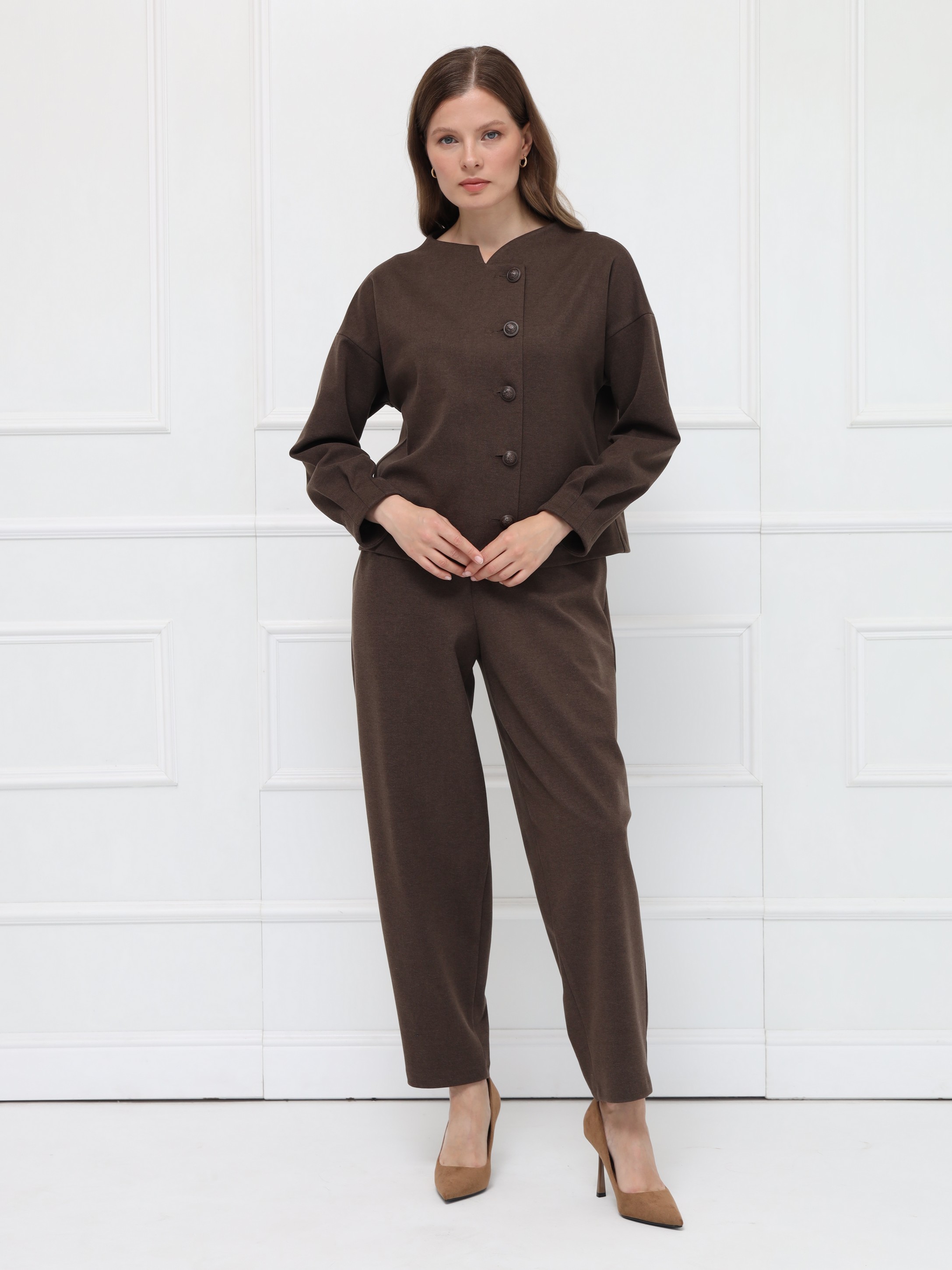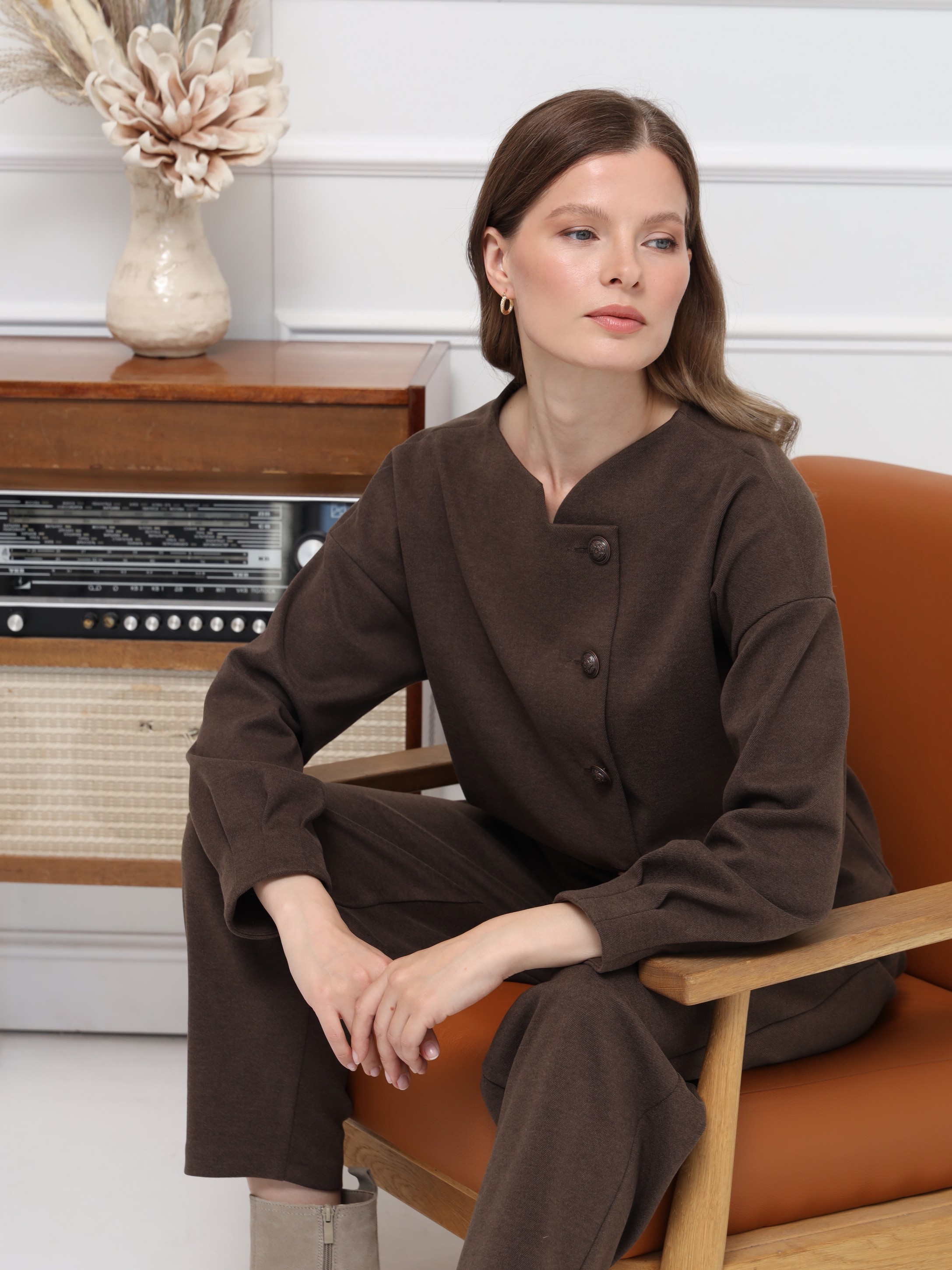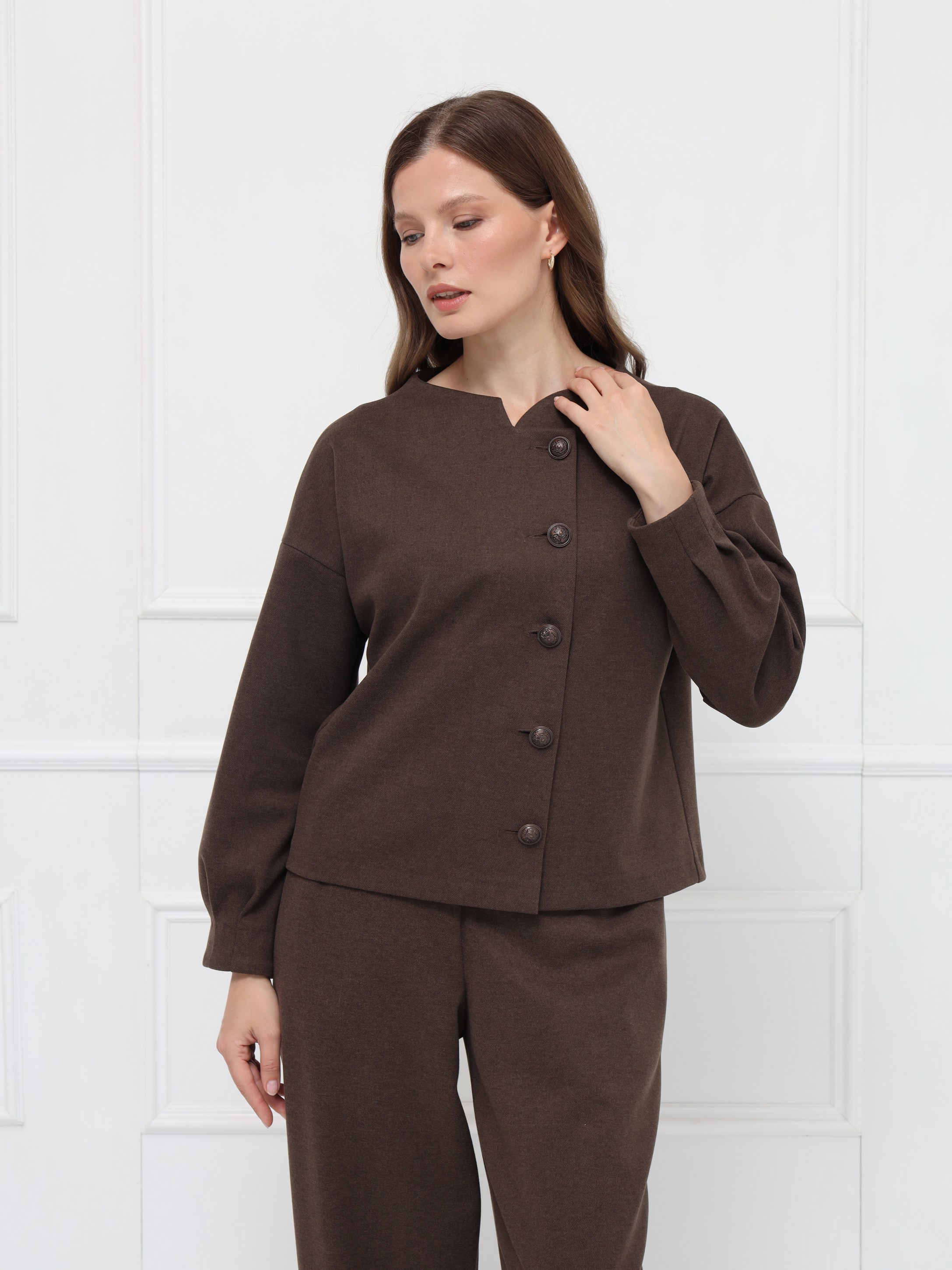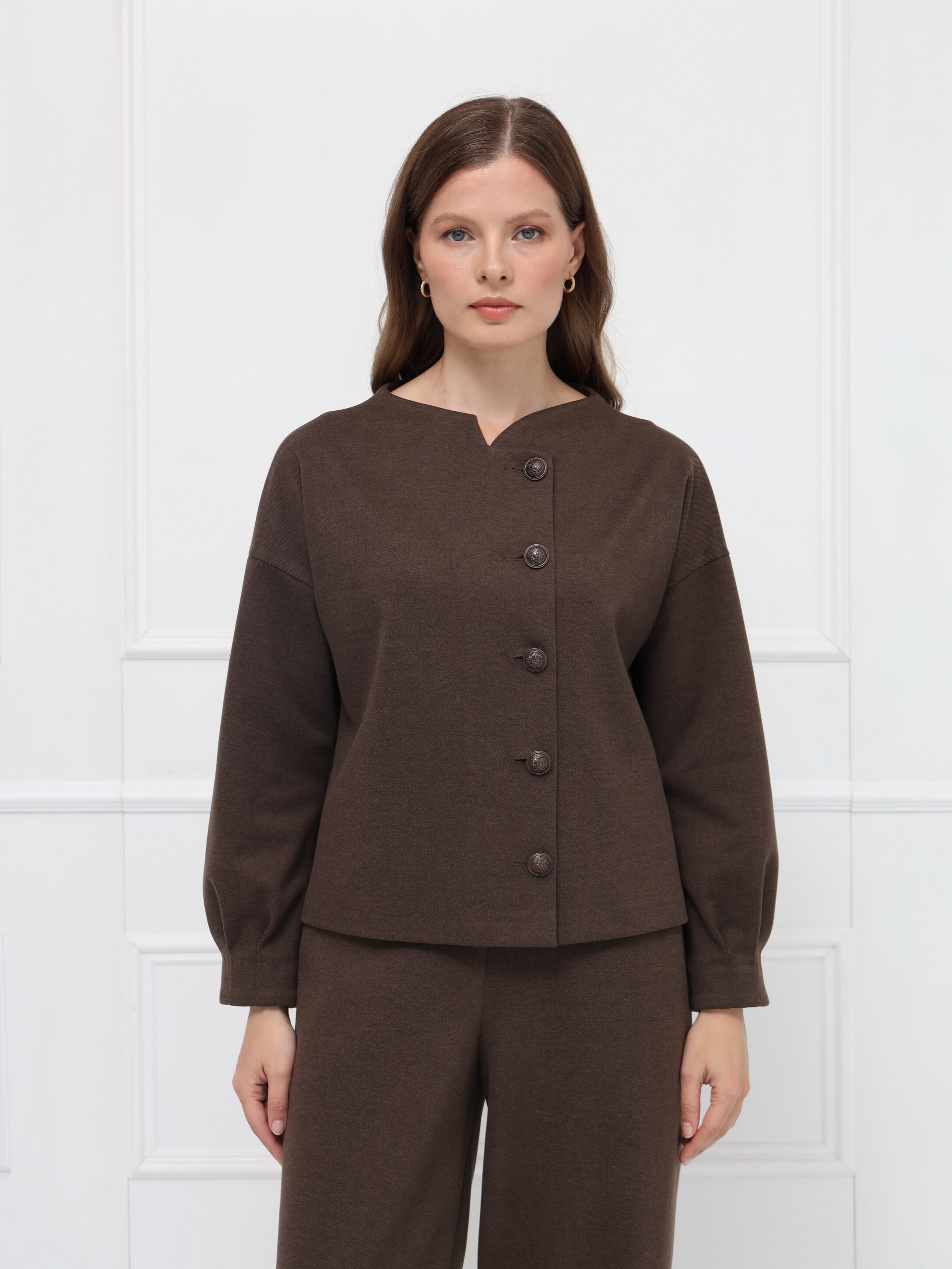 Коричневый жакет с асимметричной горловиной и акцентными пуговицами. Прямой силуэт и спущенная линия плеч создают модный и комфортный образ. Эффектные складки по низу рукавов добавляют изюминку. Без подкладки, выполнен из плотного трикотажа, который отлично держит форму, сохраняет тепло и не мнется.