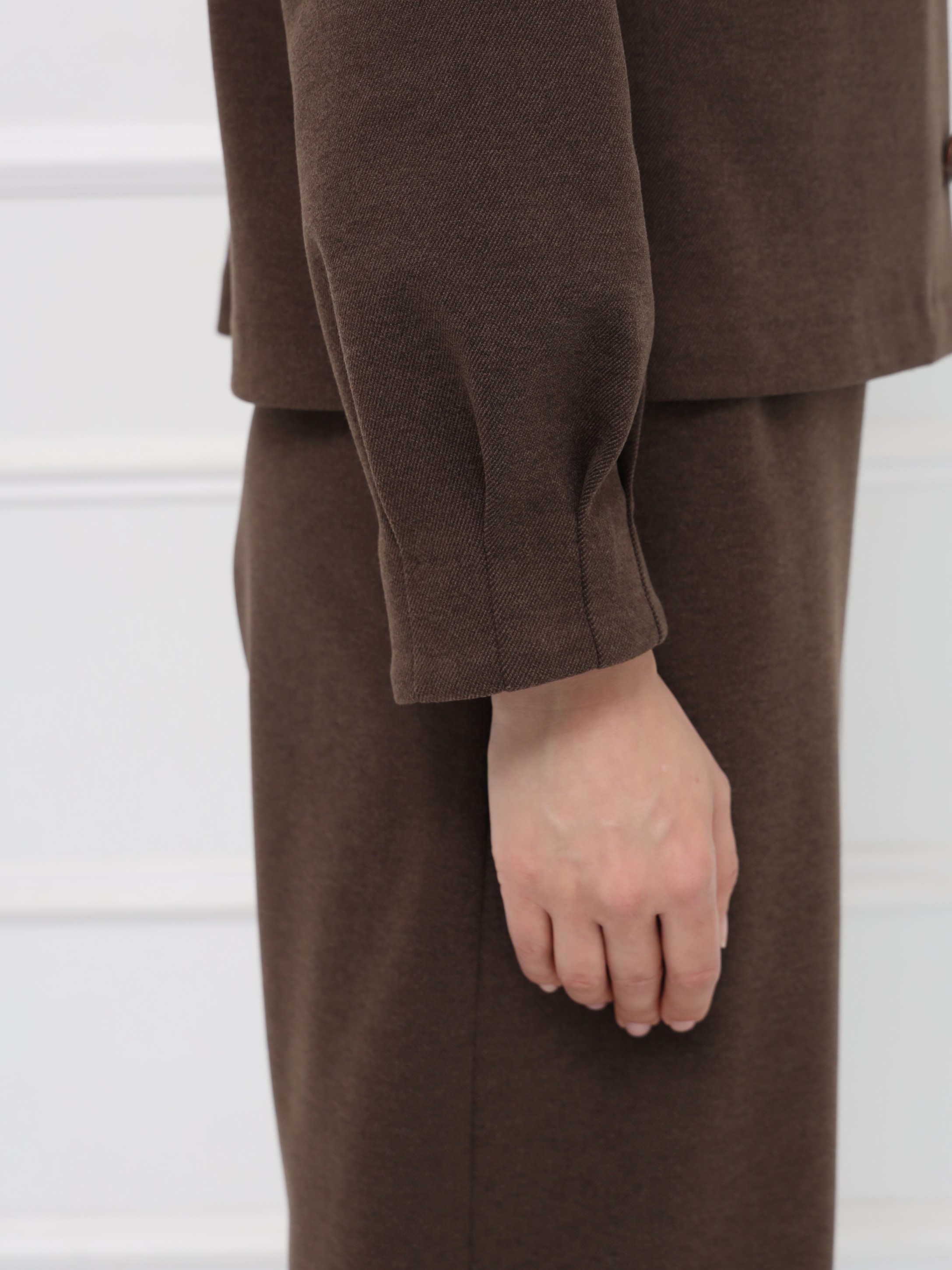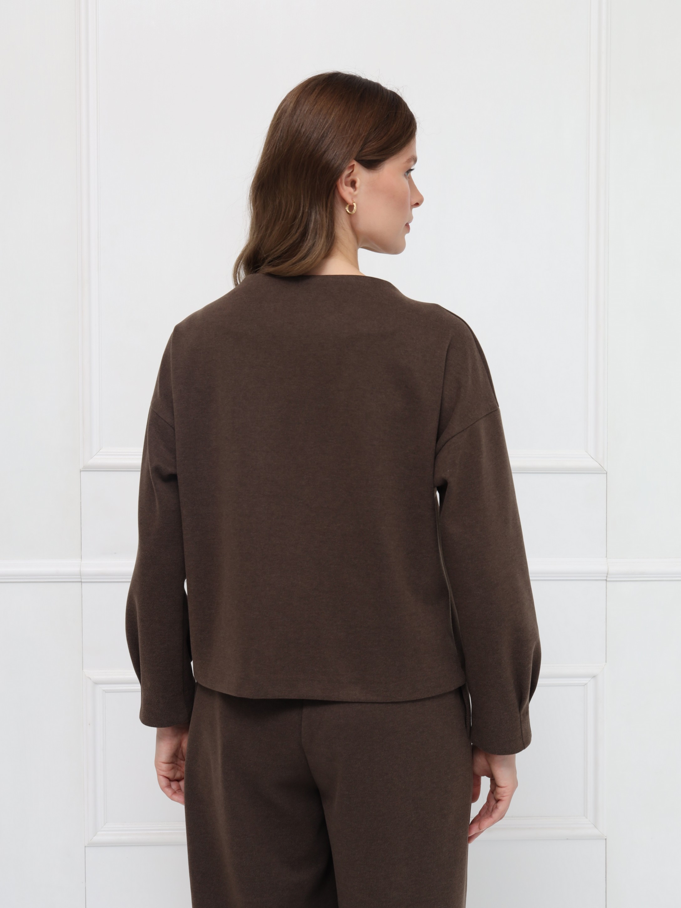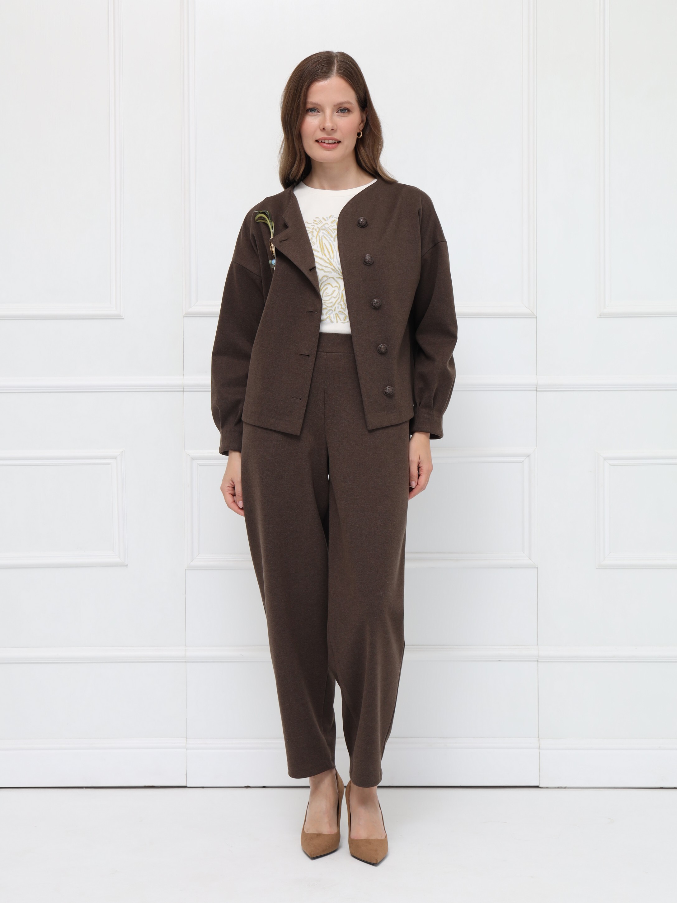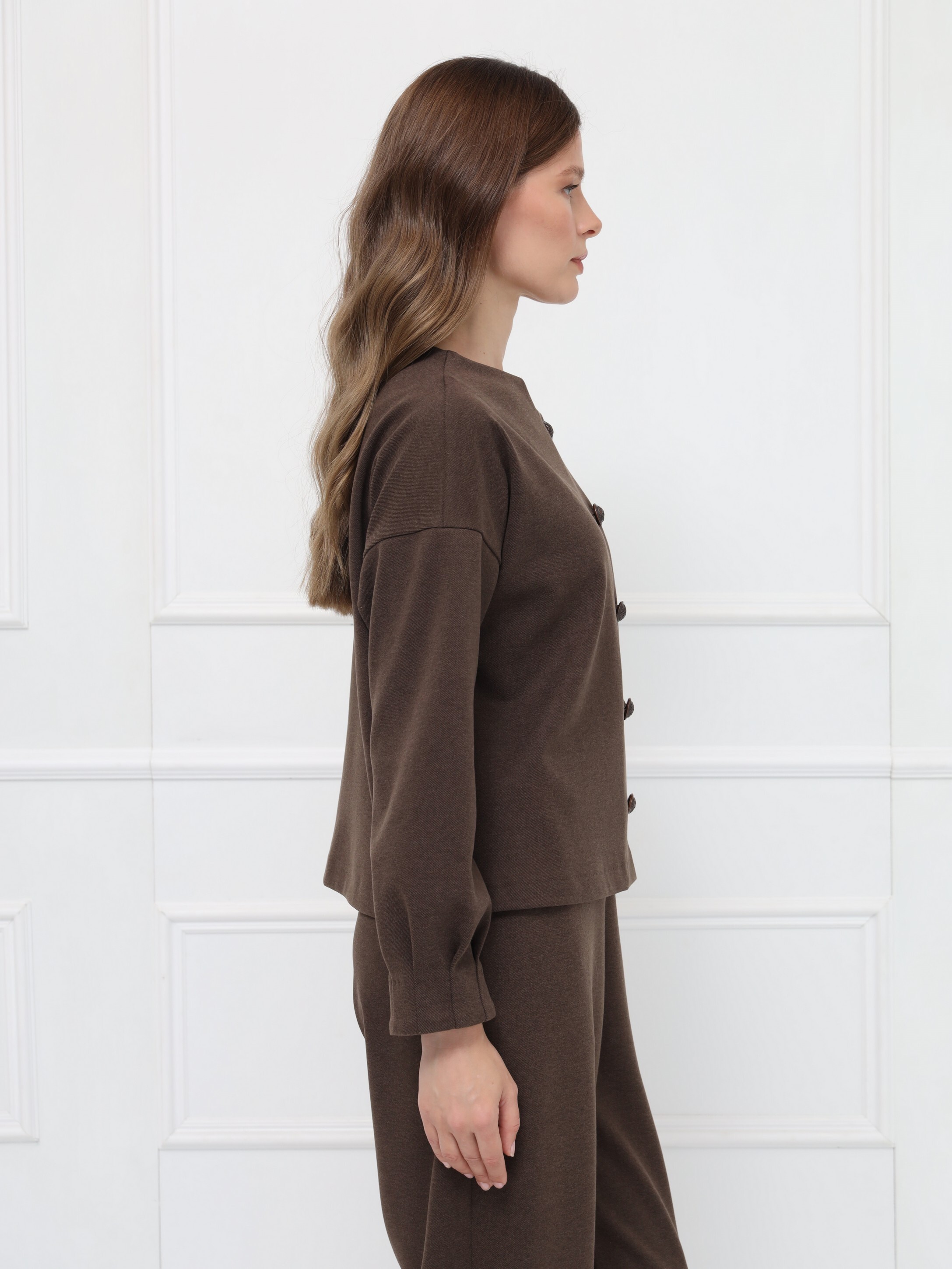 Коричневый жакет с асимметричной горловиной и акцентными пуговицами. Прямой силуэт и спущенная линия плеч создают модный и комфортный образ. Эффектные складки по низу рукавов добавляют изюминку. Без подкладки, выполнен из плотного трикотажа, который отлично держит форму, сохраняет тепло и не мнется.