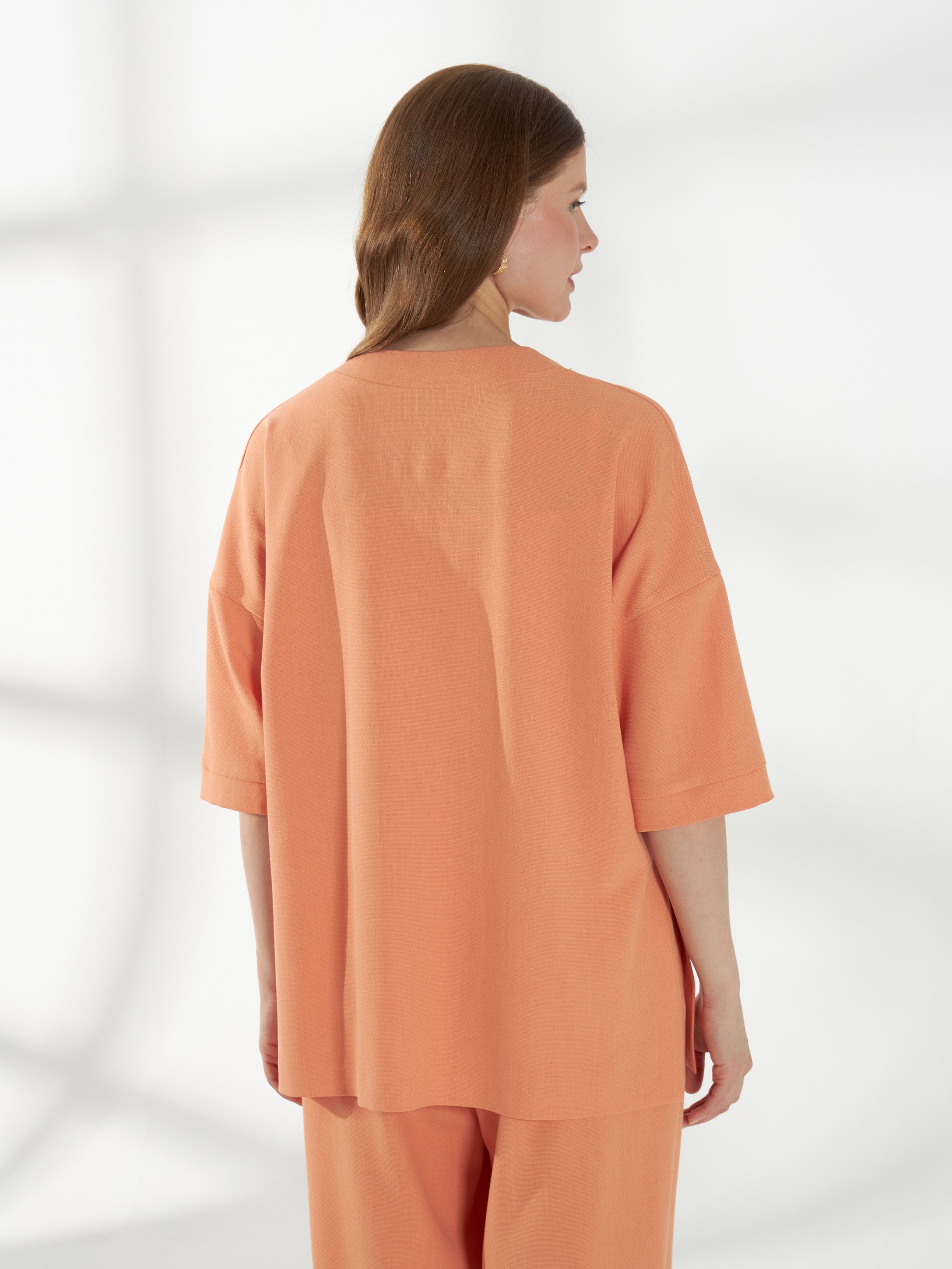 Свободный жакет с короткими рукавами, без воротника в ярком апельсиновом оттенке из дышащей и пластичной ткани. Модель с боковыми разрезами и застежкой на одну пуговицу создаёт лёгкий, непринуждённый силуэт, подчёркивая современный и свежий стиль образа.