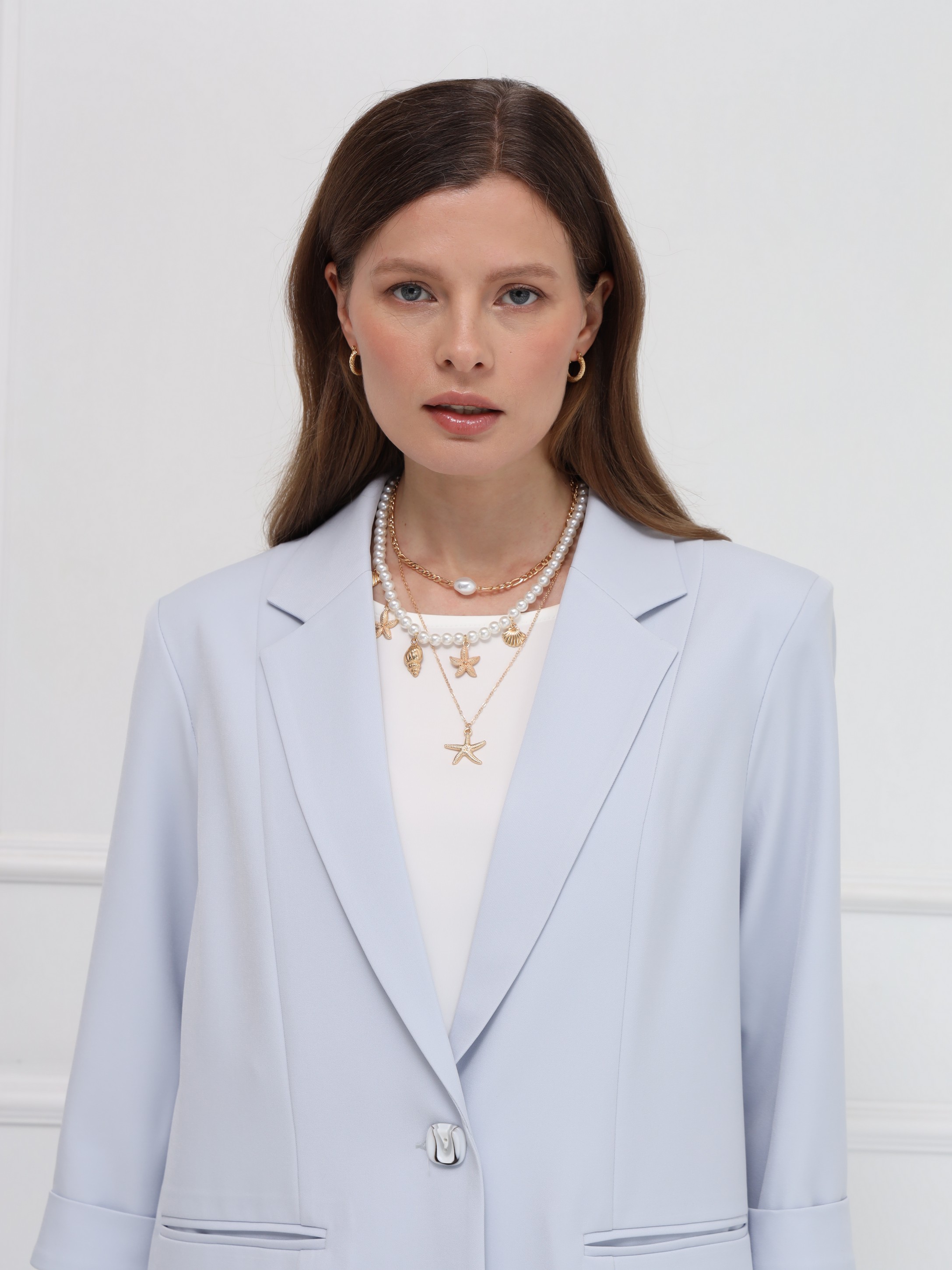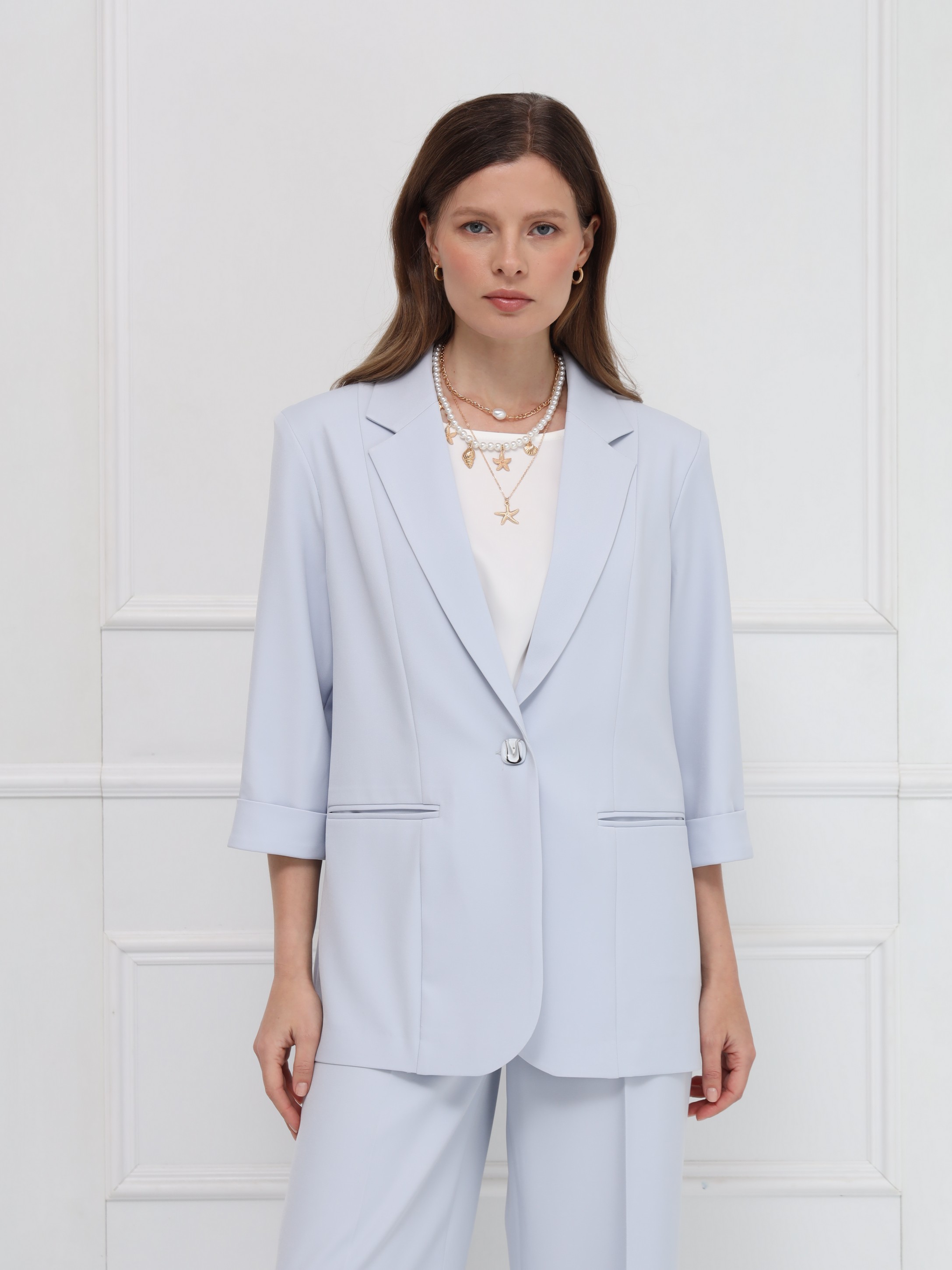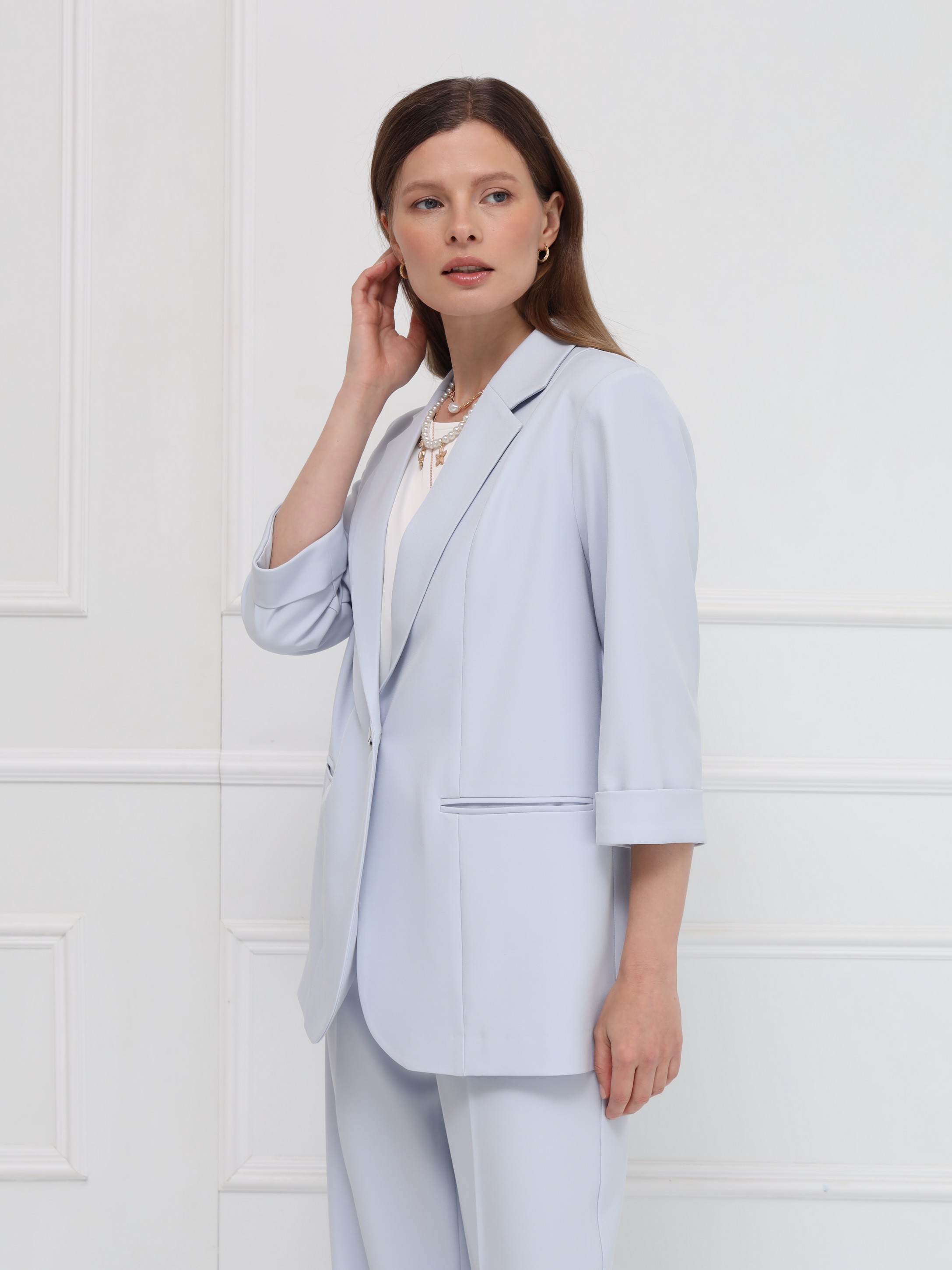 Жакет выполнен в классическом прямом крое с чёткими, аккуратно оформленными плечами. Узкие лацканы придают модели современный и сдержанный вид, а прорезные карманы добавляют функциональности, сохраняя чистоту силуэта. Застёжка на одну пуговицу подчёркивает строгий стиль, а рукава длиной 7/8 с аккуратными отворотами вносят лёгкую неформальность. Жакет изготовлен из тонкой ткани, хорошо держащей форму, и не имеет подкладки, что обеспечивает комфорт и лёгкость - идеальное решение для весны.