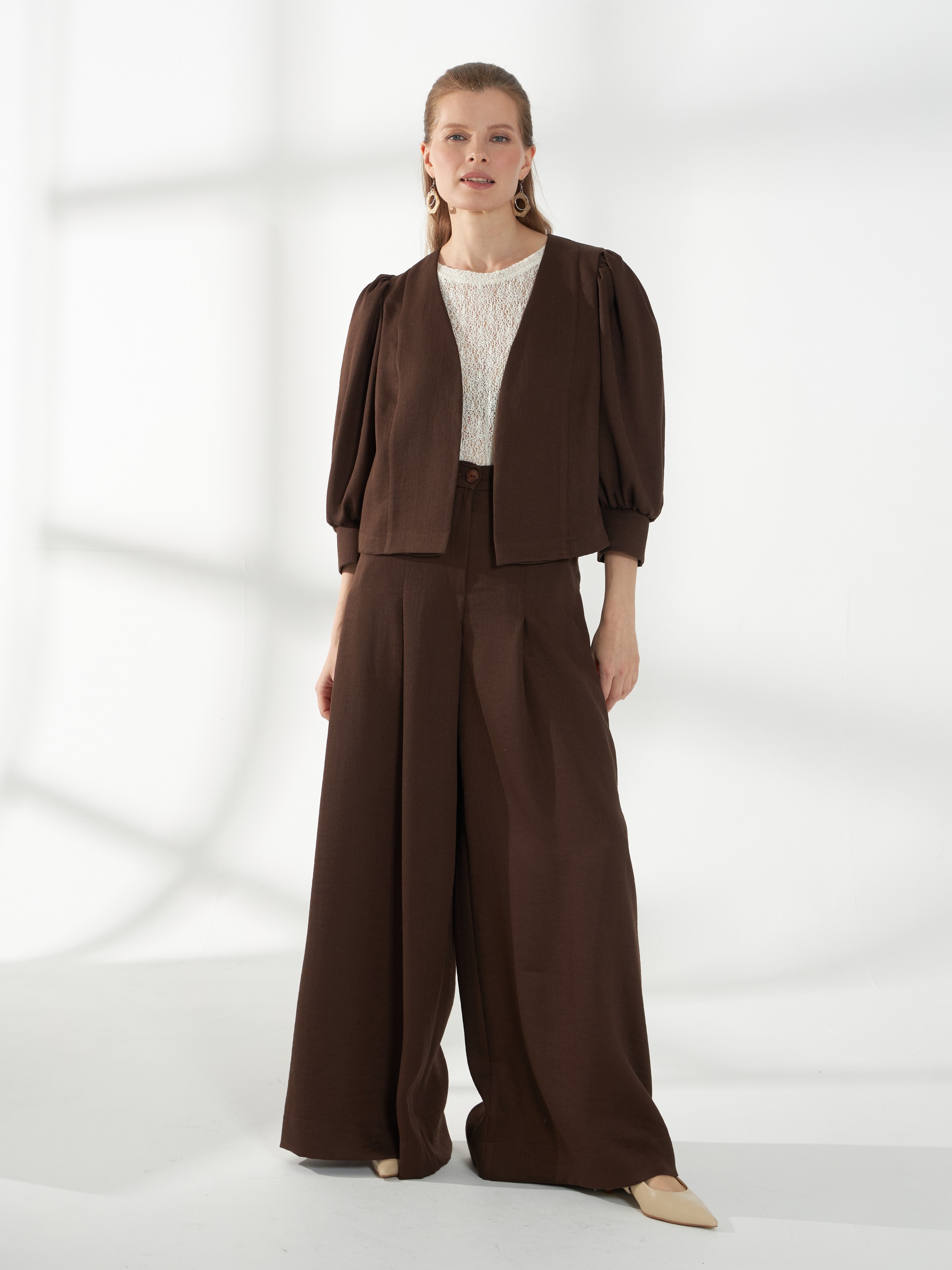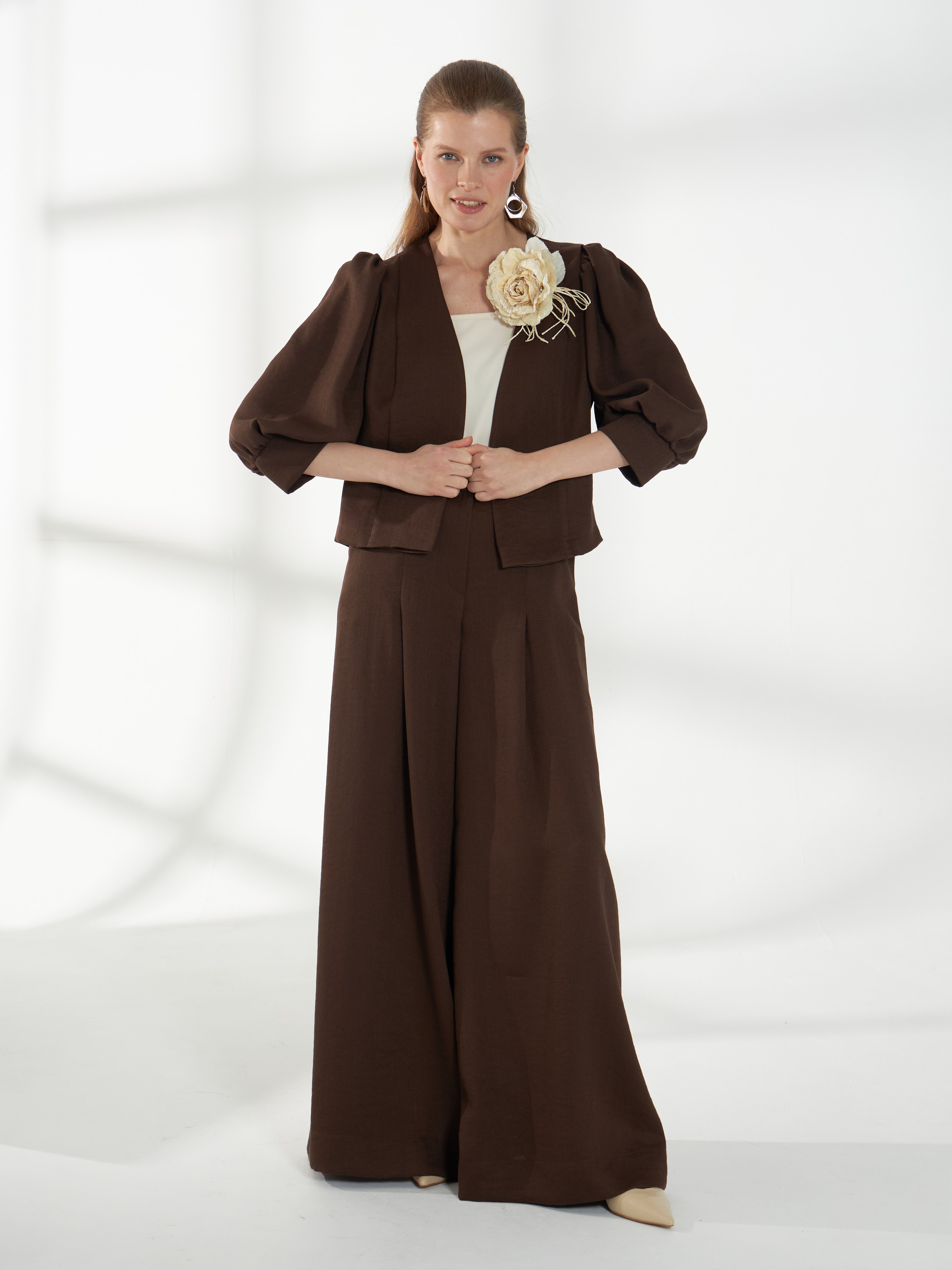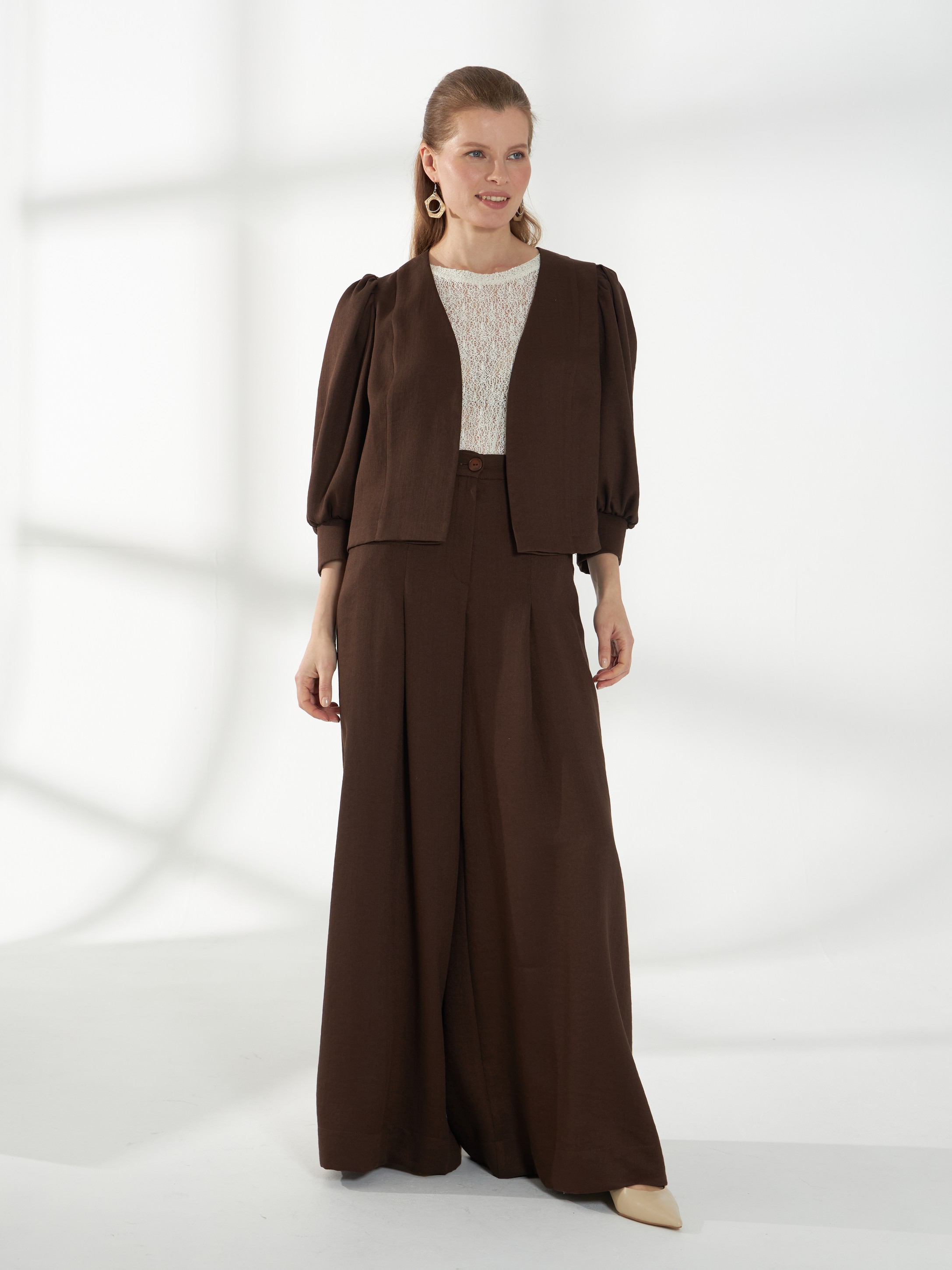 Стильный укороченный жакет прямого кроя без воротника и застежки. Акцент на плечи создается сборкой по окату широких рукавов 3/4 на манжетах, а прямой крой сохраняет строгую и аккуратную линию силуэта. Модель выполнена из смесового материала со льном в коричневом оттенке, ткань хорошо держит форму и выглядит безупречно в течение дня.