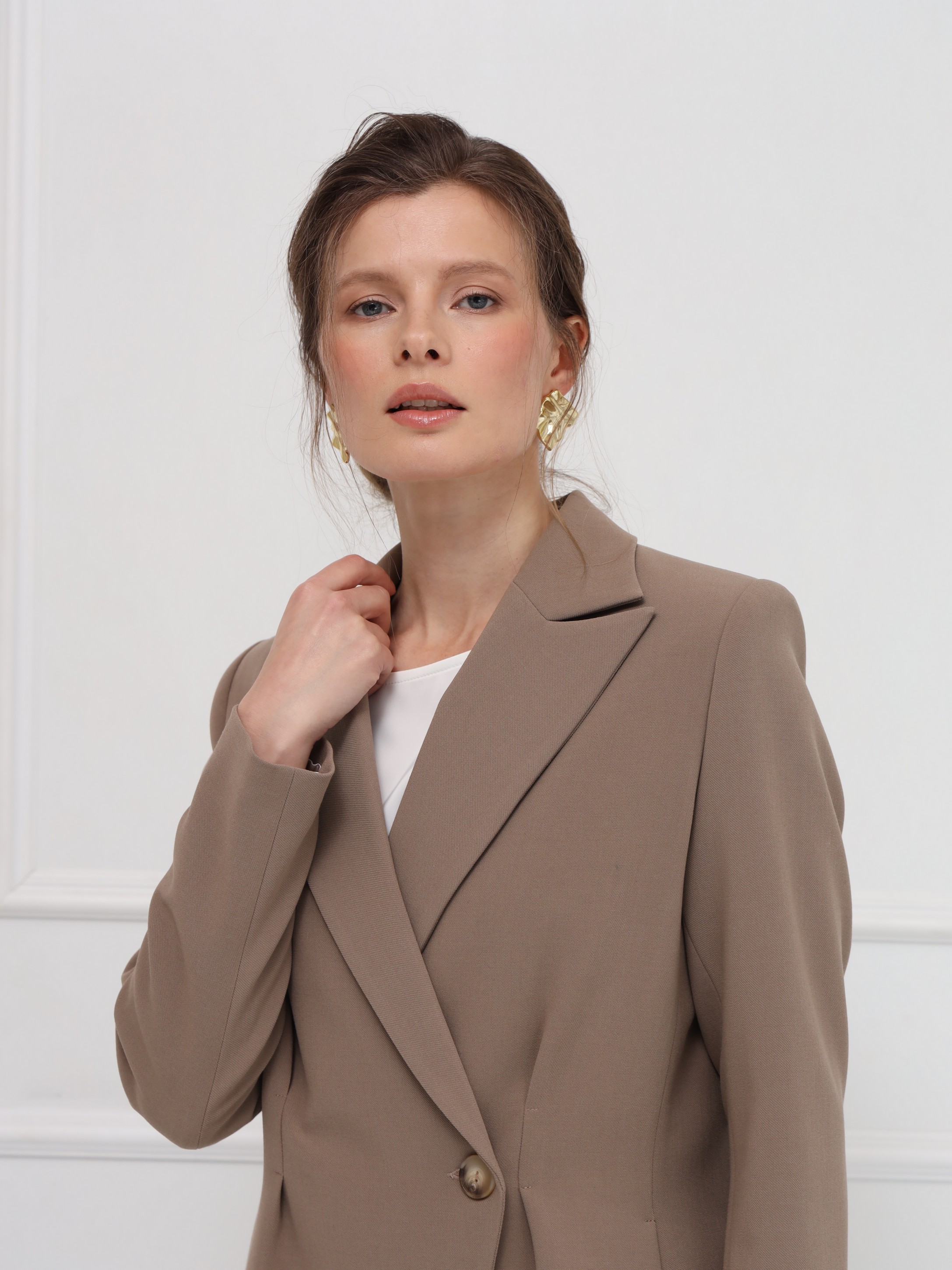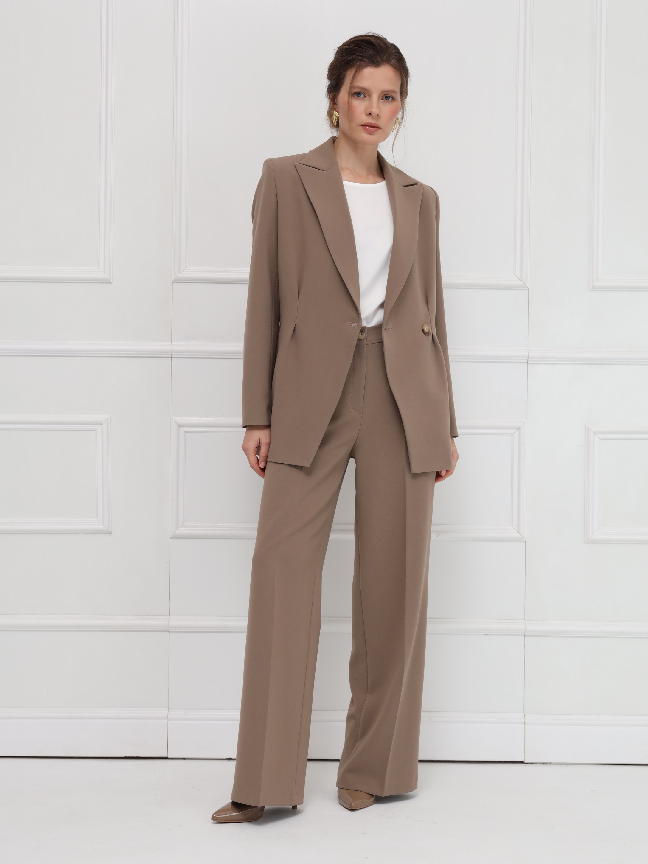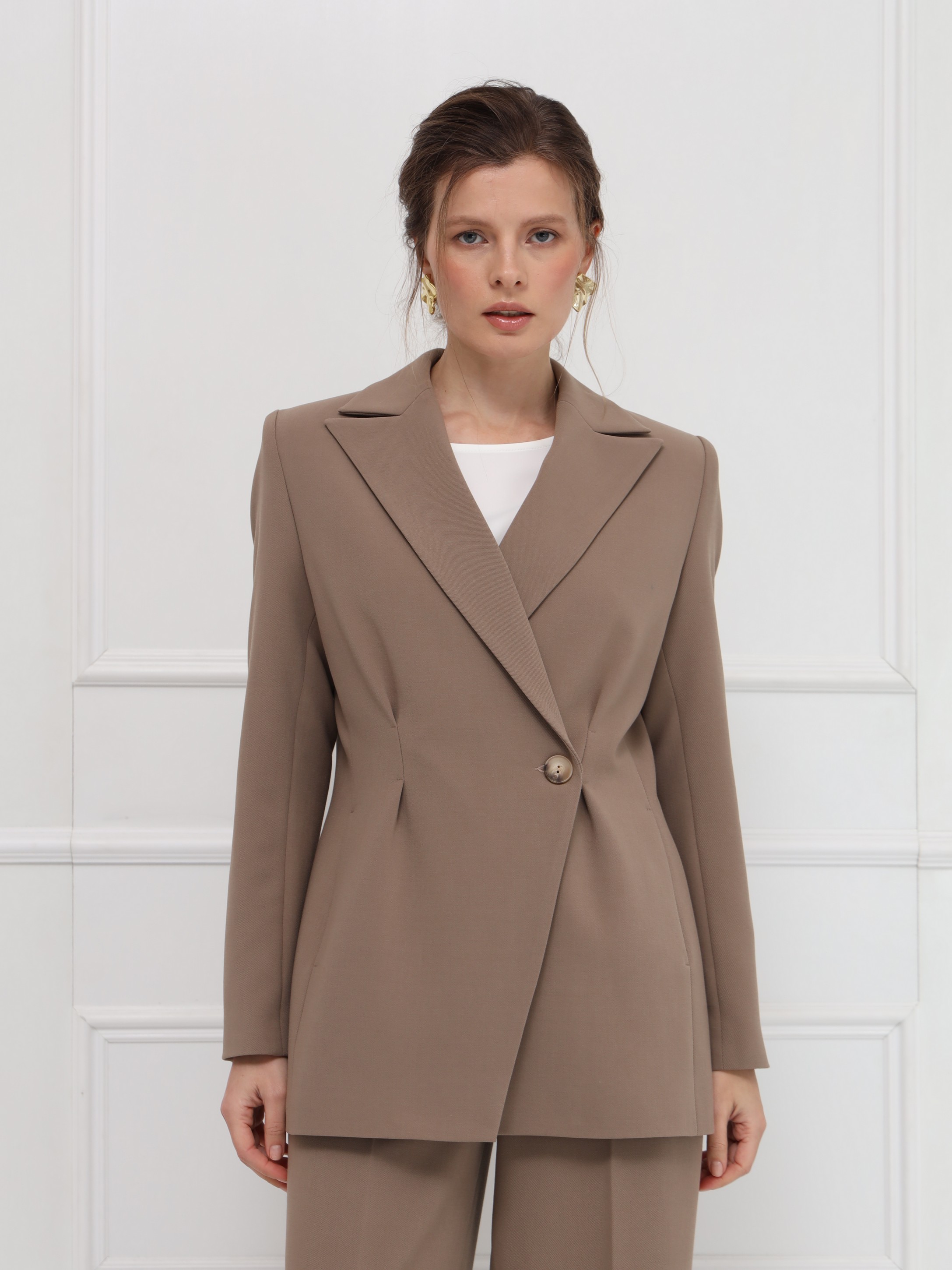 Жакет впечатляет чёткой архитектурой силуэта. Прямая линия плеча и заострённые широкие лацканы создают выразительную структуру, а смещённая застёжка добавляет современный акцент. Приталенность формируется за счёт аккуратно застроченных складок по линии талии, что подчёркивает выверенную посадку. Карманы, выполненные в рельефных швах, сохраняют лаконичность модели. Мягкий материал с эластаном и эластичная подкладка обеспечивает комфорт и идеальную посадку в движении. Стильная и хорошо сбалансированная модель для продуманных, выразительных образов.