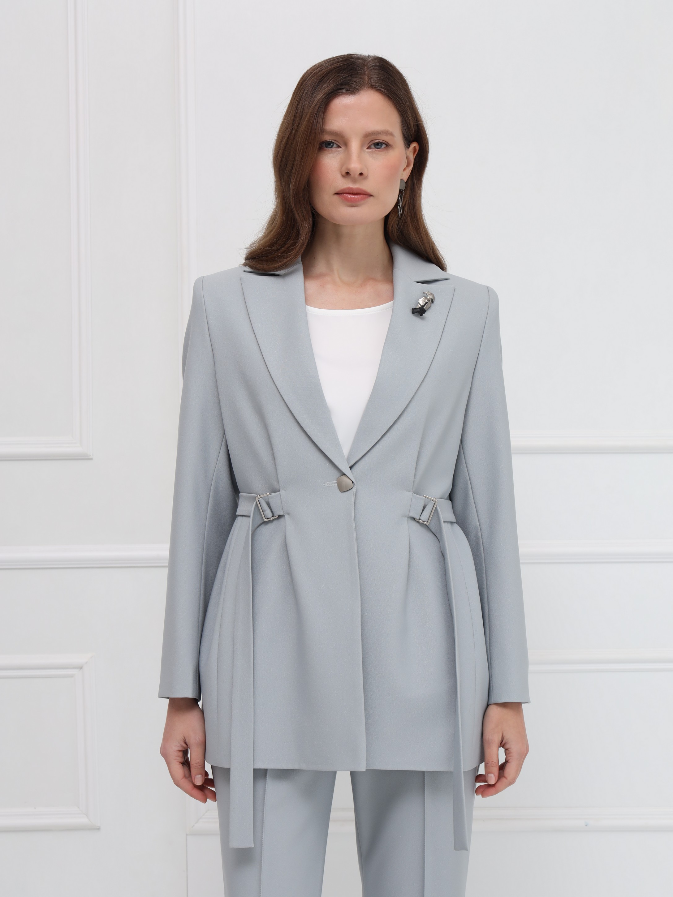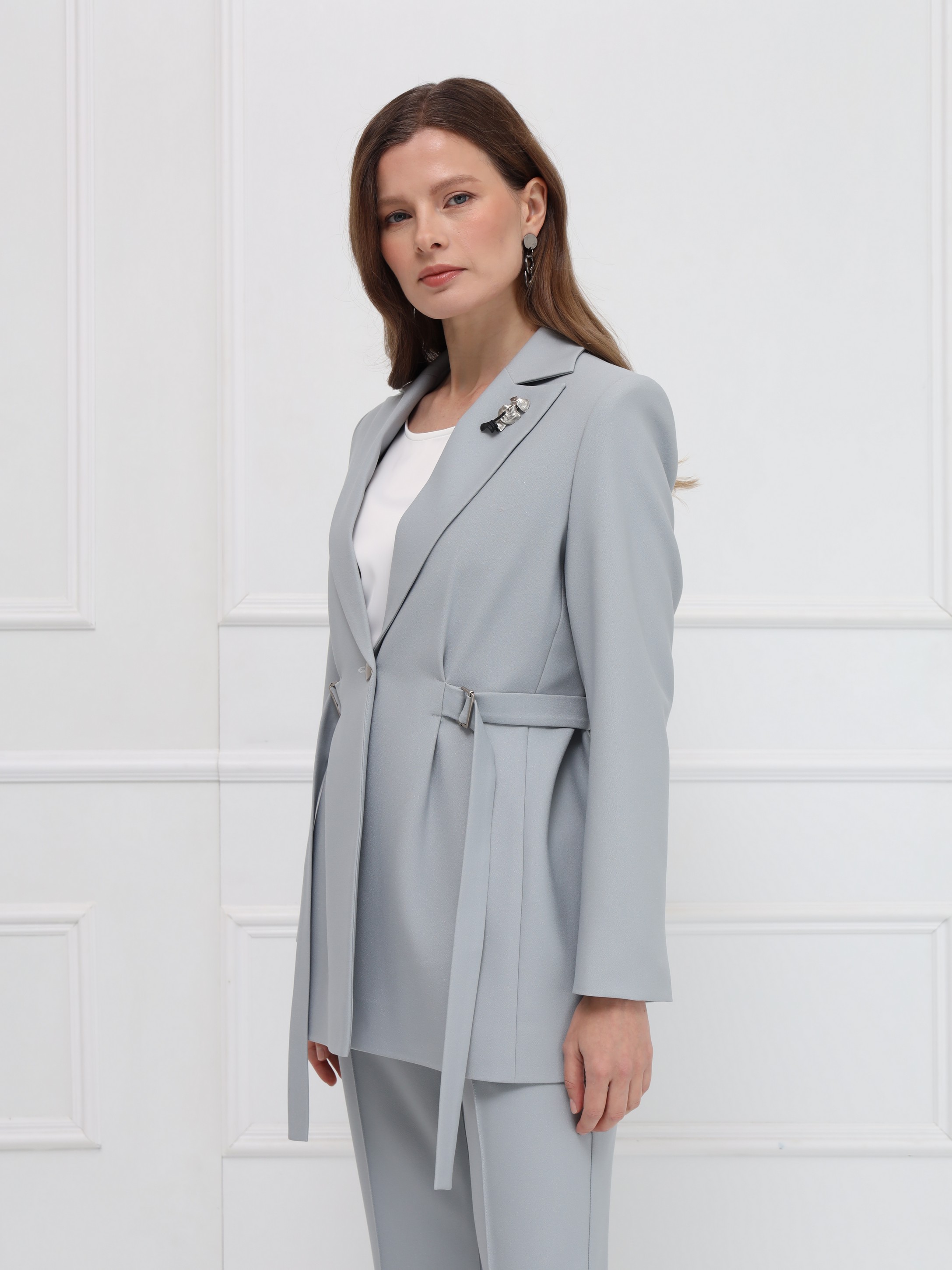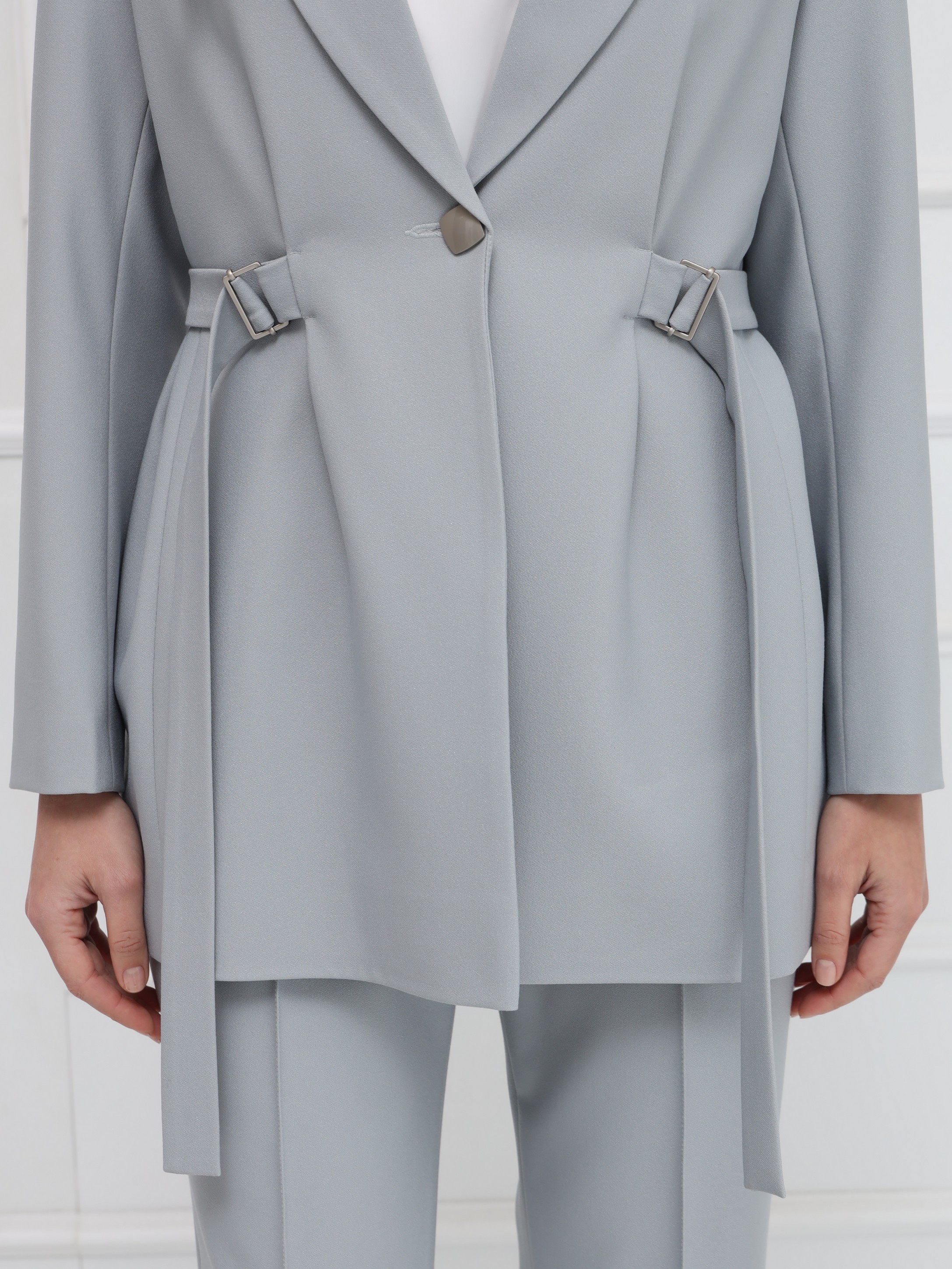 Жакет отличается чистой, выверенной архитектурой силуэта. Структурированная линия плеча и широкие заострённые лацканы формируют современный, выразительный образ. Центральная застёжка на одну пуговицу подчёркивает лаконичность дизайна, а приталенность регулируется тонкими поясами, продетыми в изящные пряжки - они создают деликатный, но эффектный акцент на талии. Отсутствие карманов делает модель особенно чистой по линиям. Плотный материал с лёгким благородным блеском поддерживает строгую форму и обеспечивает элегантную посадку. Идеальный жакет для тех, кто ценит точность кроя и современную элегантность.