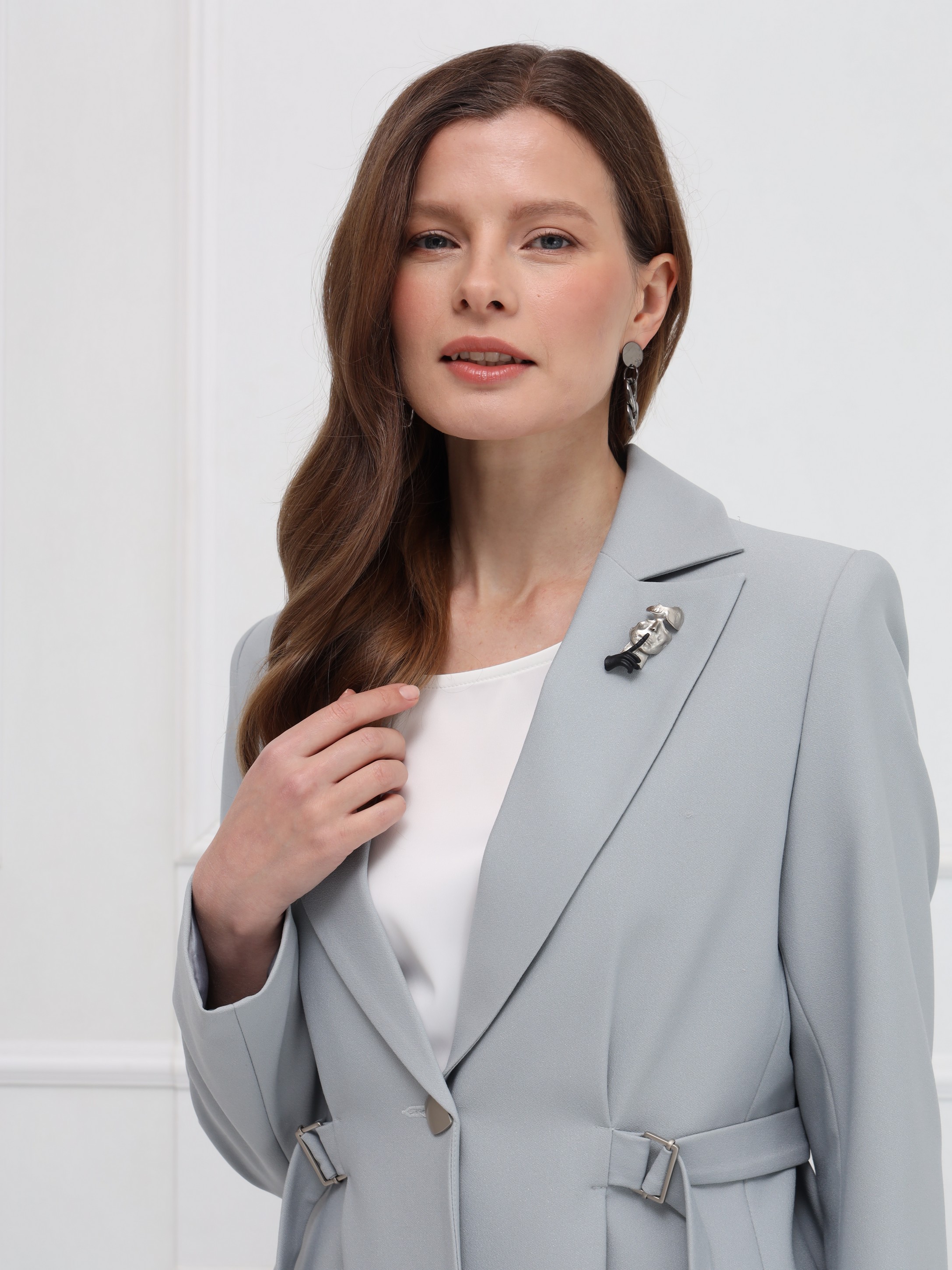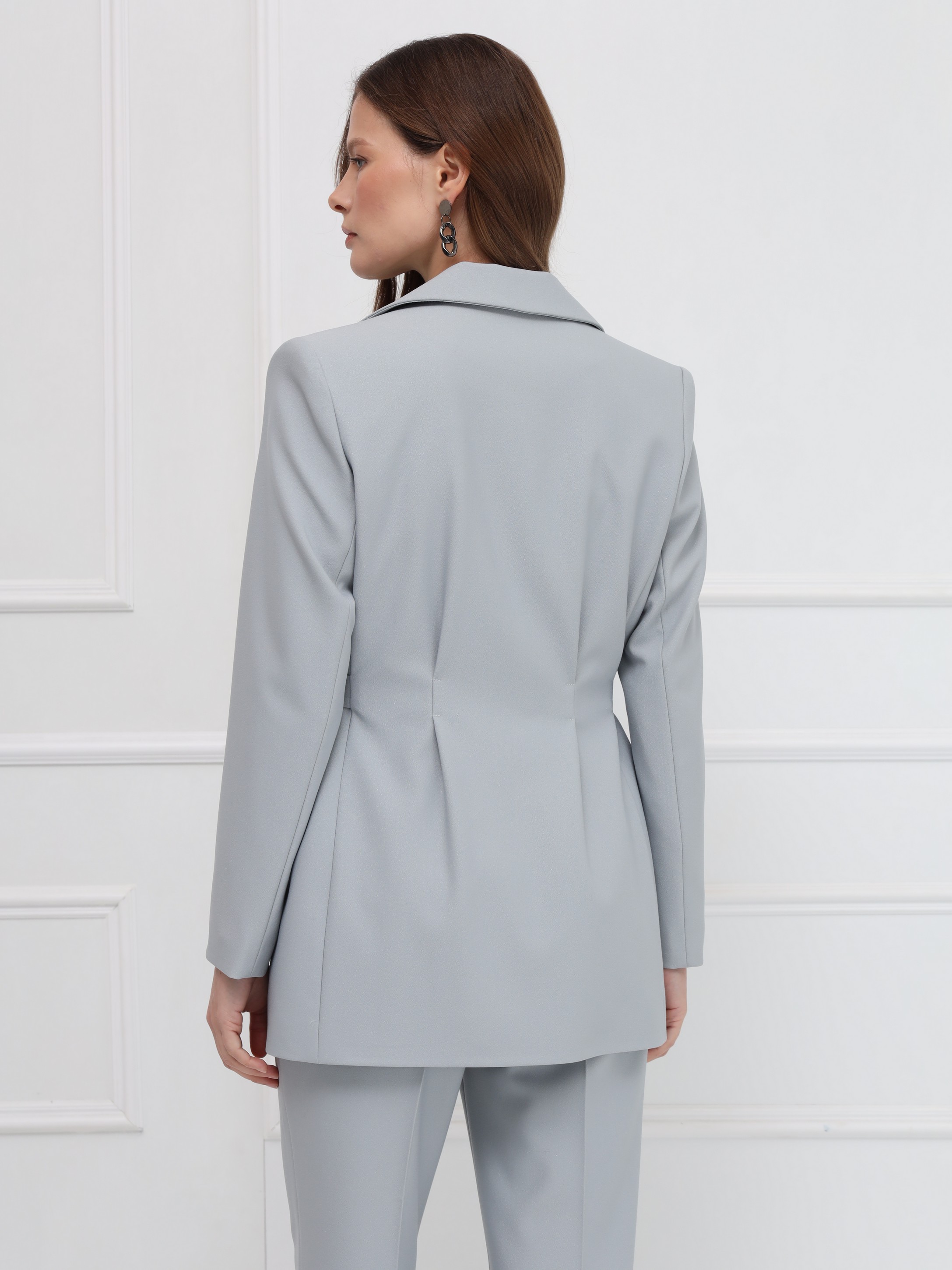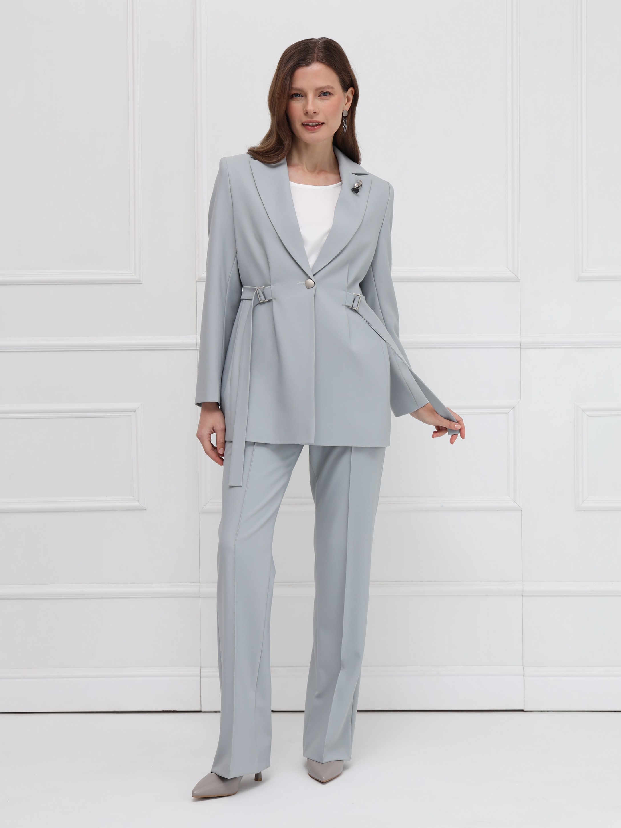 Жакет отличается чистой, выверенной архитектурой силуэта. Структурированная линия плеча и широкие заострённые лацканы формируют современный, выразительный образ. Центральная застёжка на одну пуговицу подчёркивает лаконичность дизайна, а приталенность регулируется тонкими поясами, продетыми в изящные пряжки - они создают деликатный, но эффектный акцент на талии. Отсутствие карманов делает модель особенно чистой по линиям. Плотный материал с лёгким благородным блеском поддерживает строгую форму и обеспечивает элегантную посадку. Идеальный жакет для тех, кто ценит точность кроя и современную элегантность.