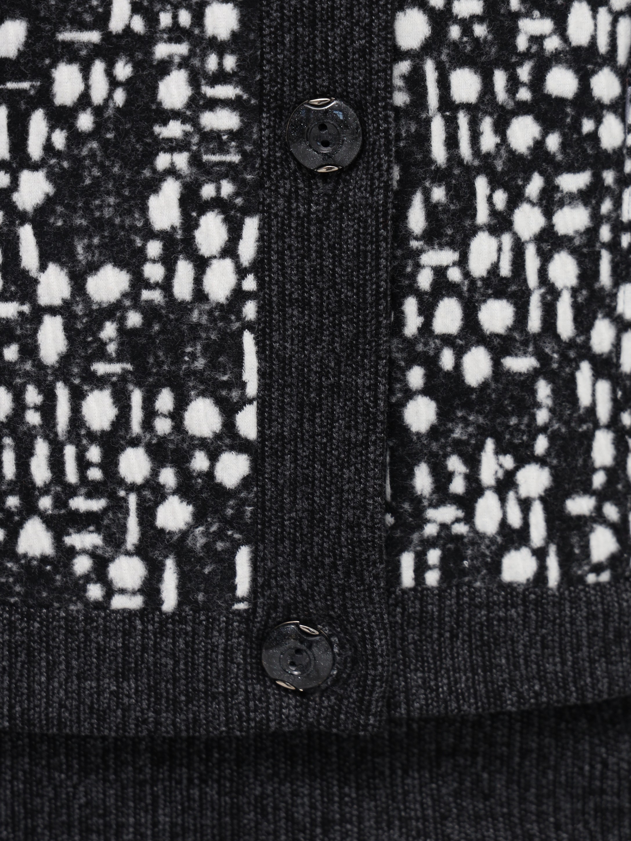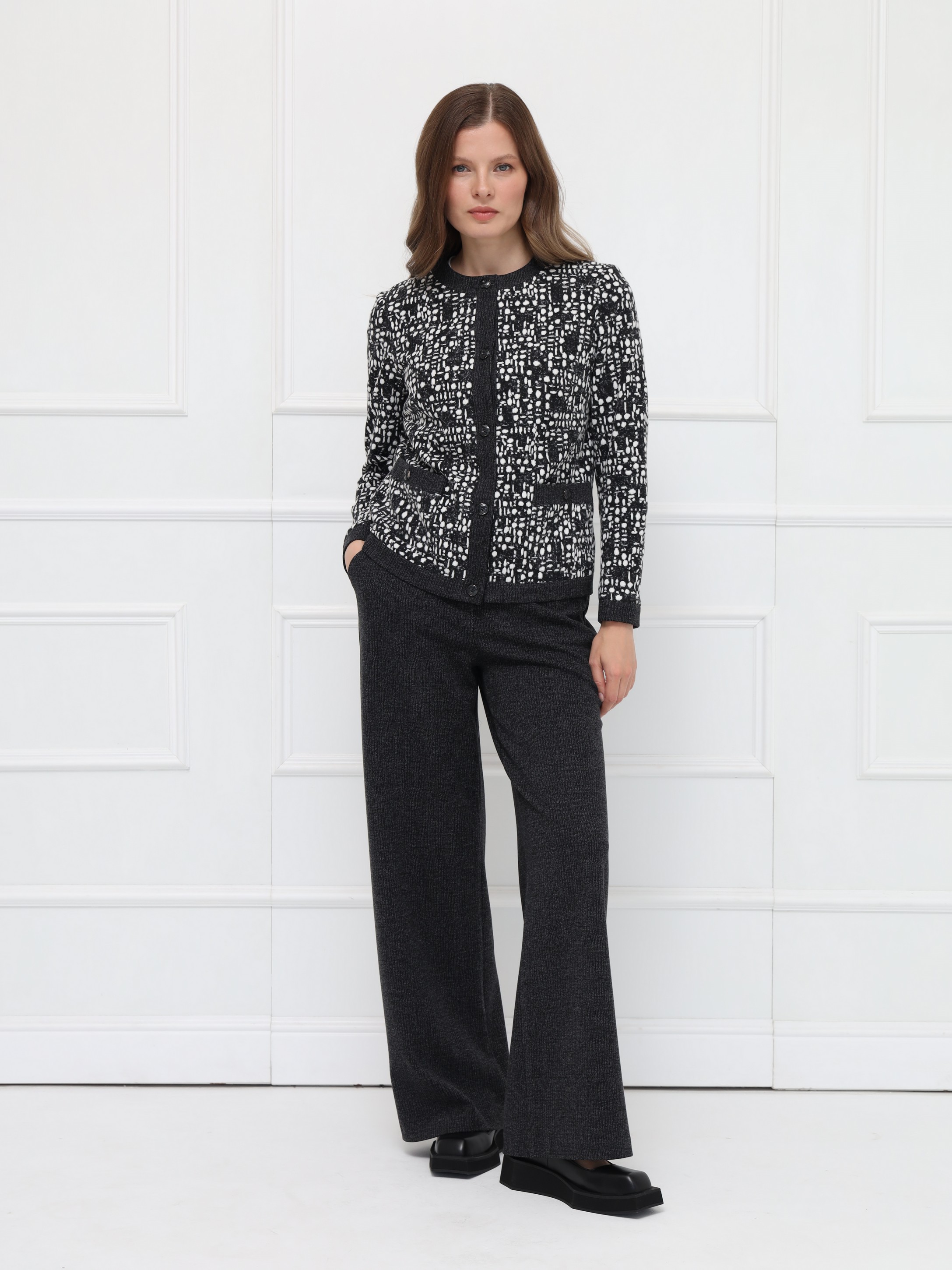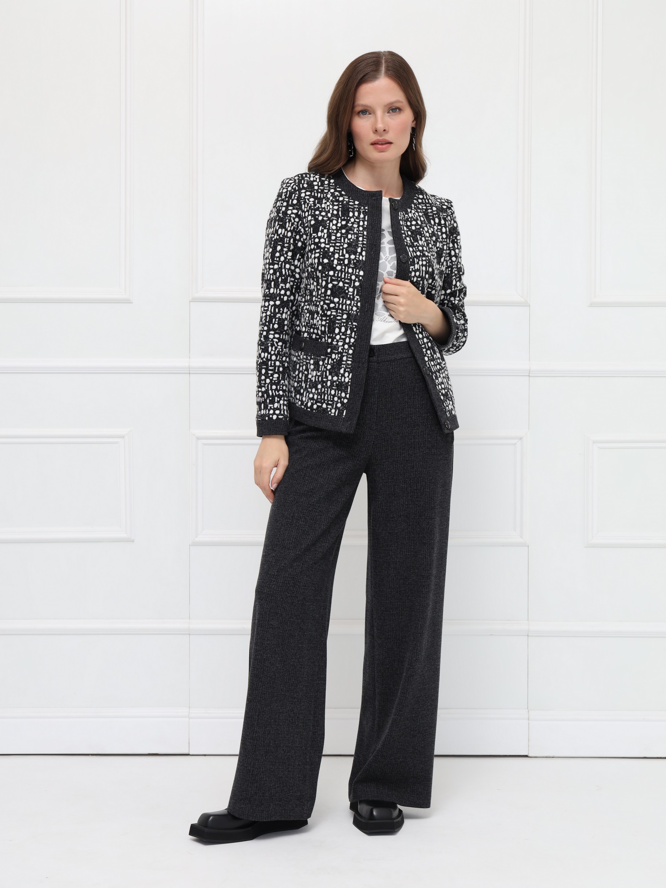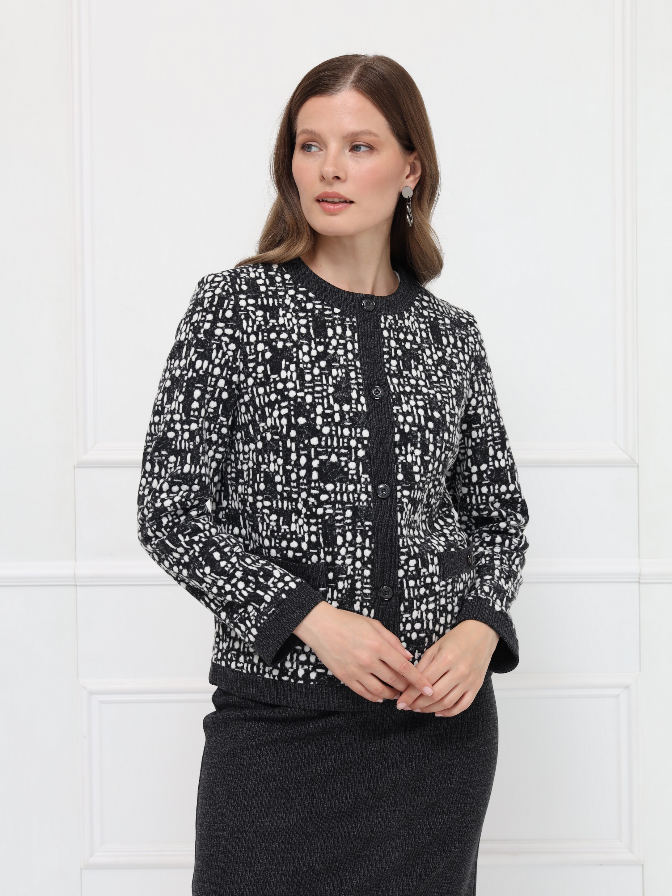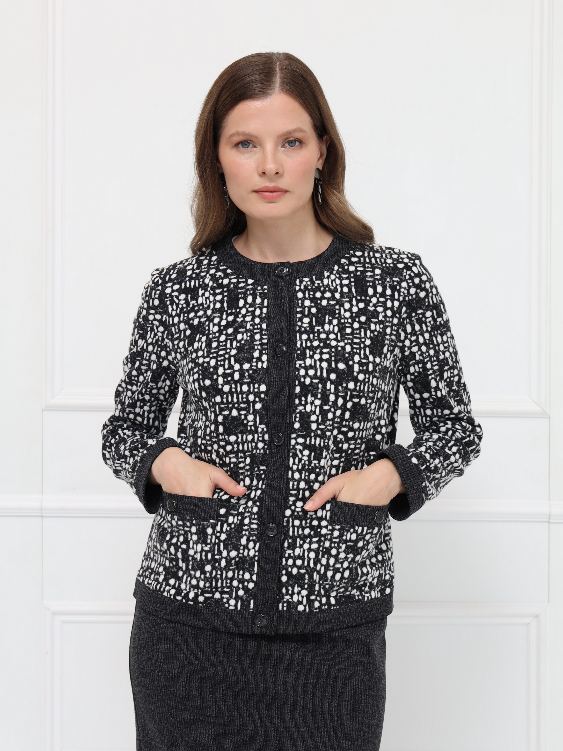 Лёгкий, уютный и элегантный жакет в бело-серой гамме - отличная альтернатива классическим пиджакам в зимний сезон. Модель прямого силуэта, без воротника, напоминает кардиган, но благодаря изящной застёжке на пуговицы от горловины до низа выглядит более структурировано. Накладные карманы добавляют практичности, а однотонная отделка по горловине, бортам и низу придают аккуратность и завершённость. Жакет выполнен из мягкого трикотажа, он сохраняет тепло, не утяжеляя образ. Частичная подкладка (только на полочке) обеспечивает комфорт и свободу движений.
