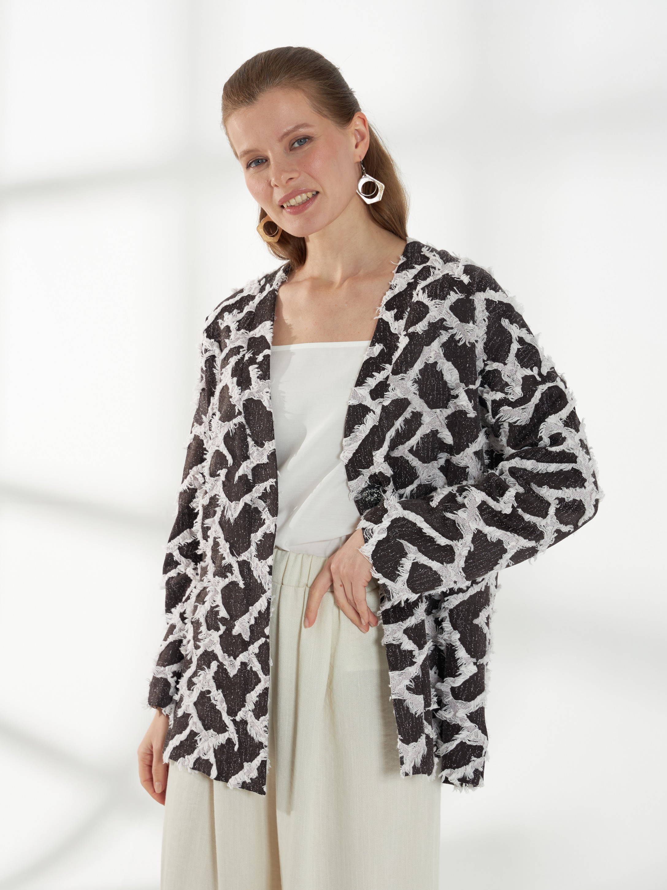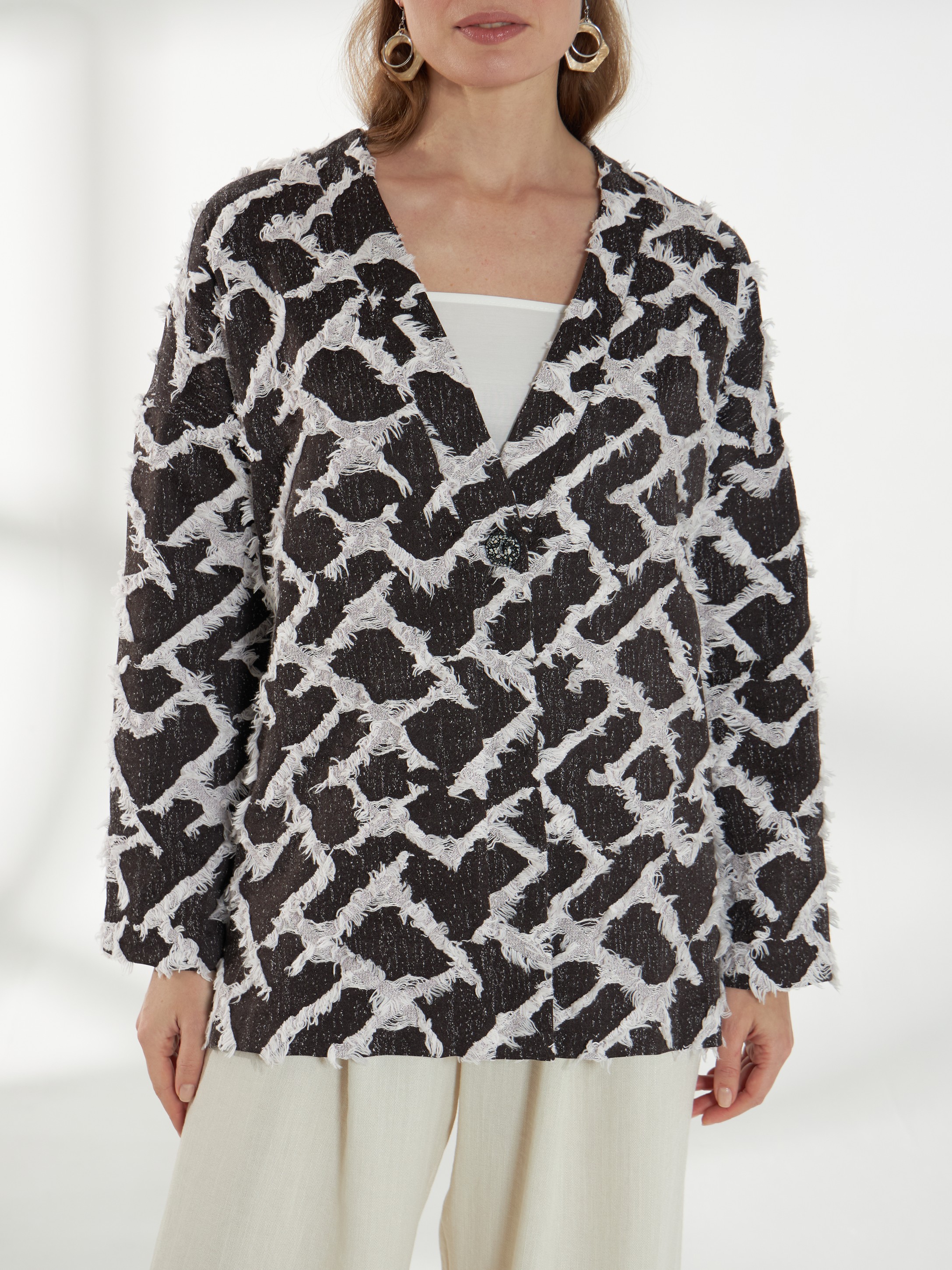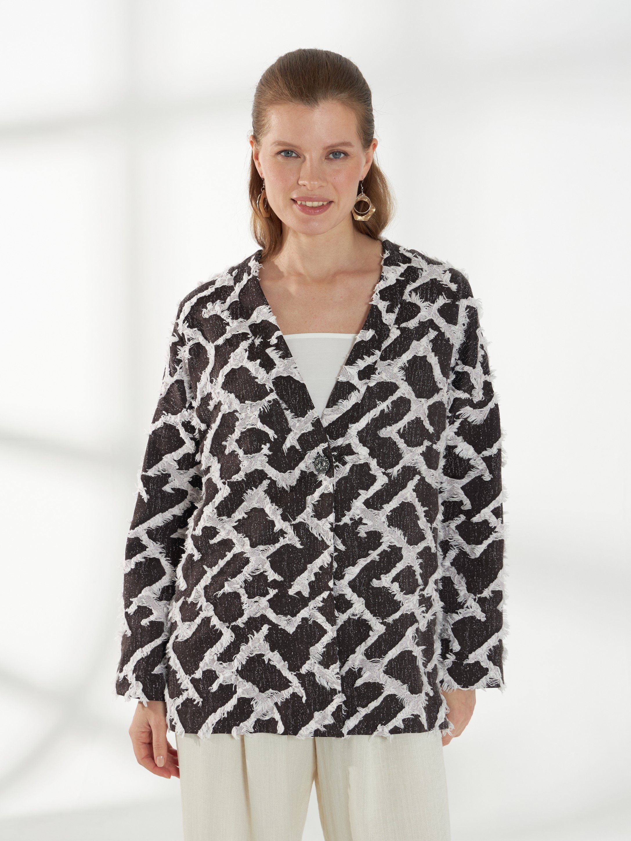 Жакет без подкладки, из хлопковой ткани с бахромой, в коричневом оттенке, выглядит современно благодаря актуальной фактуре и свободному силуэту. Спущенная линия плеча, V-образный вырез и боковые разрезы подчеркивают расслабленную элегантность модели. Застежка на одну пуговицу.