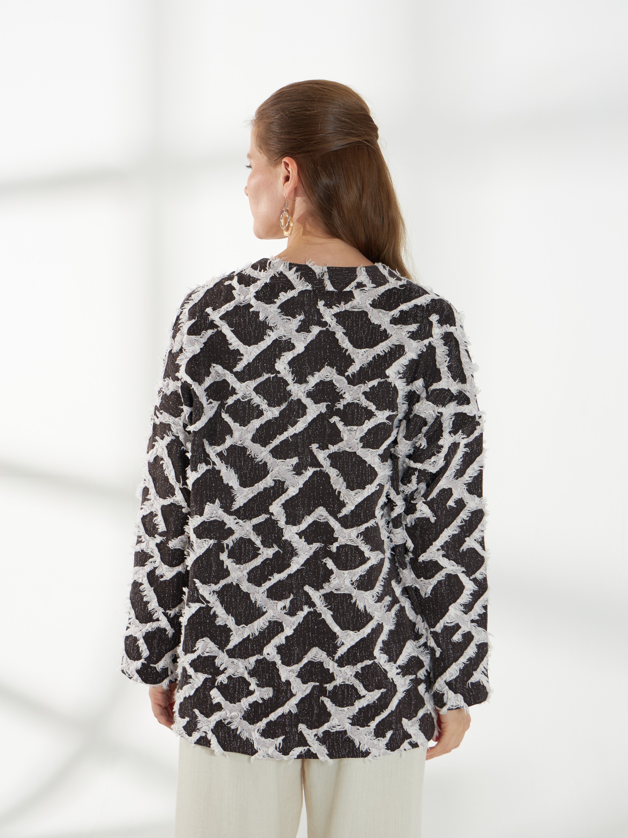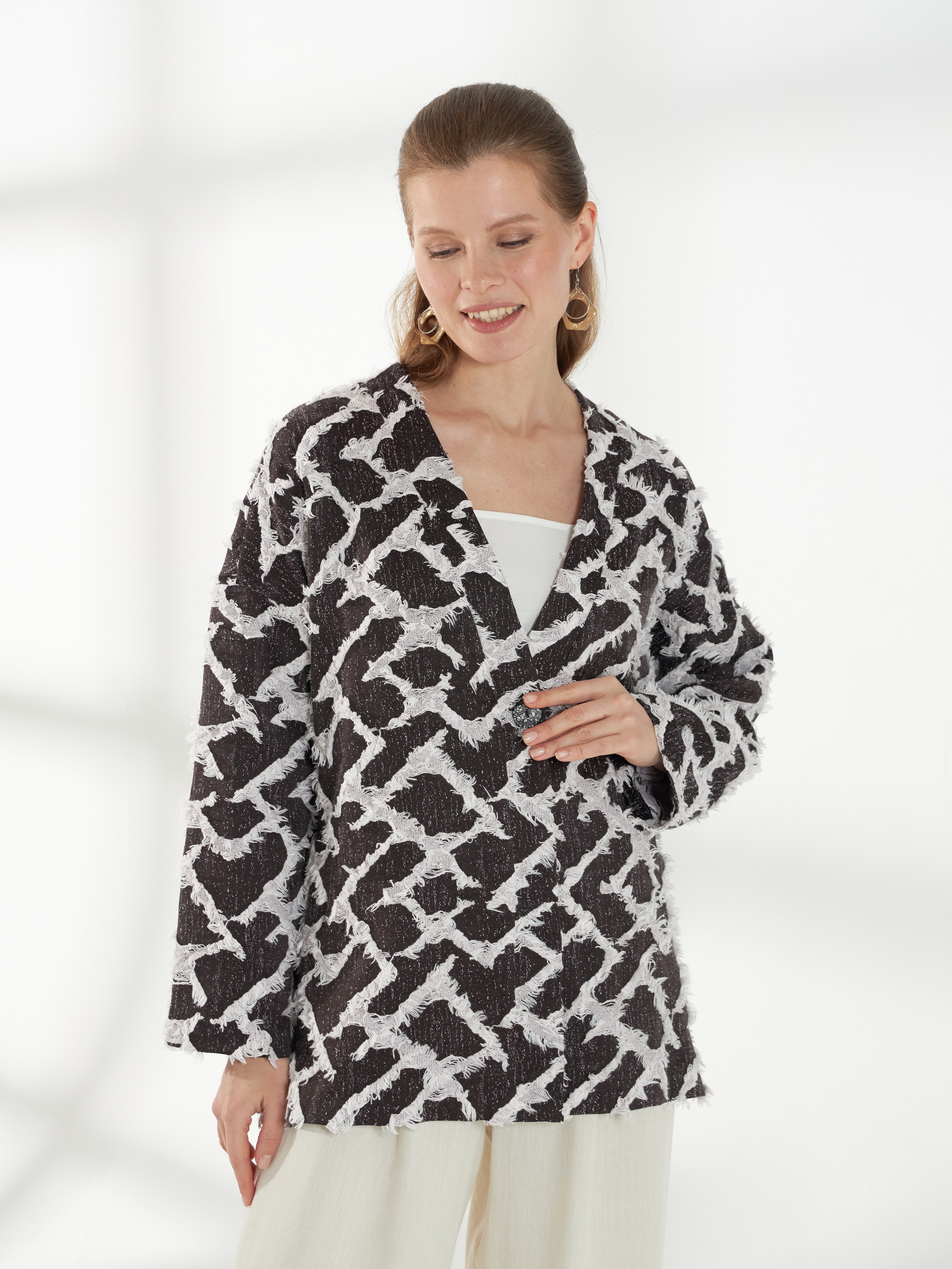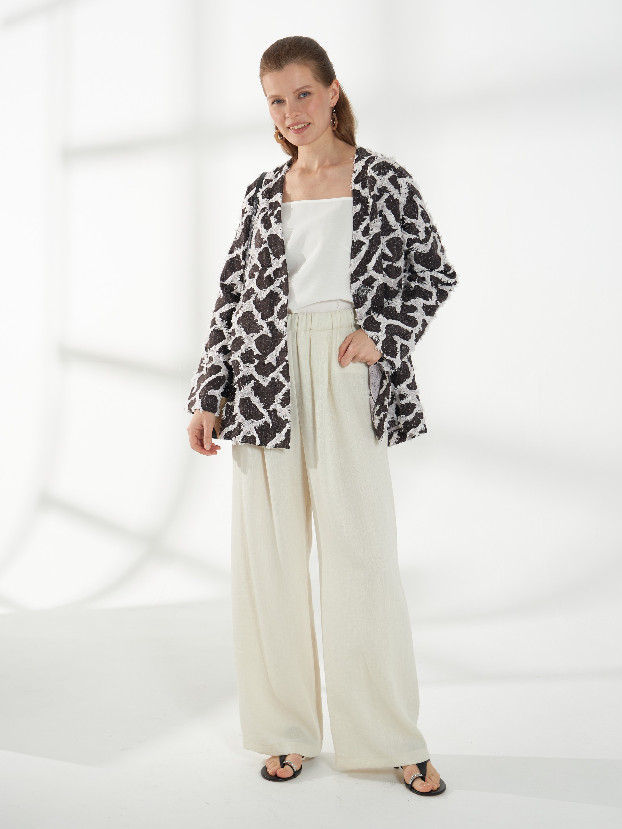 Жакет без подкладки, из хлопковой ткани с бахромой, в коричневом оттенке, выглядит современно благодаря актуальной фактуре и свободному силуэту. Спущенная линия плеча, V-образный вырез и боковые разрезы подчеркивают расслабленную элегантность модели. Застежка на одну пуговицу.