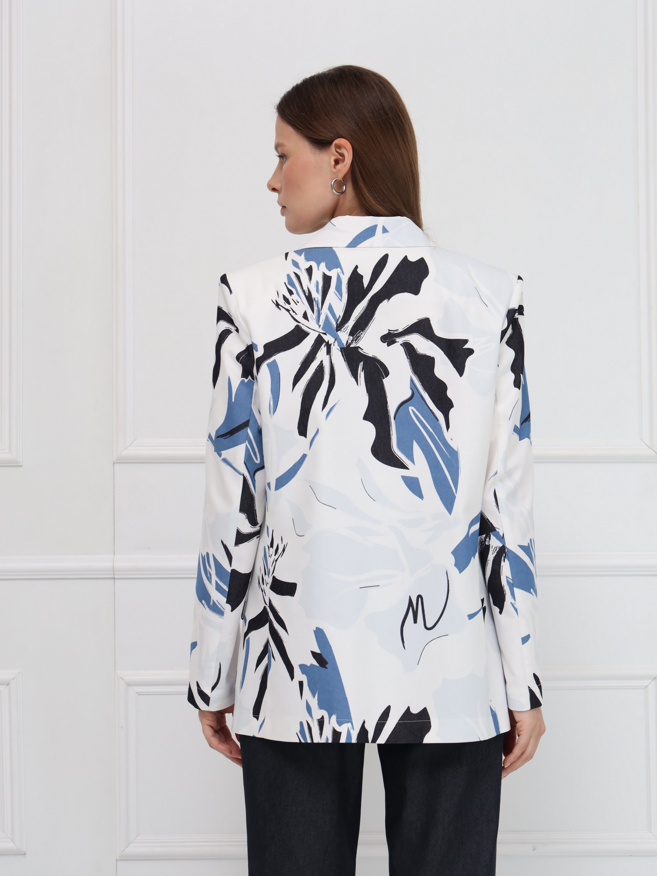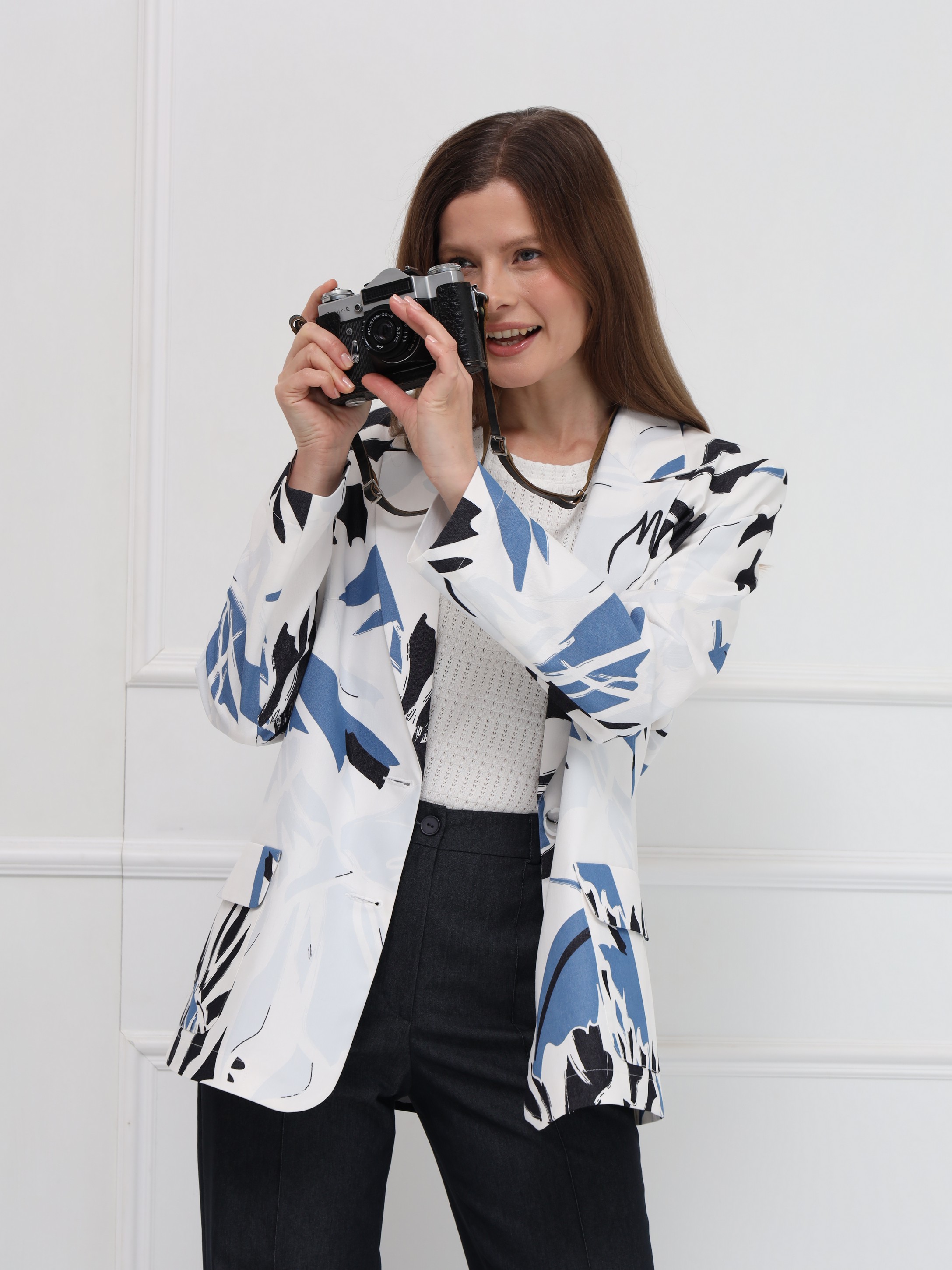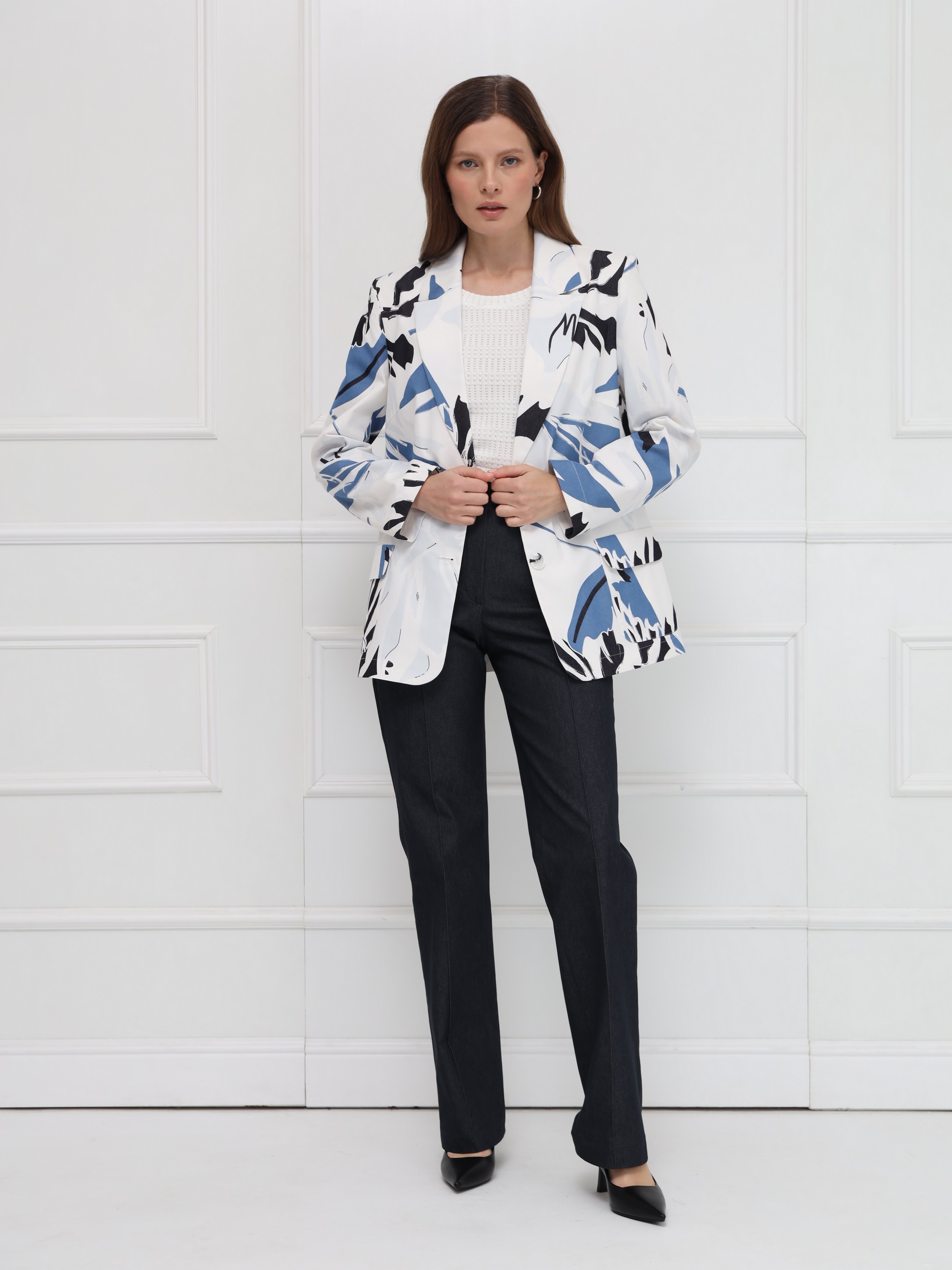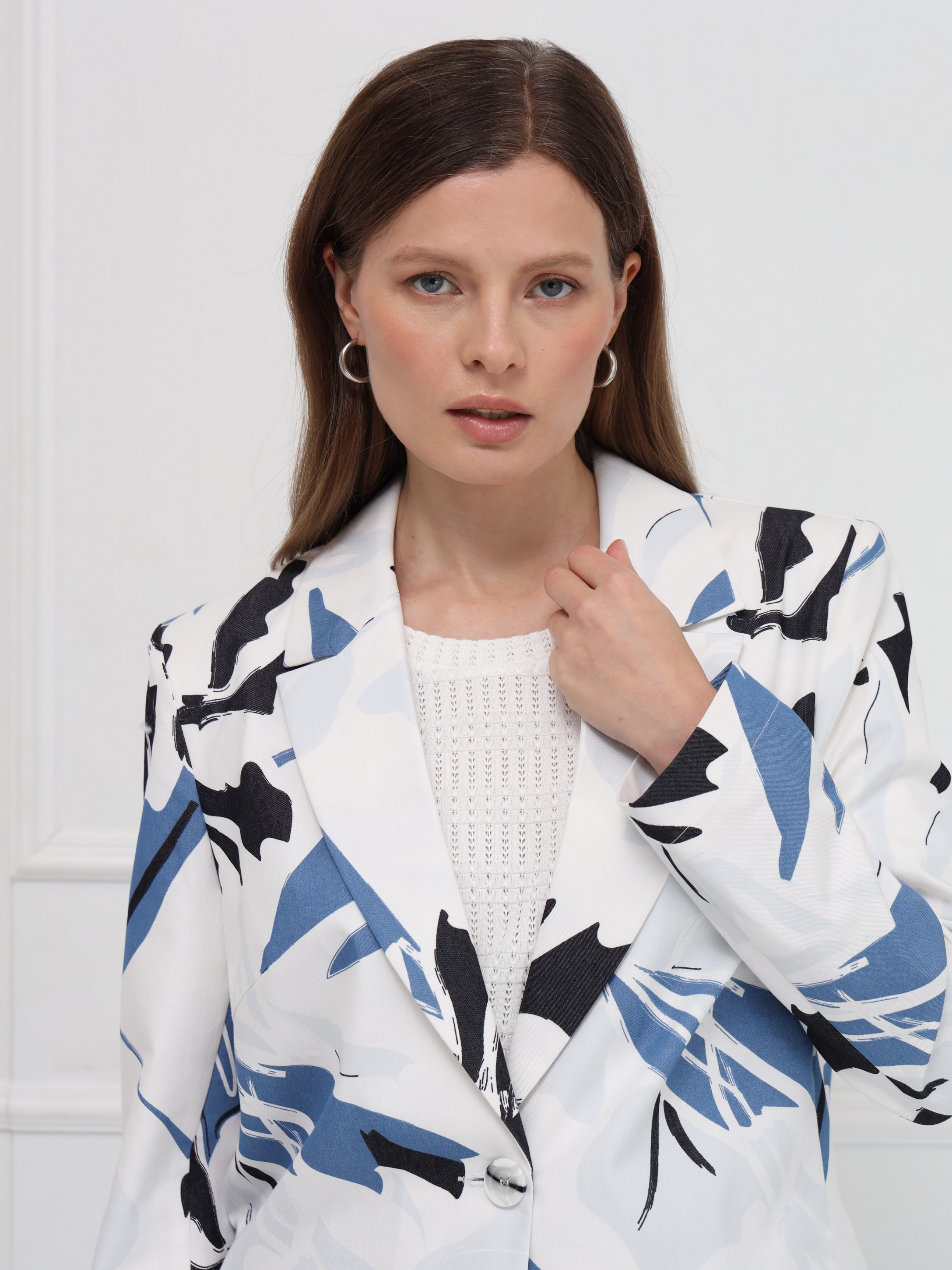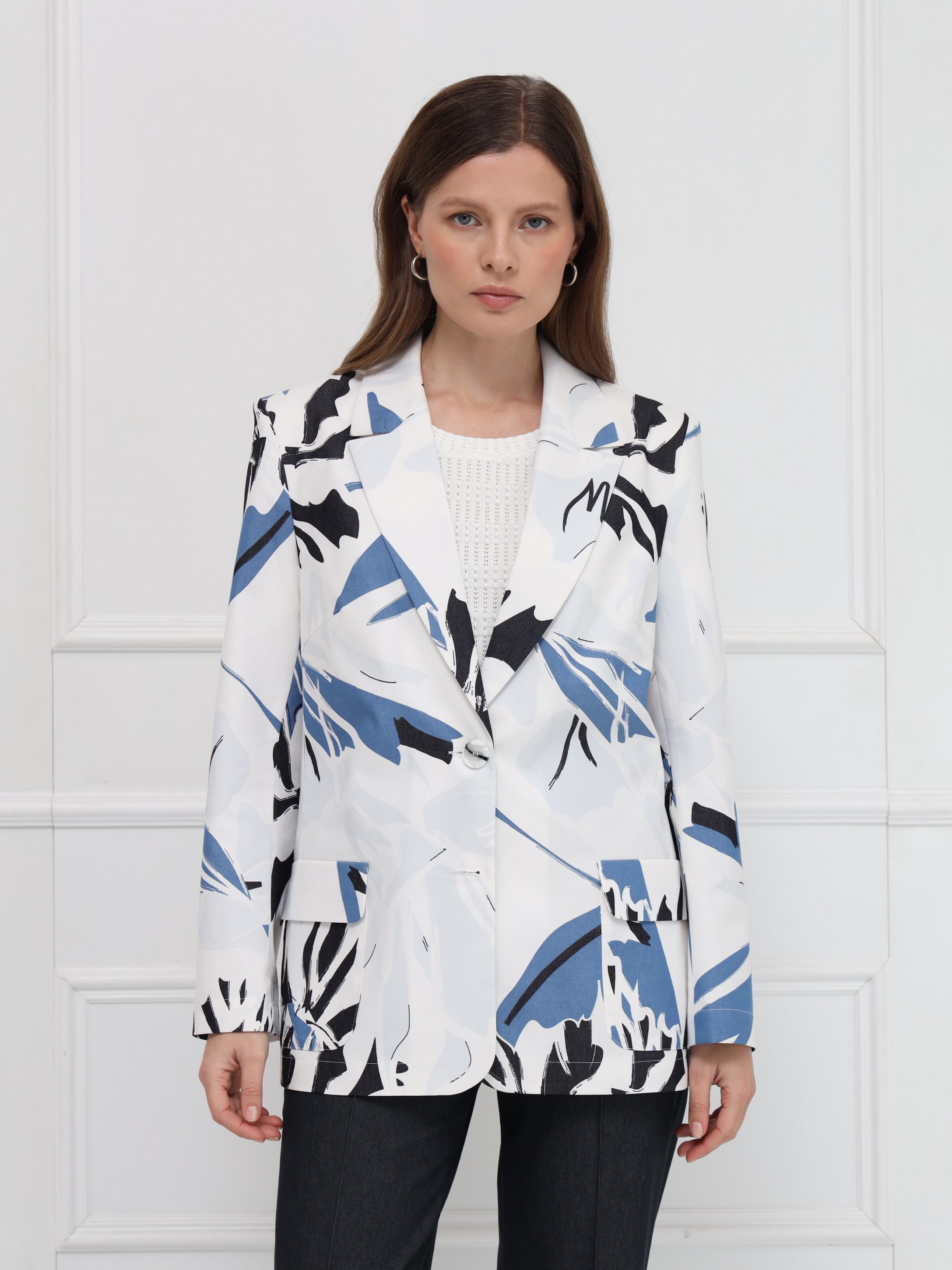 Яркий хлопковый жакет с абстрактным разноцветным принтом станет эффектным акцентом вашего гардероба. Лёгкая модель без подкладки обеспечивает комфорт и свободу движений, а прямой силуэт и аккуратная линия плеч создают современный, структурированный образ. Узкие лацканы добавляют изящества, накладные карманы с клапанами делают жакет практичным, а застёжка на две пуговицы подчёркивает классический характер. Идеален для повседневных и городских образов - легко сочетается с джинсами, брюками и однотонными платьями.