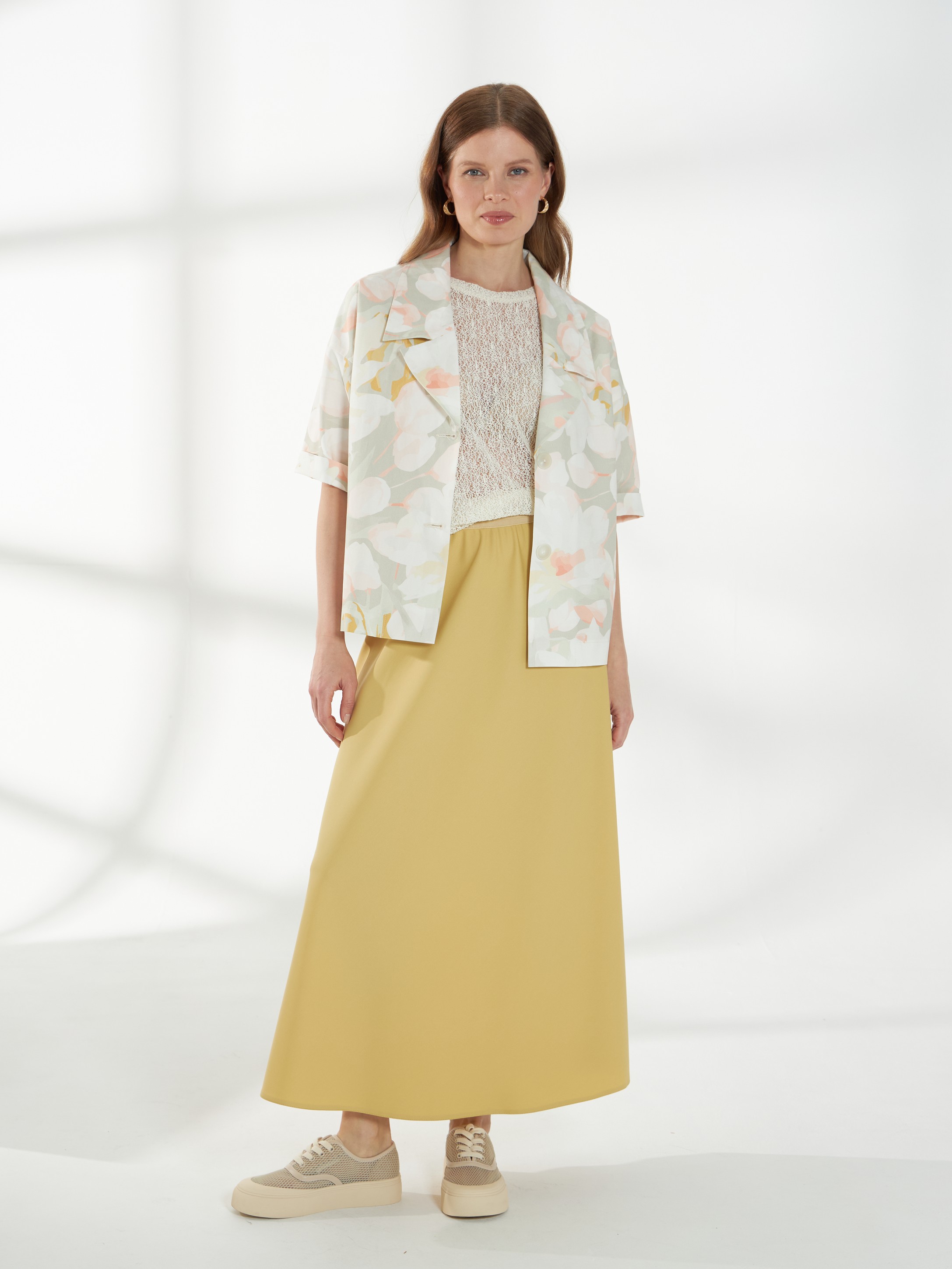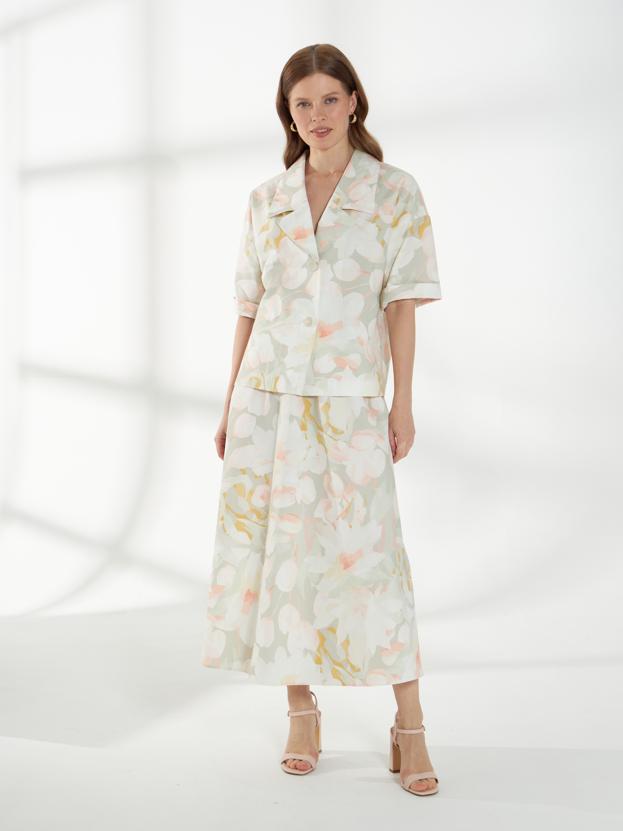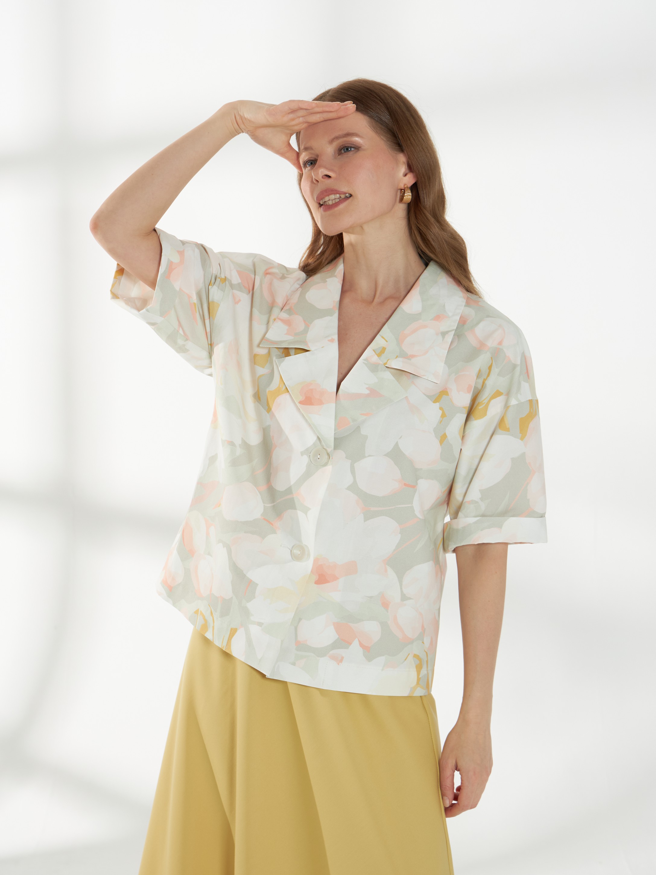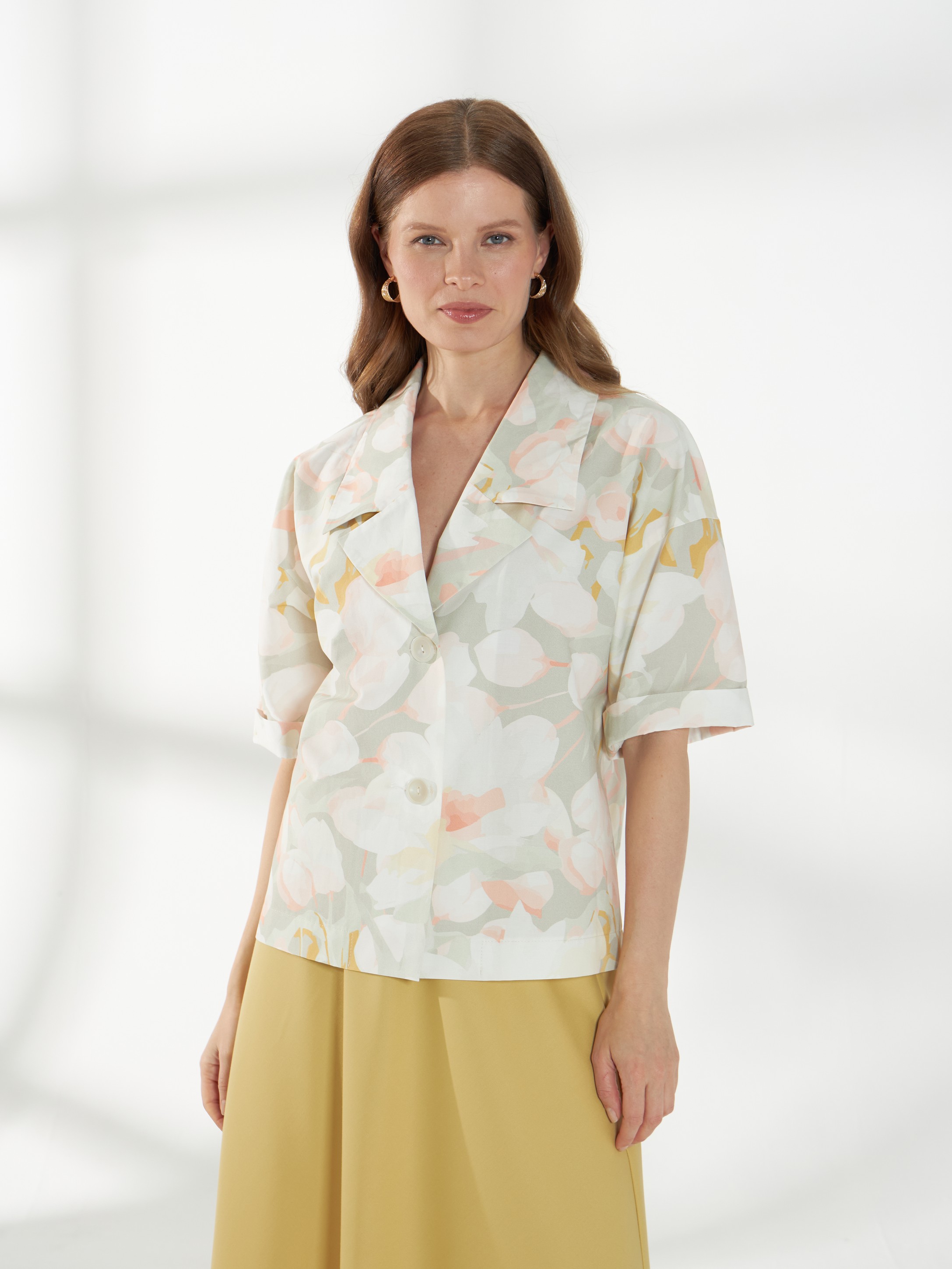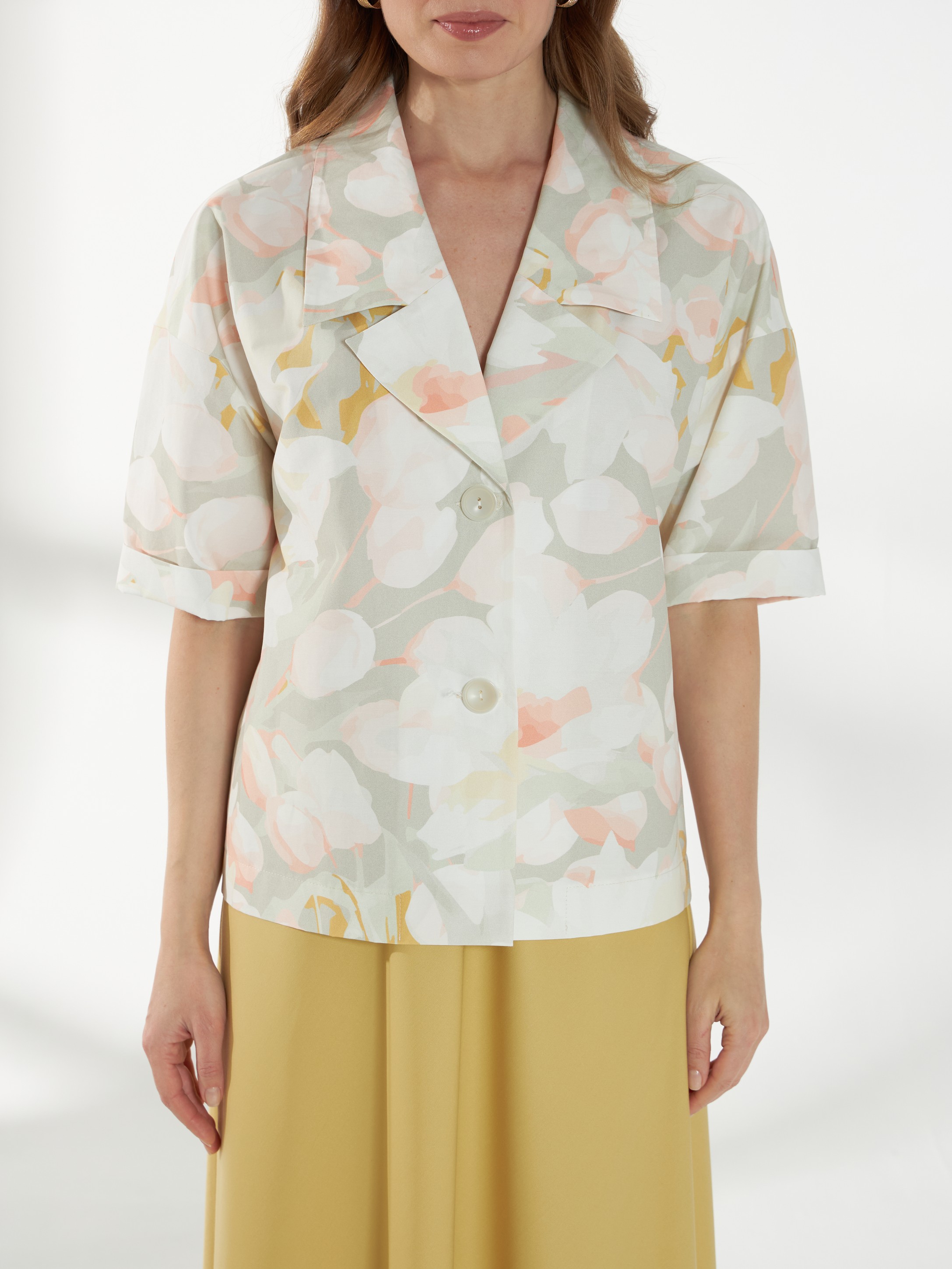 Прямой жакет-блейзер из хлопка, с мягким размытым цветочным принтом. Модель со спущенной линией плеча и короткими рукавами создаёт лёгкий и непринуждённый силуэт. Английский воротник с широкими лацканами и застежка на две пуговицы придают жакету аккуратность и современный стиль, делая его универсальной деталью гардероба.