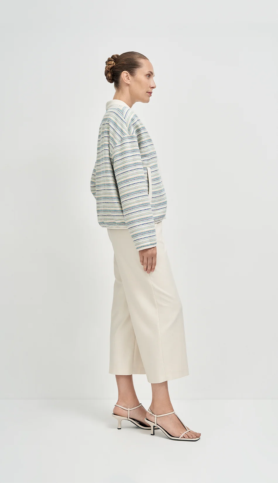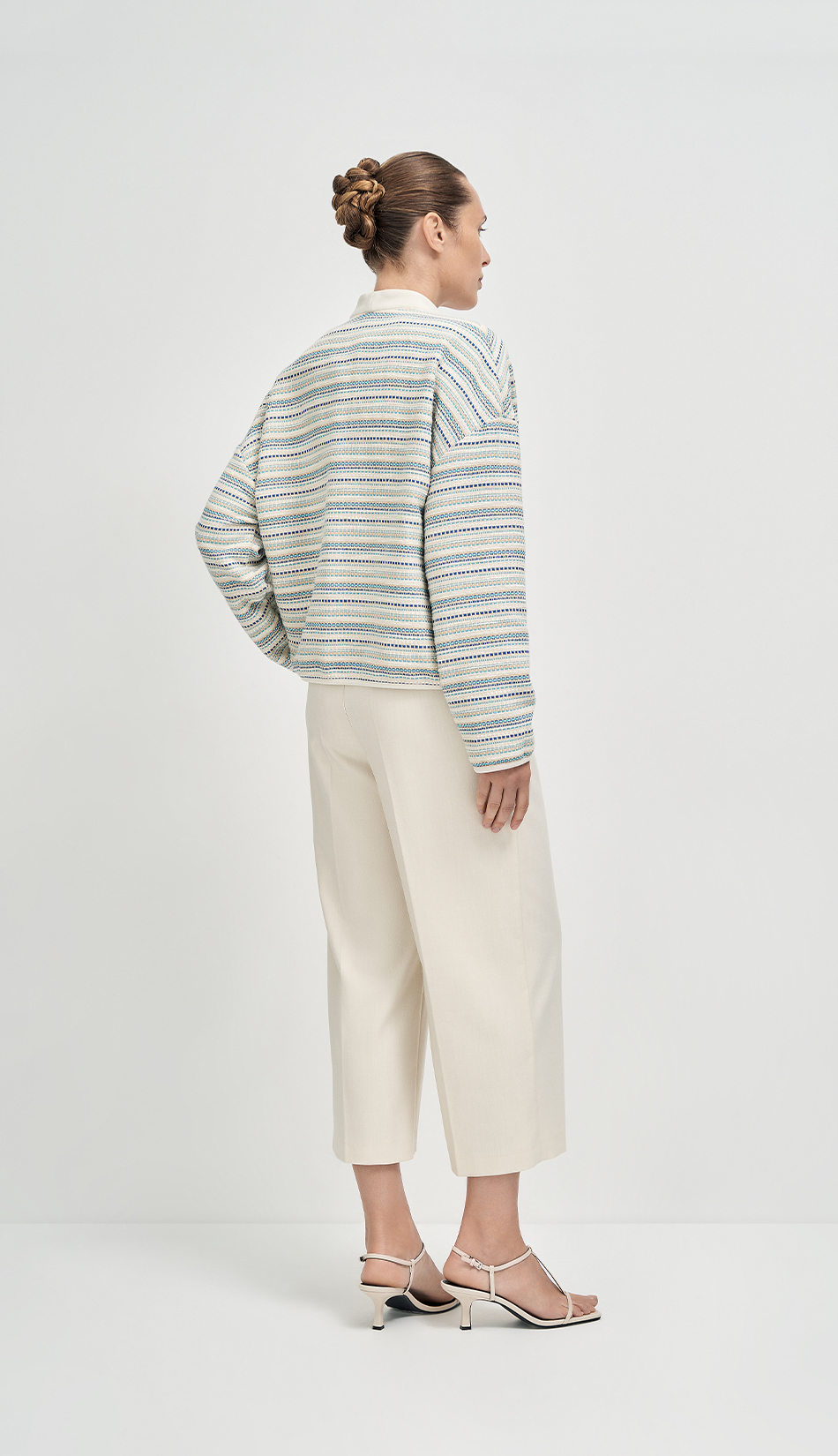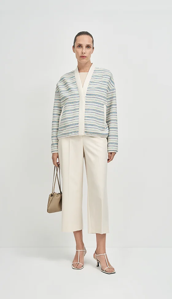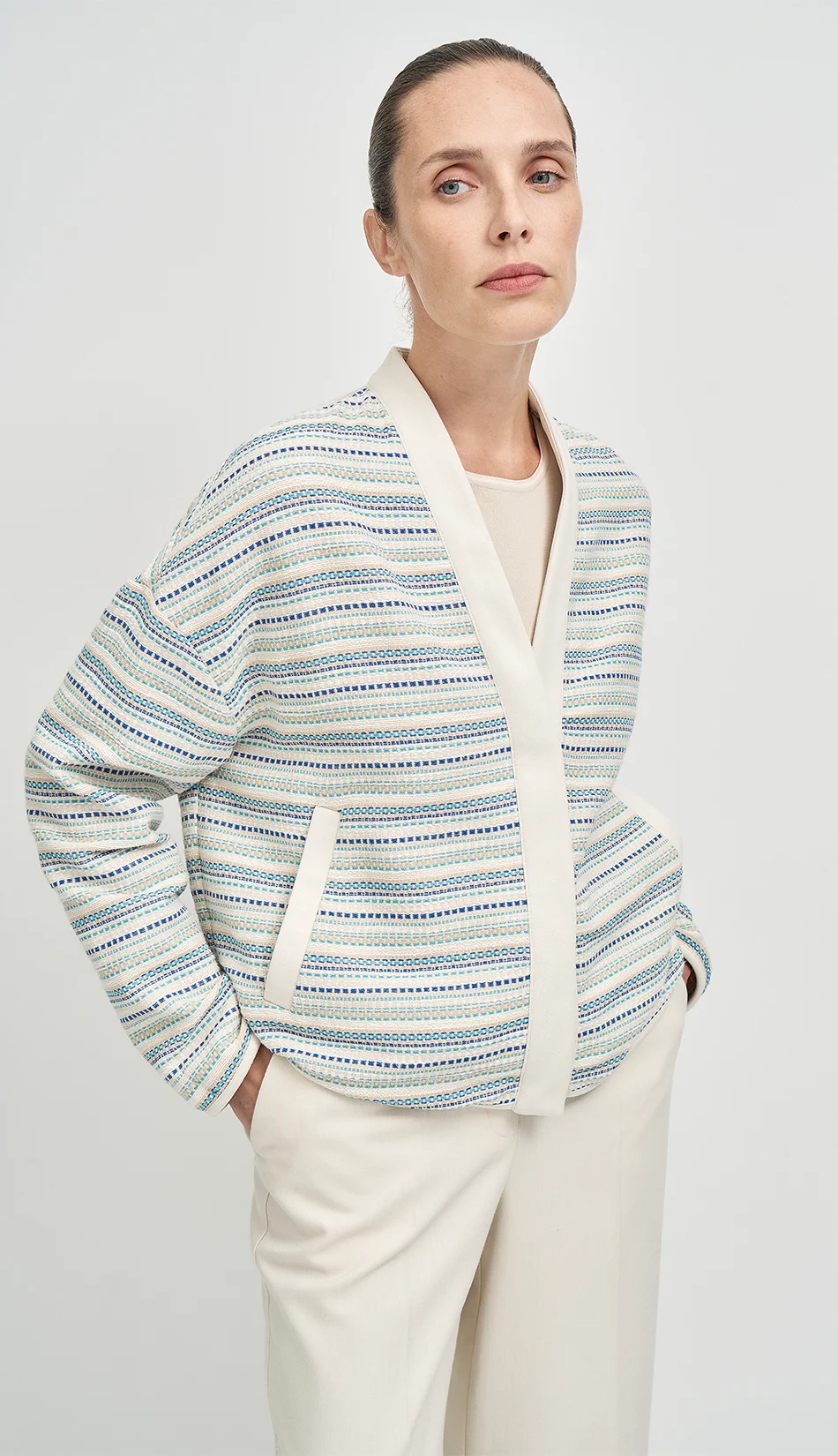Жакет выполнен из итальянской ткани с фактурным переплетением. Прямой силуэт дополнен мягкой отделкой. Планка, ворот и низ рукава обработаны матовой замшей, которая создает красивый контраст с текстурой основной ткани. Благодаря сочетанию материалов жакет выглядит одновременно структурно и мягко, легко вписывается в многослойные образы и работает как акцентная вещь.