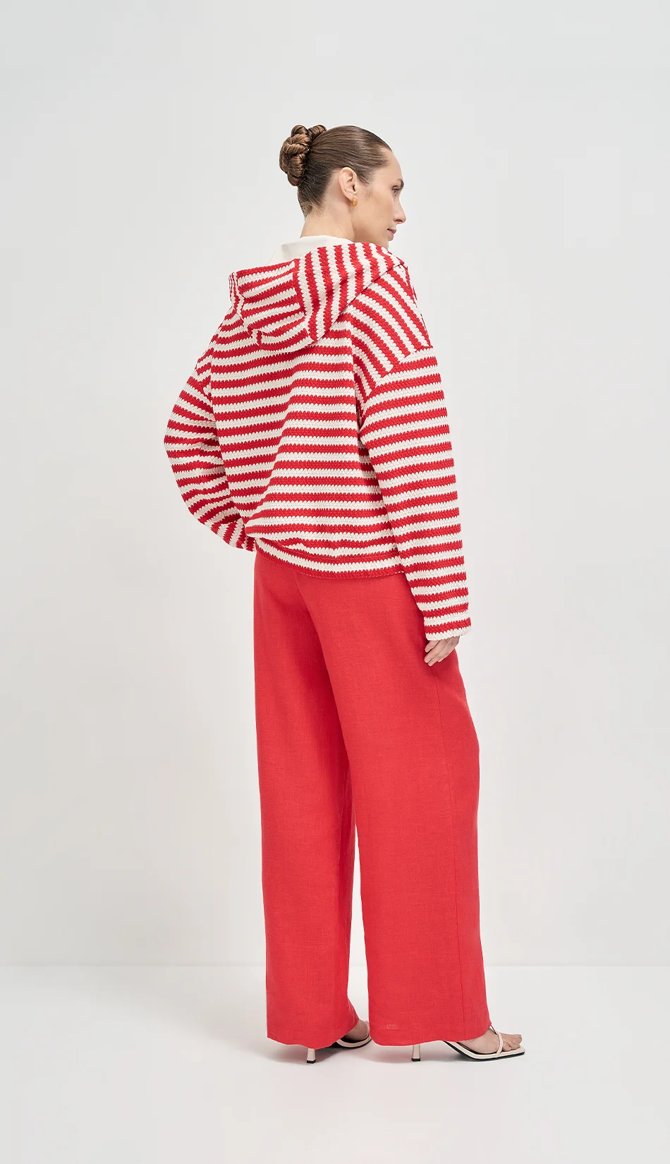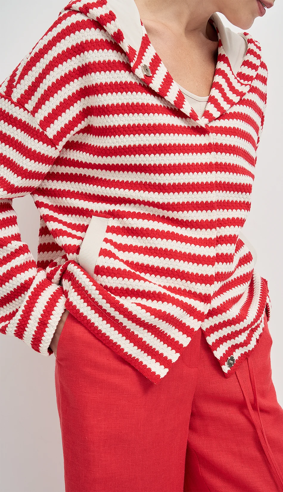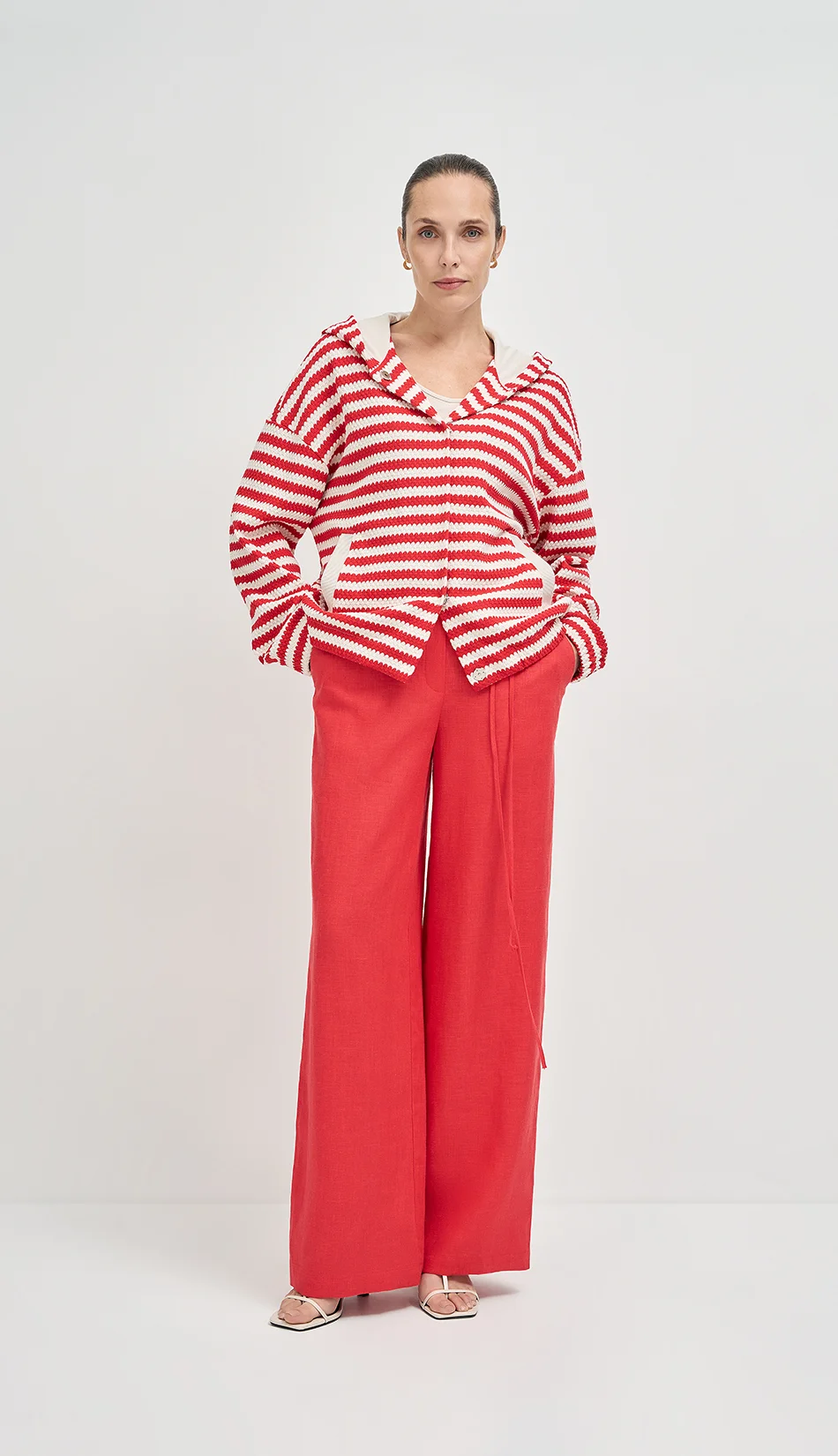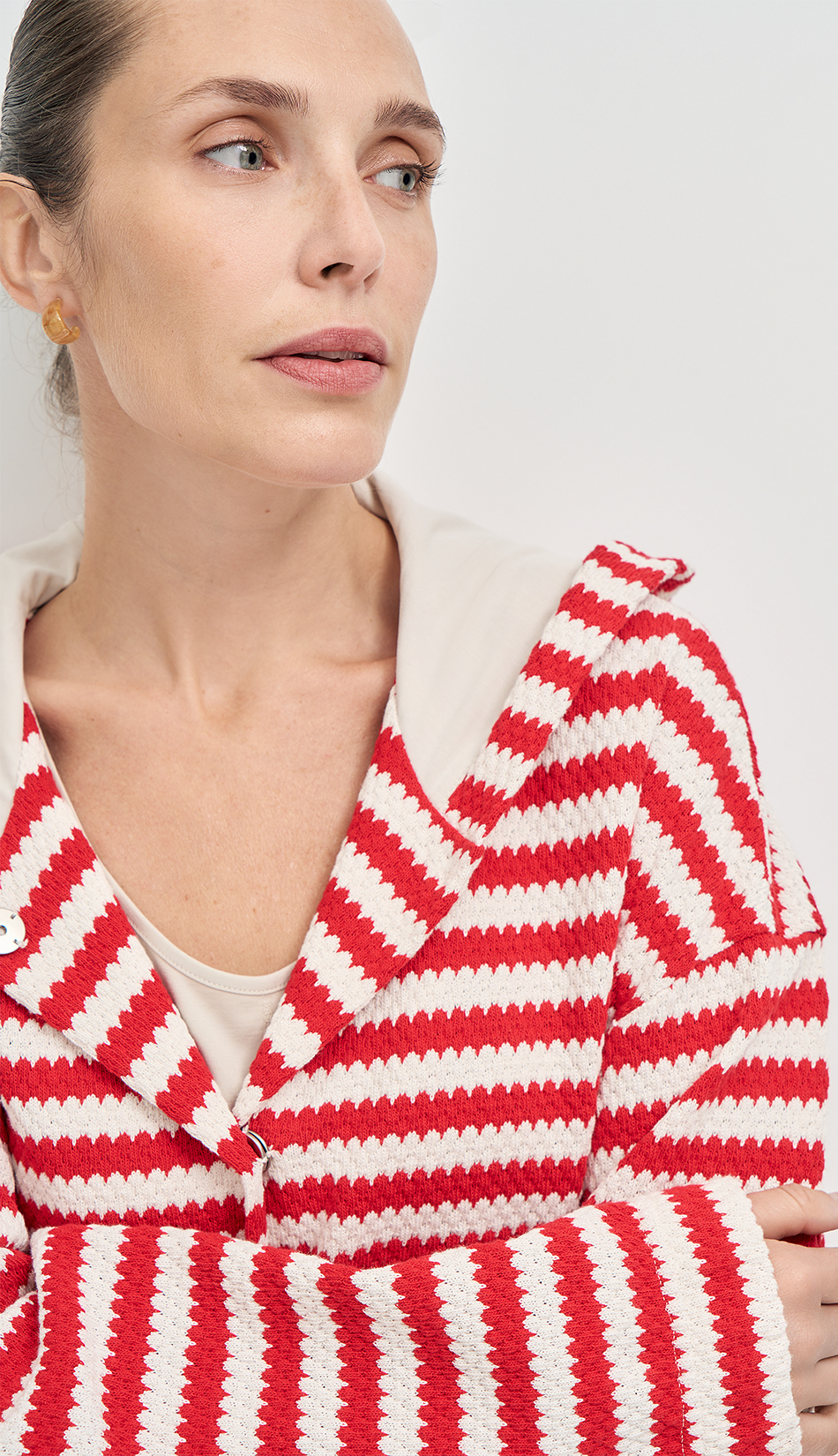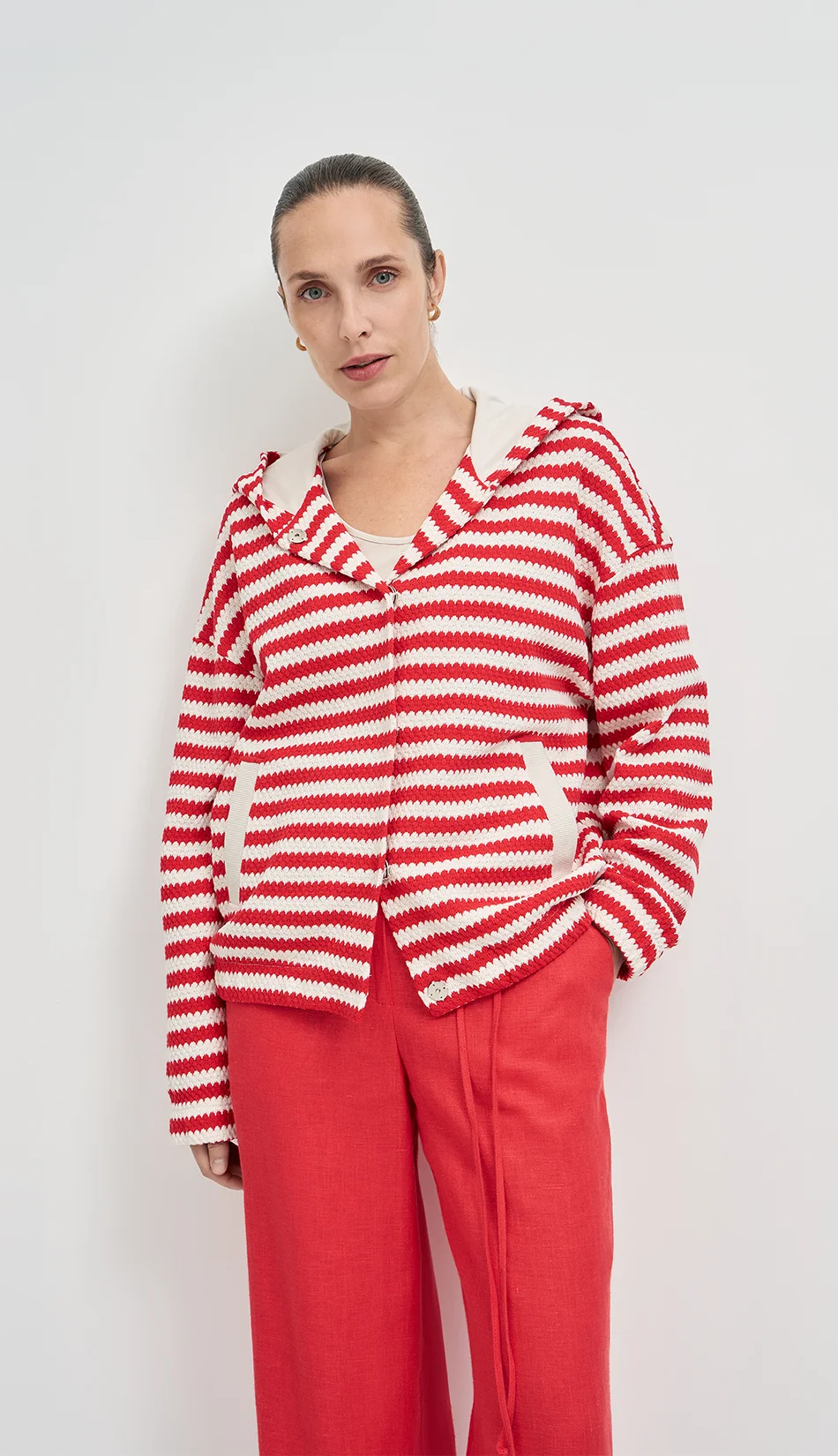 Объемный жакет прямого силуэта с капюшоном из итальянского трикотажного полотна с фактурной выработкой с застежкой на пришивные кнопки создает возможности для составления образов, как в спортивном стиле, так и в городском стиле спорт-шик.