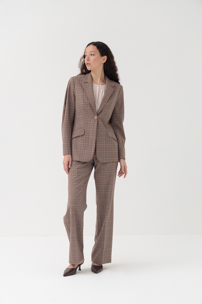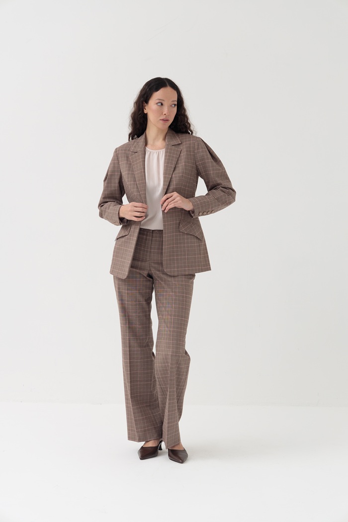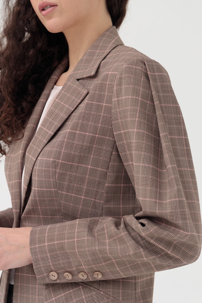 Модные в этом сезоне ретро-мотивы нашли современное воплощение в женственном образе на каждый день. Представляем изящный, приталенный жакет из тонкой костюмной ткани в клетку. Акцентной деталью являются складки на рукавах, придающие свободу движения и интересный модный силуэт.
