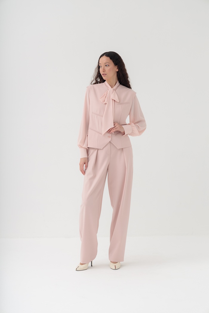 Прямой жилет нежно-розового цвета добавит образам графичности и четкости благодаря карманам на полочках, расположенных на разных уровнях. По спинке объем по талии можно регулировать хлястиком. Жилет может стать частью костюма с брюками из коллекции Розате.