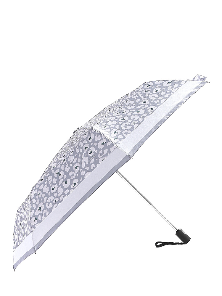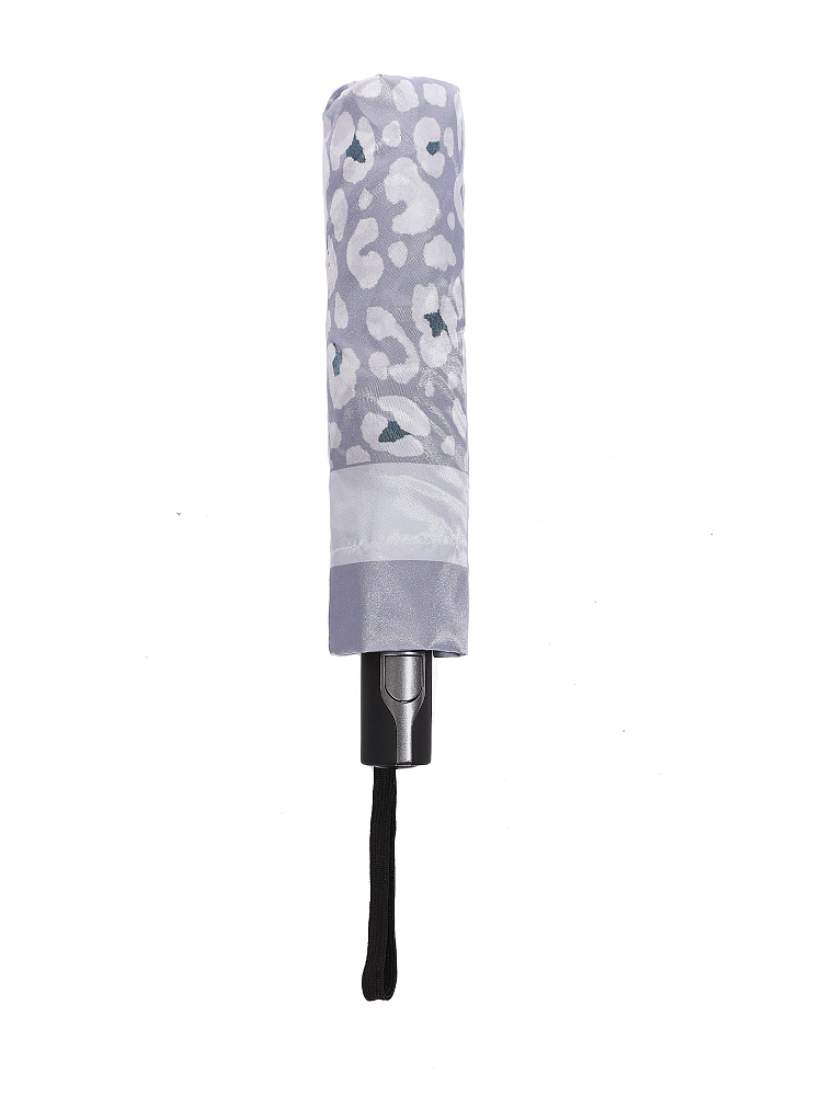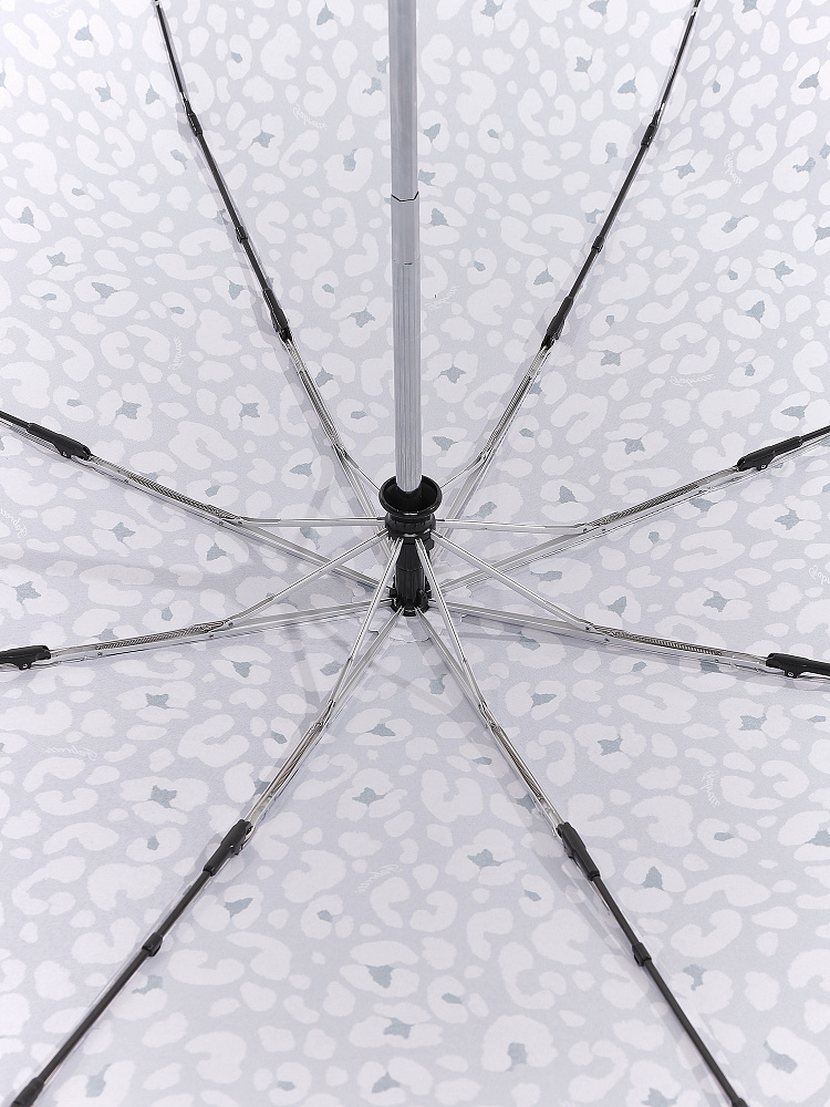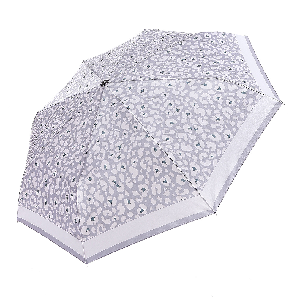 Зонт-автомат тройного сложения итальянского бренда FABRETTI с куполом серого цвета, украшенным абстрактным принтом, напоминающим леопардовый узор. Купол выполнен из гладкого искусственного сатина с шелковистой фактурой и мягким блеском.Облегченная конструкция зонта изготовлена из алюминия; эргономичная ручка - из пластика с покрытием soft touch.Аксессуар открывается и закрывается одним нажатием кнопки на удобной нескользящей ручке с петлей. Комплекс пружин и звеньев спиц изготовлен из гибкого упругого углепластика и фибергласса и составляет основу системы «антиветер».Зонт дополнен удобным чехлом.