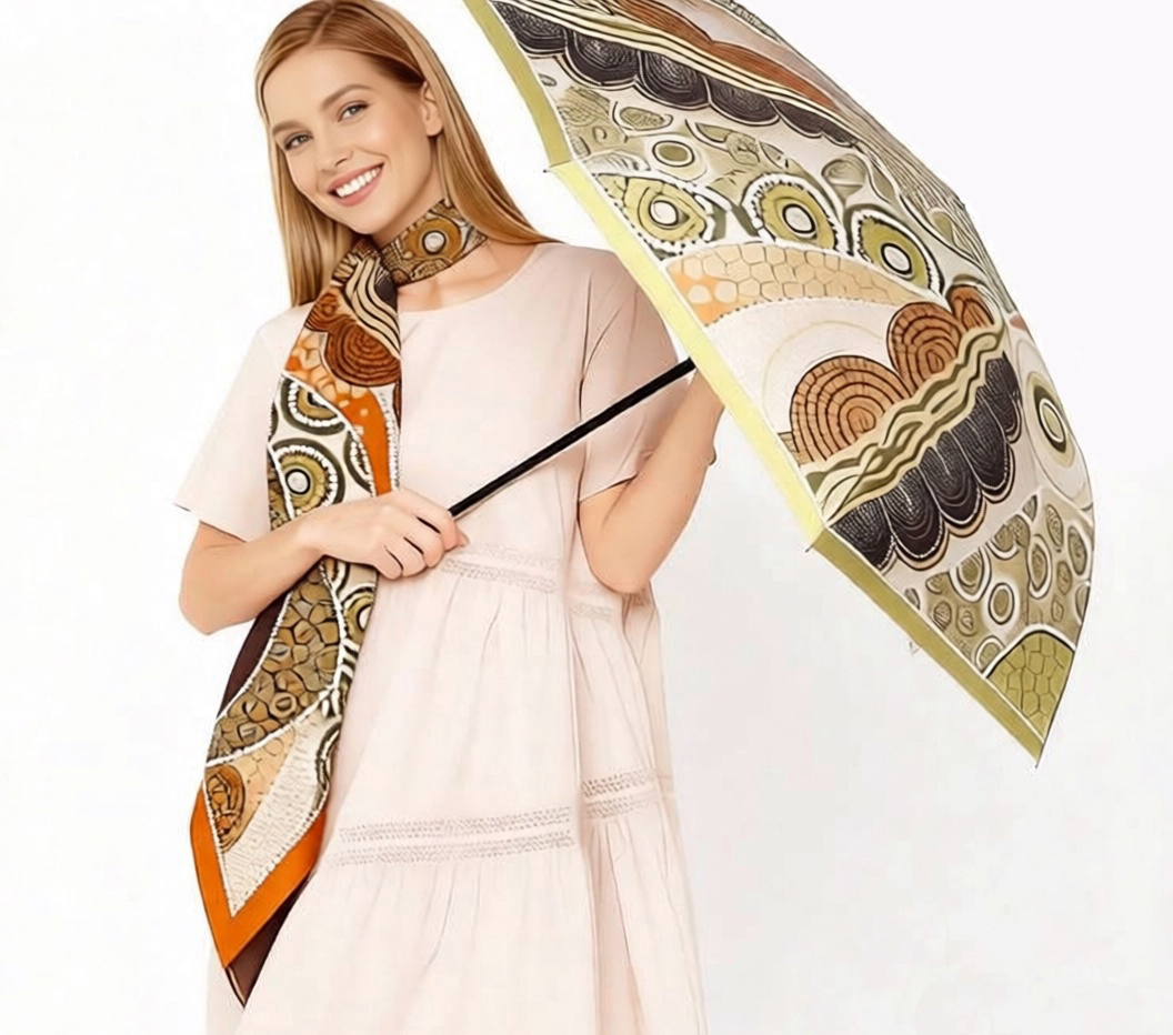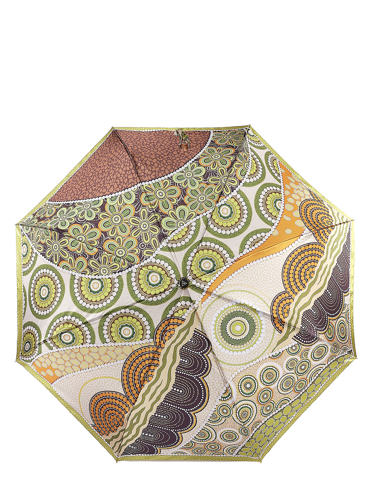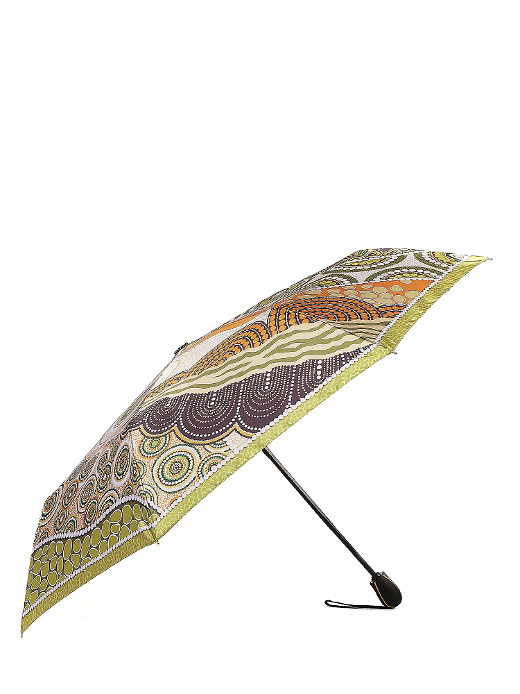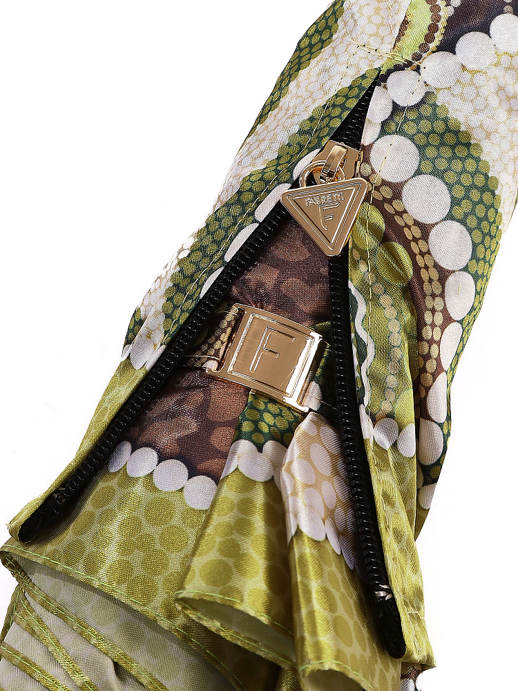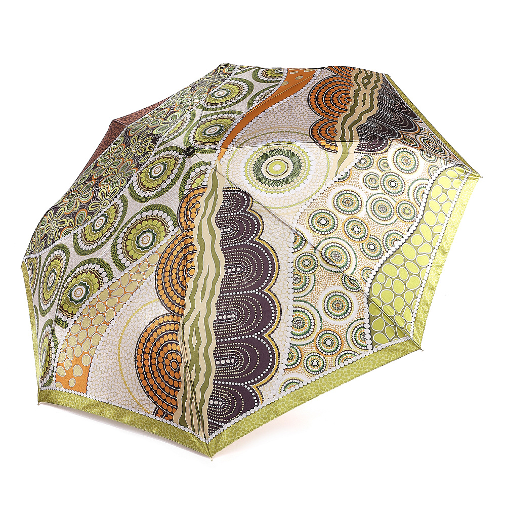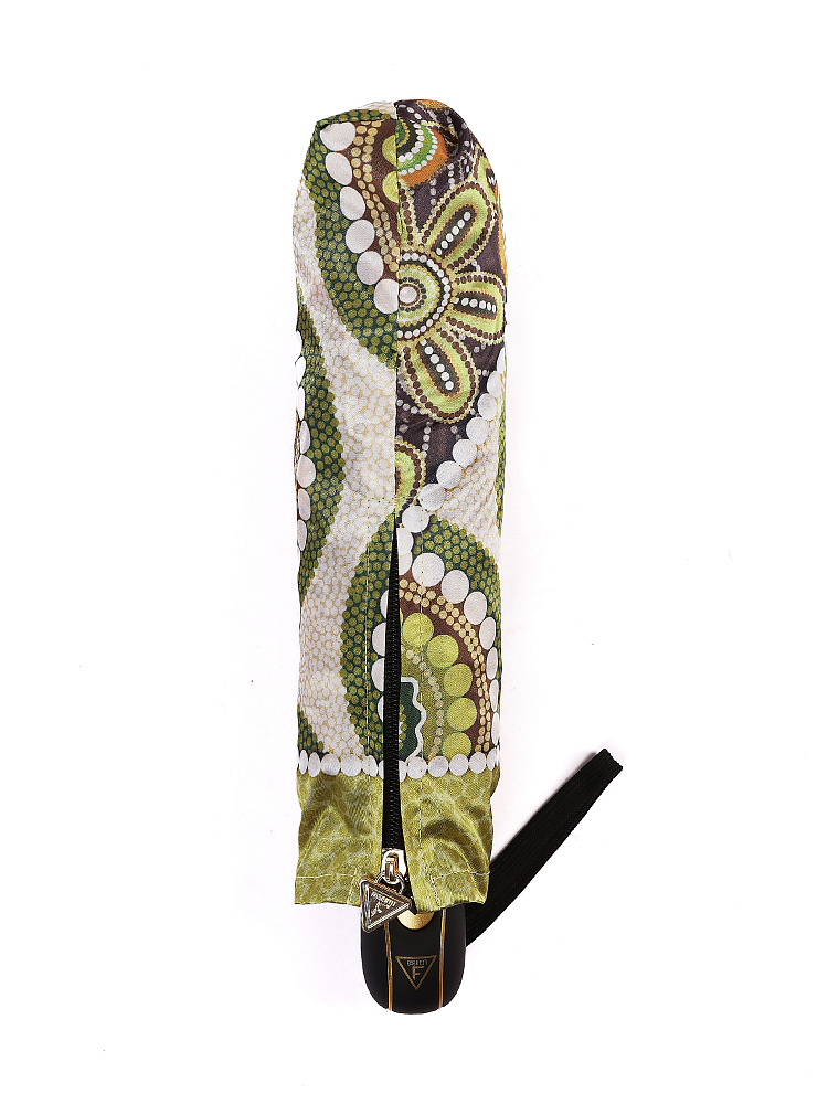 Зонт-автомат тройного сложения итальянского бренда FABRETTI с интересным абстрактным узором, сложенным из горошин разного размера, цвета и формы в натуральных зеленых, медно-коричневых и бежевых тонах. Купол выполнен из гладкого искусственного сатина с шелковистой фактурой и мягким блеском.Каркас зонта изготовлен из прочной износостойкой стали; эргономичная ручка - из пластика с покрытием soft touch.Аксессуар открывается и закрывается одним нажатием кнопки на удобной нескользящей ручке с петлей. Комплекс пружин и звеньев спиц изготовлен из гибкого упругого углепластика и фибергласса и составляет основу системы «антиветер».Зонт дополнен удобным чехлом на молнии.