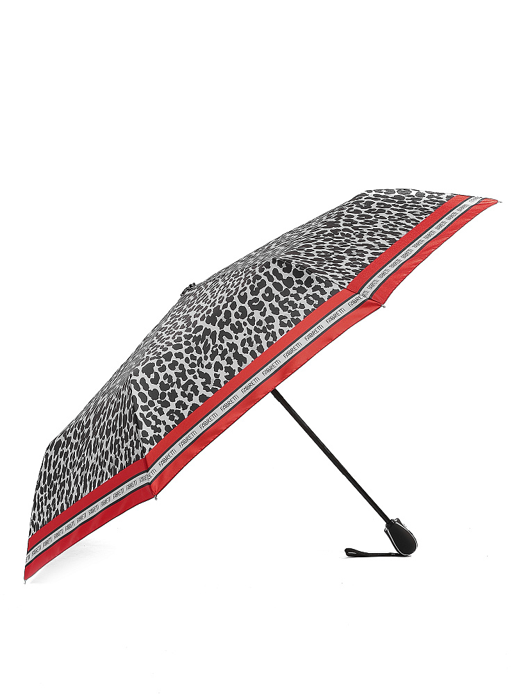 Зонт-автомат тройного сложения итальянского бренда FABRETTI украшен дерзким черно-белым леопардовым принтом с ярким красным кантом. Купол выполнен из гладкого искусственного сатина с шелковистой фактурой и мягким блеском.Каркас зонта изготовлен из прочной износостойкой стали; эргономичная ручка - из пластика с покрытием soft touch.Аксессуар открывается и закрывается одним нажатием кнопки на удобной нескользящей ручке с петлей. Комплекс пружин и звеньев спиц изготовлен из гибкого упругого углепластика и фибергласса и составляет основу системы «антиветер».Зонт дополнен удобным чехлом на молнии.