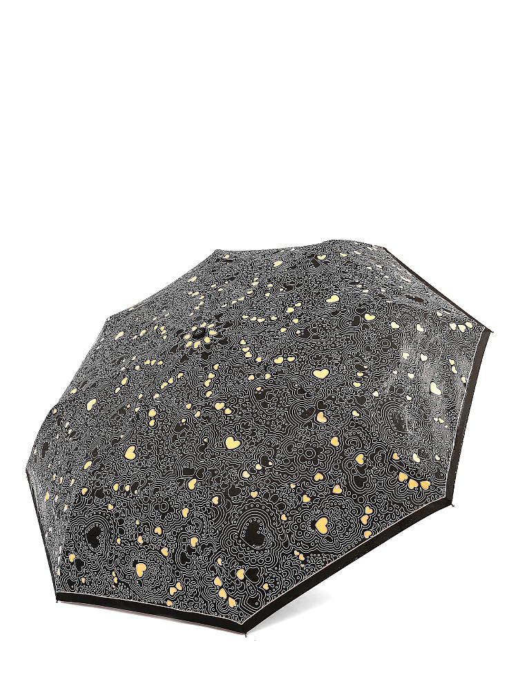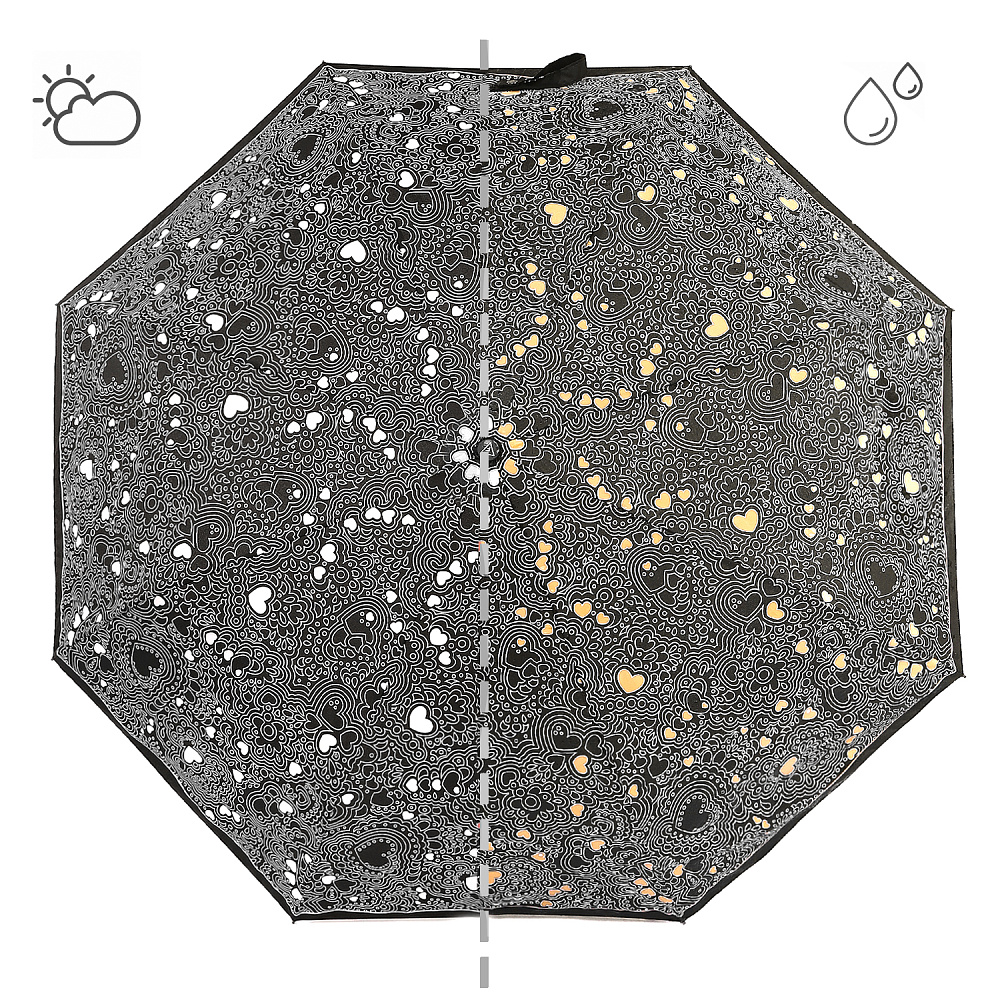 Эксклюзивный женский зонт-автомат FABRETTI с эффектом «хамелеон» не только защитит от дождя, но и поднимет настроение в непогоду. Белый рисунок на однотонном черном фоне при намокании меняет цвет – сердца становятся ярко-желтыми, а при высыхании - снова белыми.Купол выполнен из материала с матовой фактурой эпонж с водоотталкивающей пропиткой. Она придает ткани высокую прочность и устойчивость к выцветанию. Вода, попадая на такой купол, превращается в капли и легко скатываться вниз.Каркас - из стали, эргономичная ручка - из высококачественного пластика-полиуретана с противоскользящей обработкой. Комплекс пружин и звеньев спиц сделан из гибкого, упругого материала углепластика и фибергласса и составляет основу системы «антиветер», которая защищает аксессуар при порывах ветра.